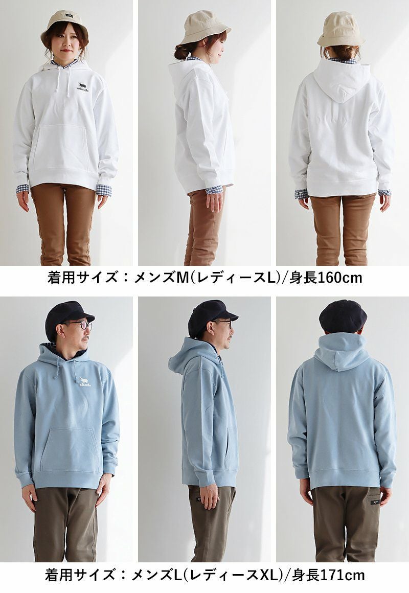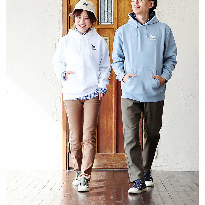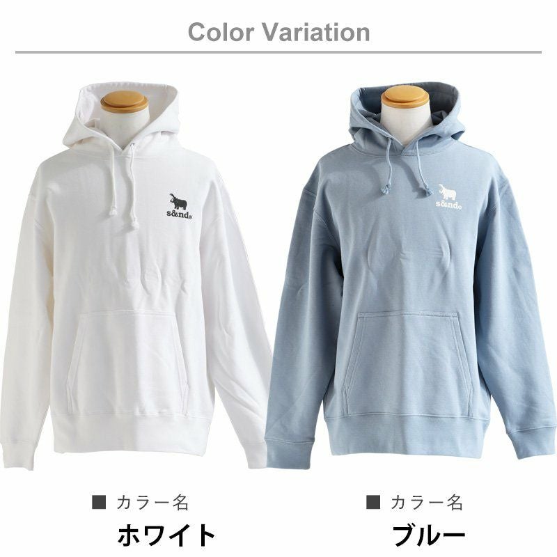 何年もお世話になりそうです。 パーカー スウェット 長袖 メンズ レディース ワンポイント プリント カバ 綿100% 裏毛 日本製 国産 ホワイト ブルー カジュアル ユニセックス PATY パティ s&nd セカンド