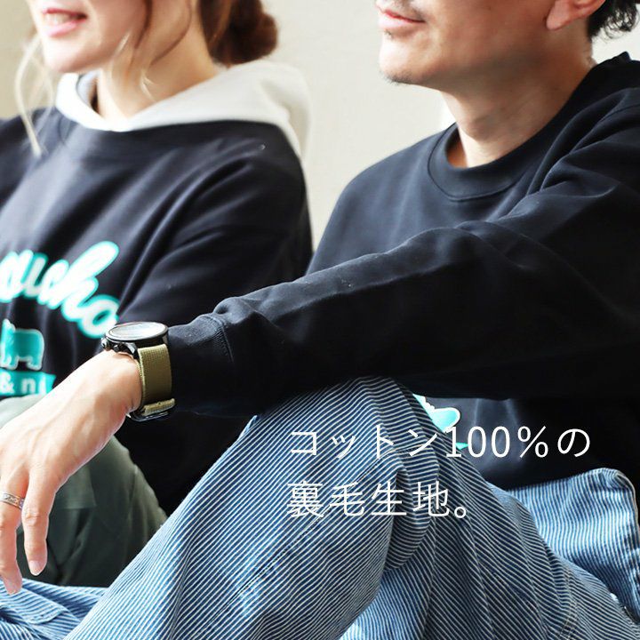 「やりすぎてない」この感じが、絶妙。 スウェット トレーナー 長袖 メンズ レディース カレッジロゴ プリント カバ キャラクター 綿100% 裏毛 日本製 国産 ブラック しっかり生地 通気性 ストレッチ 伸縮性 カジュアル ユニセックス PATY パティ s&nd セカンド