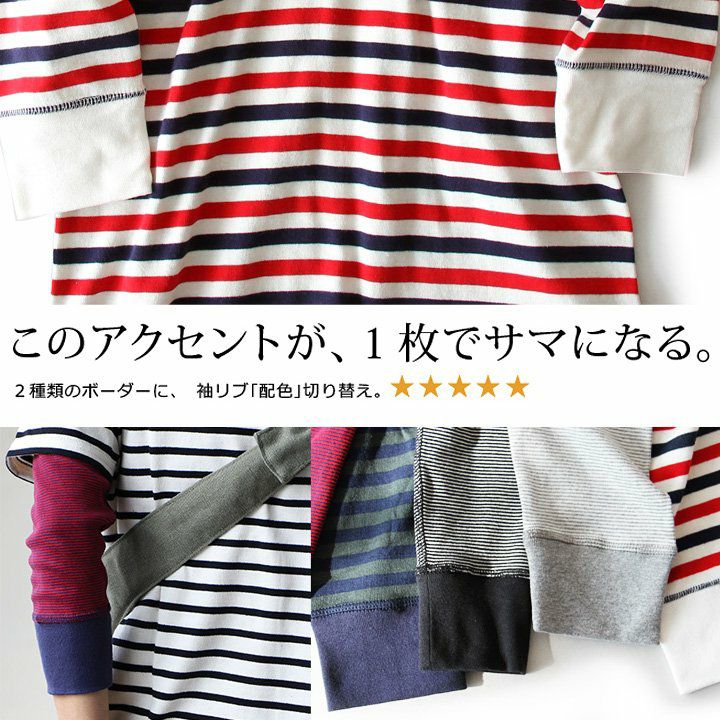 重ね着が得意じゃない方も、こんなカットソーは話が別なようです。 カットソー ロングTシャツ 長袖Tシャツ 長袖カットソー レディース 袖口 ボーダー お尻隠れる下着が見えない 薄手 綿100% トップス インナー ロンT 重ね着 袖長め 大きい M L XL LL 大人カジュアル grn×PATY パティ コラボ grn×PATY ジーアルエヌ×パティ