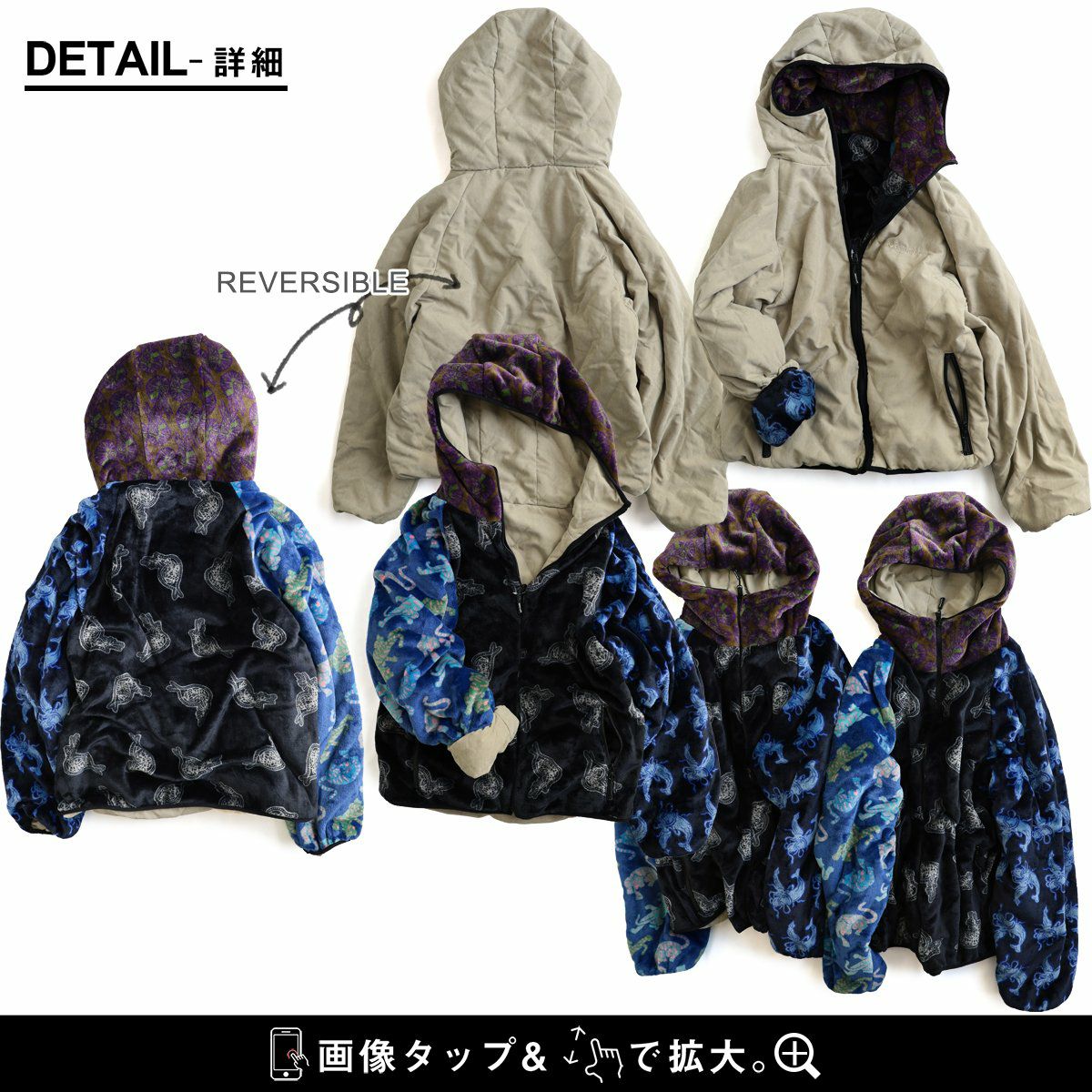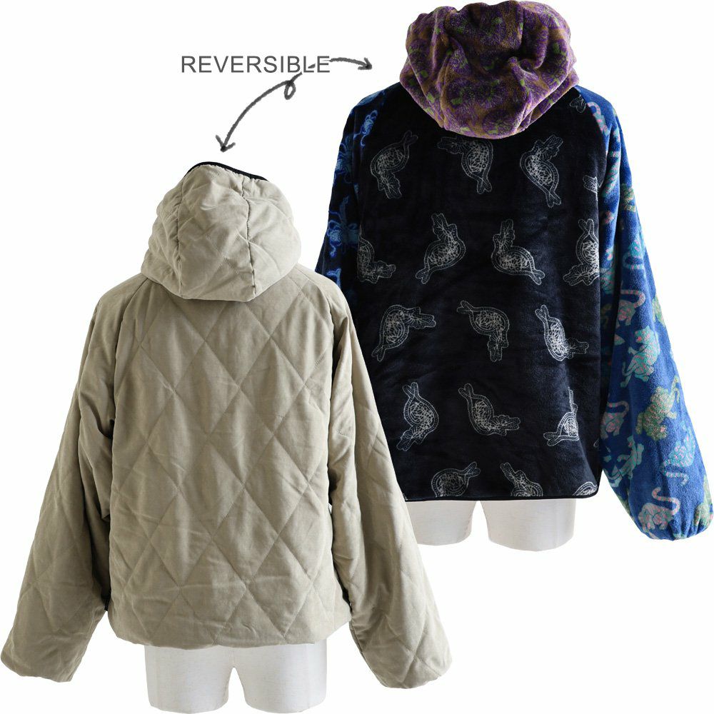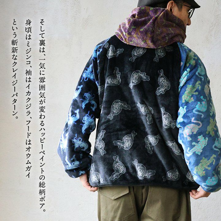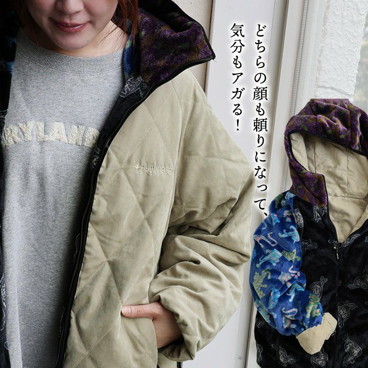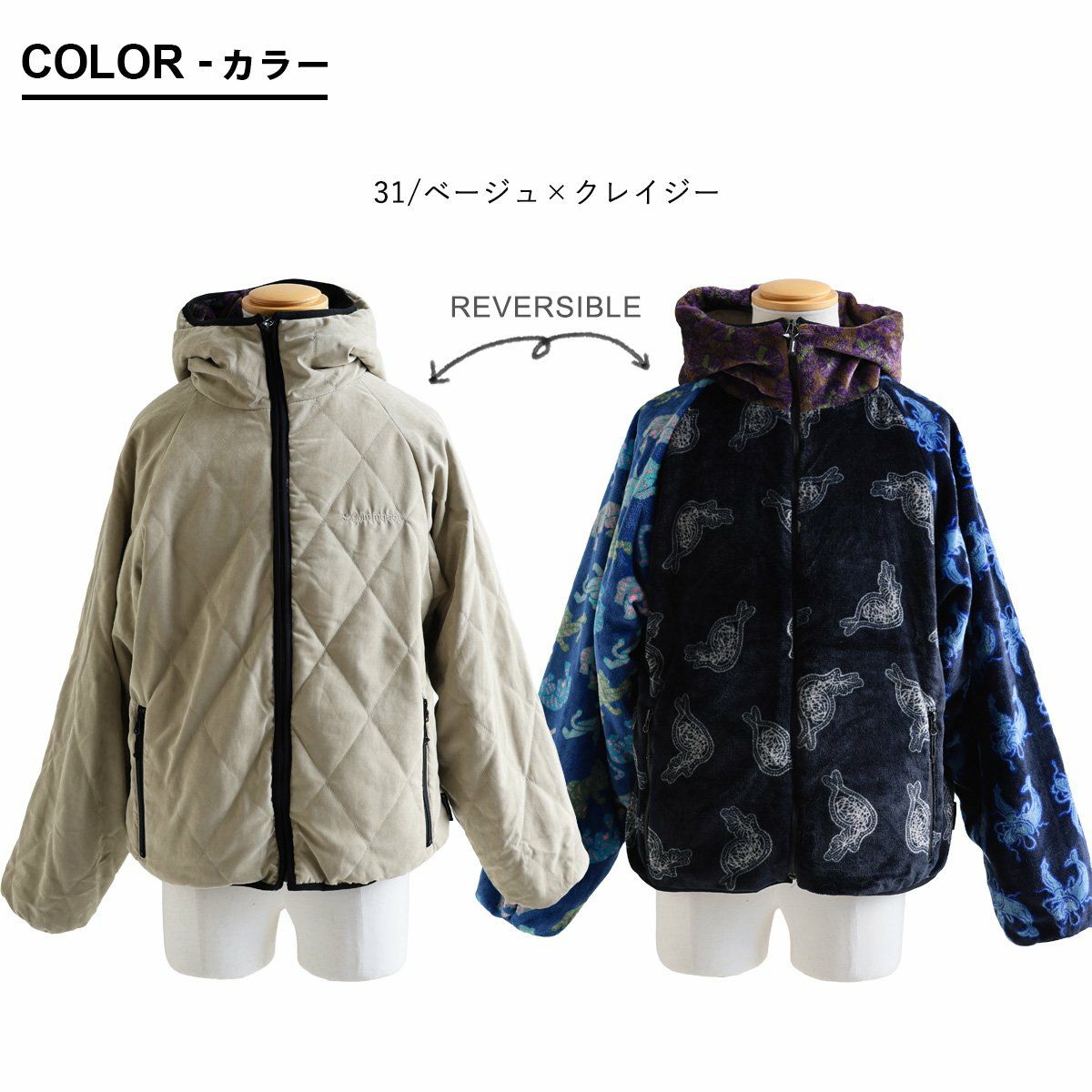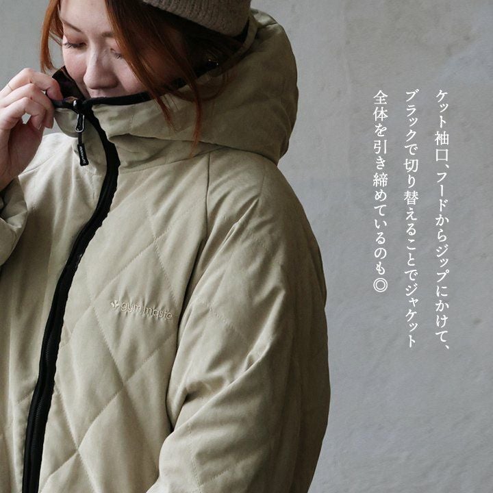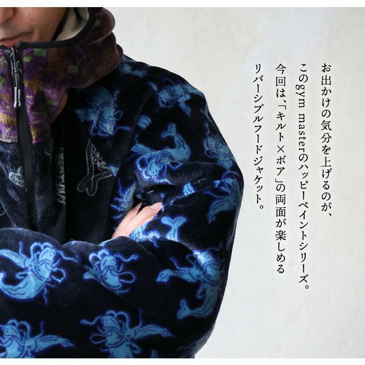 どちらの顔も頼りになって、気分もアガる! gym master ジムマスター ジャケット メンズ レディース フード付き ボア 総柄 キルト 中綿 ハッピーペイント 暖かい 軽い 配色 ジップポケット ゆったり 大きいサイズ カジュアル 秋 冬 パティ