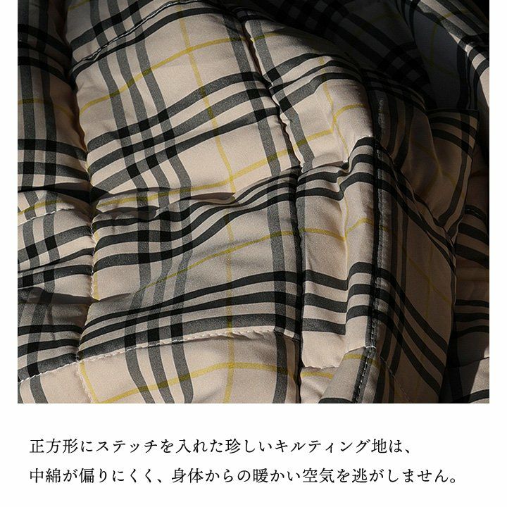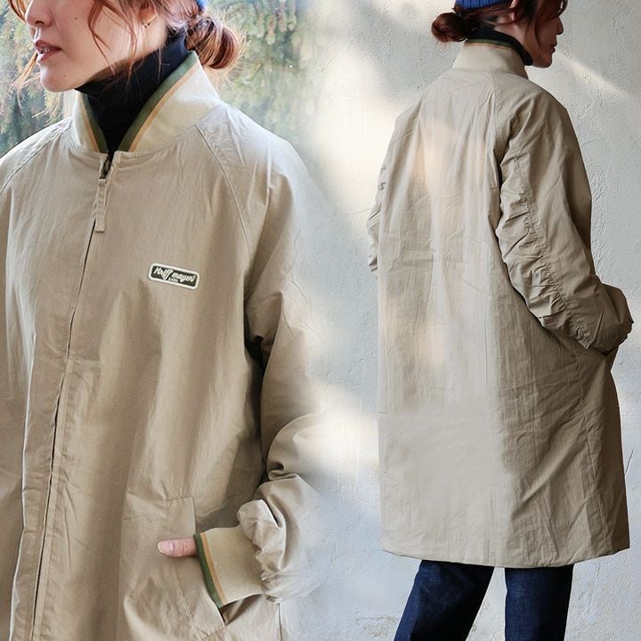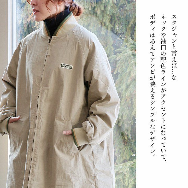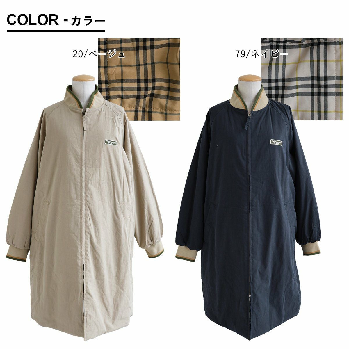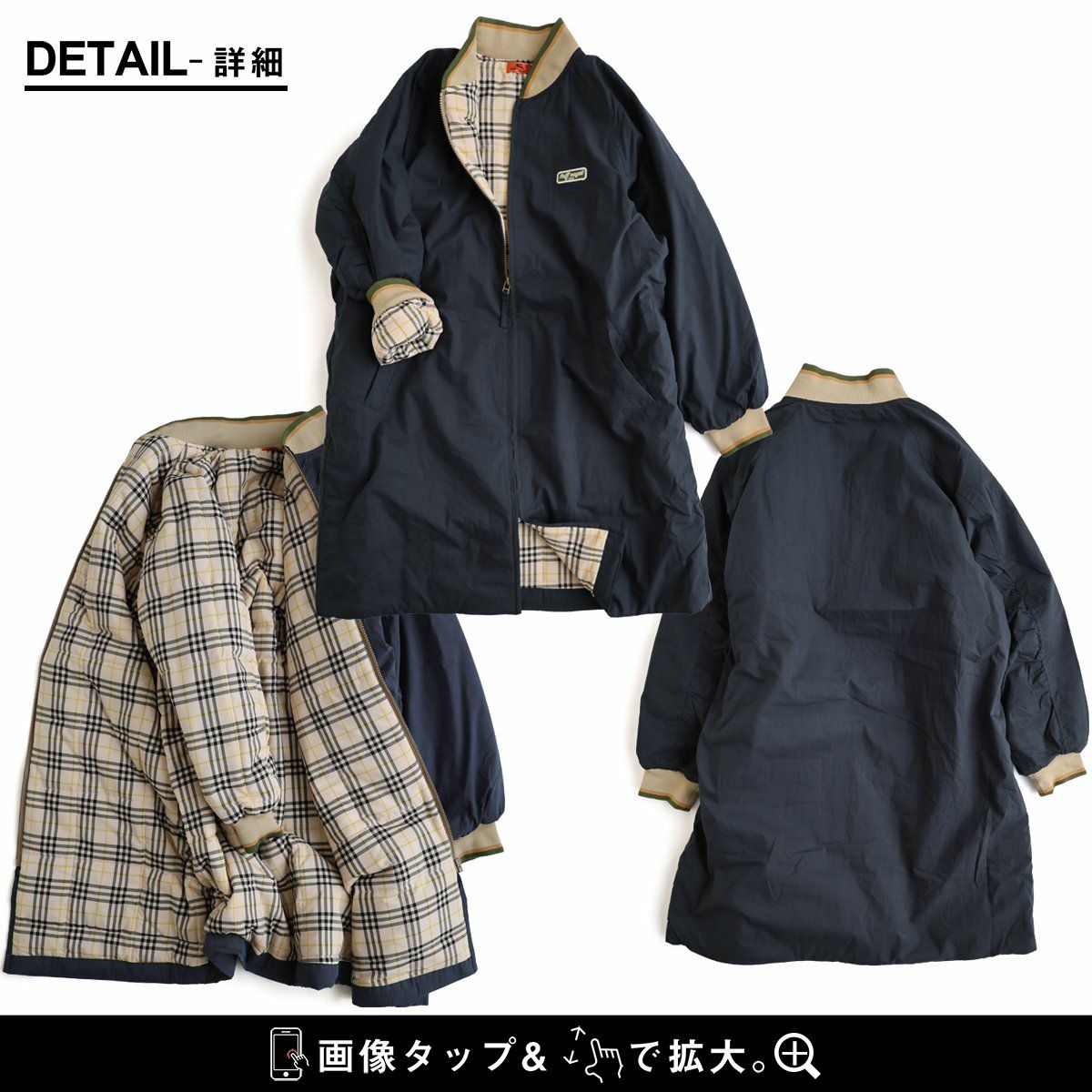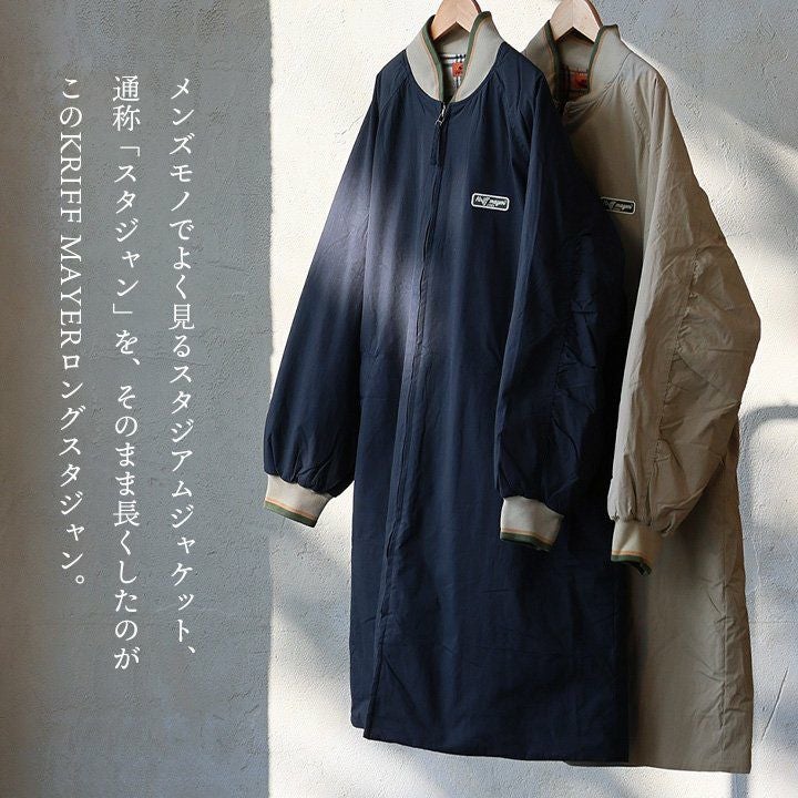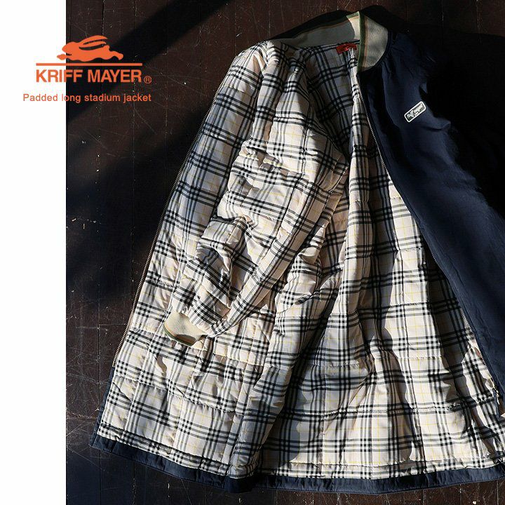 「らしさ」が光る、暖かロングスタジャン。 KRIFF MAYER クリフメイヤー スタジアムジャケット スタジャン ロング丈 レディース 袖リブ 配色 ライン ナイロン コットン ツイル 裏地付き チェック柄 中綿 暖かい 体型カバー すっきり カジュアル 秋 冬 パティ