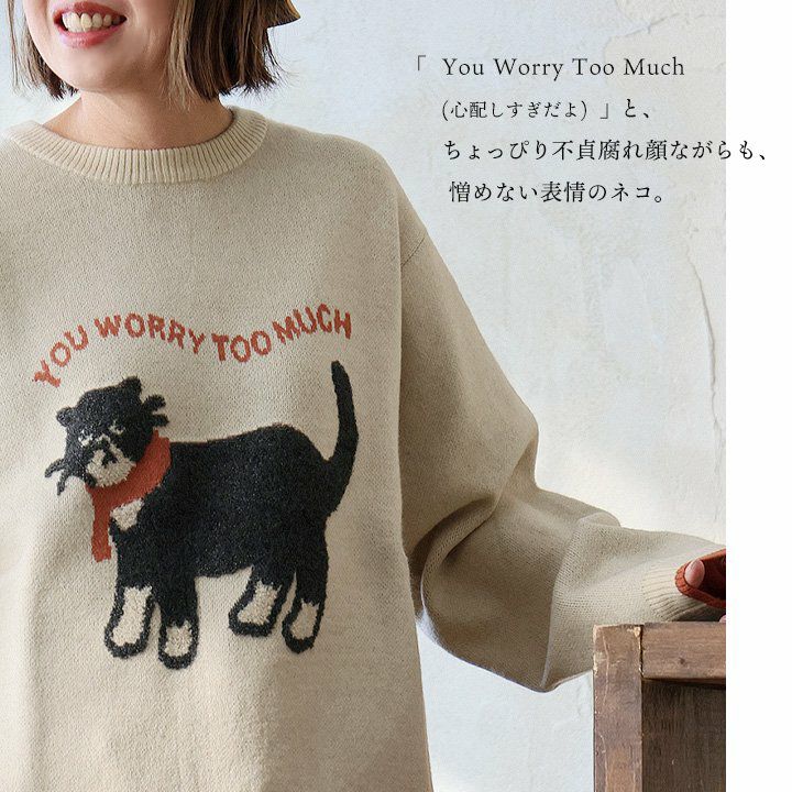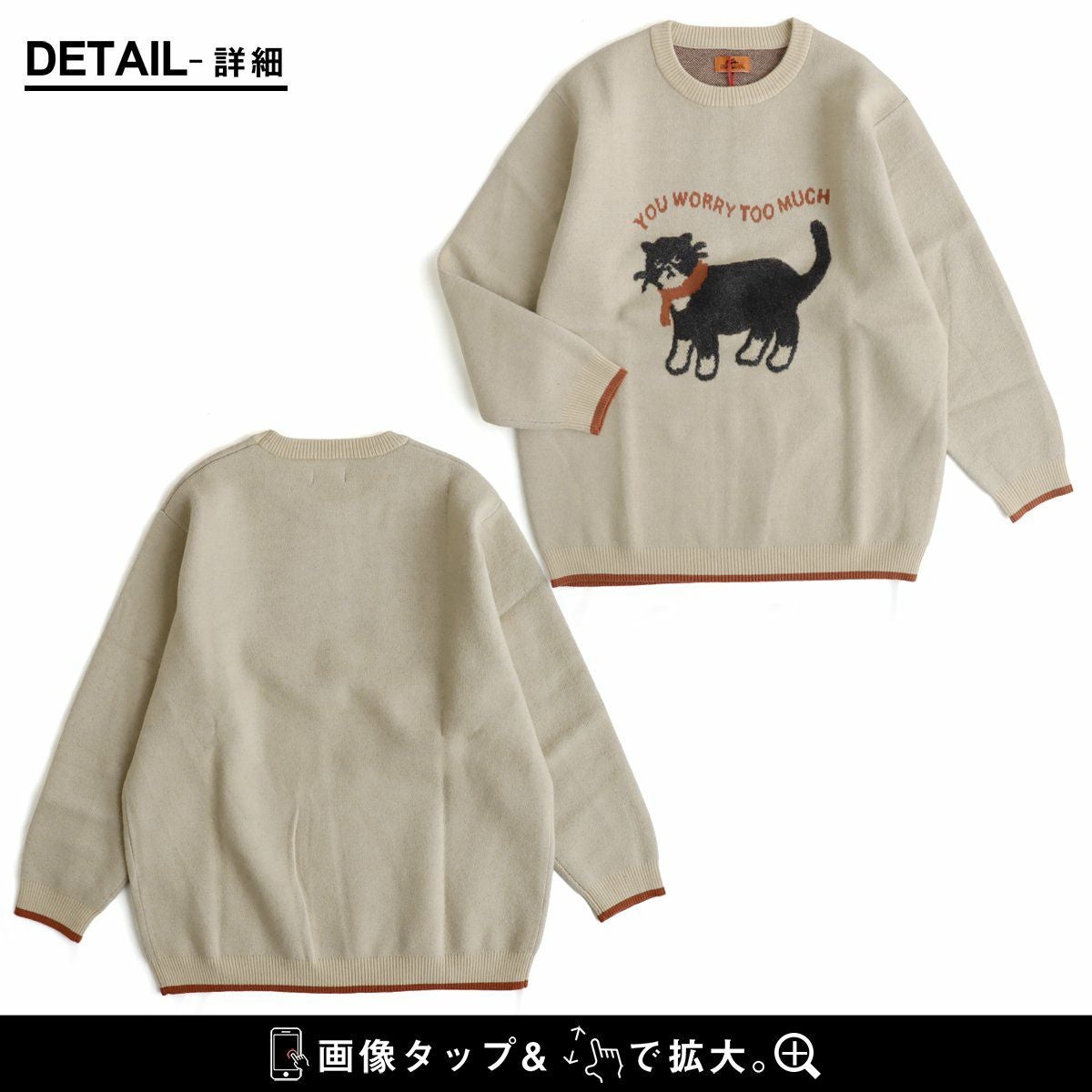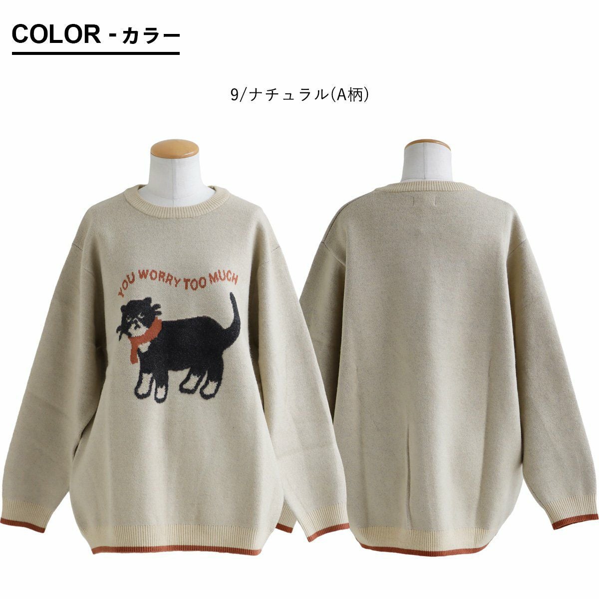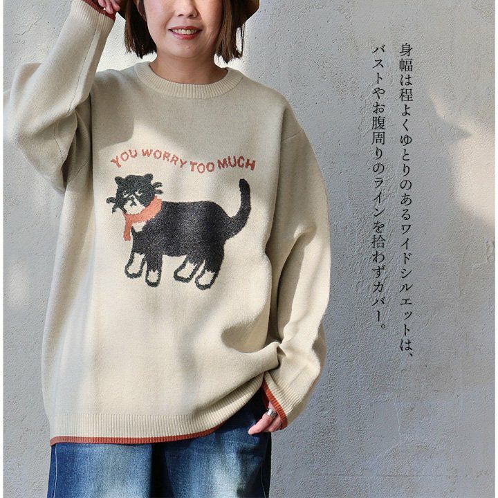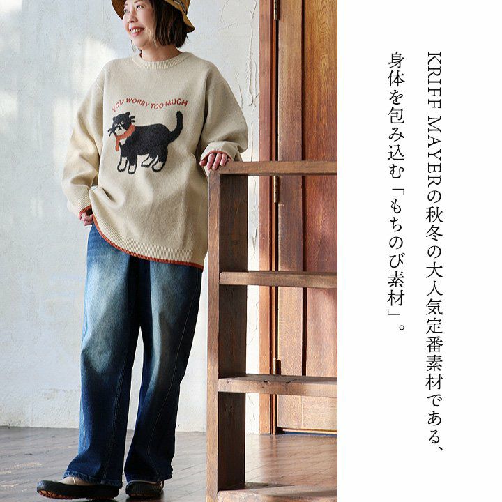 素朴で憎めないネコ、安心して着られる心地良さ。 KRIFF MAYER クリフメイヤー ニット セーター 長袖 レディース クルーネック ネコ 猫 アニマル ロゴ 配色 もちのび 伸縮性 洗濯出来る ゆったり 大きいサイズ カジュアル 秋 冬 パティ