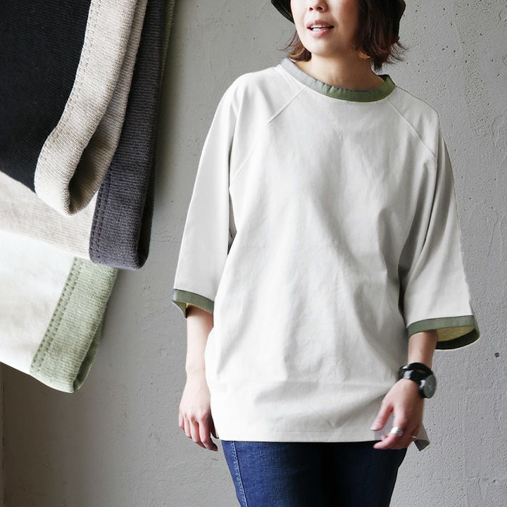 メリハリ効かせて、ゆるっと着痩せ。 【メール便50】 ドルマン tシャツ レディース 5分袖 しっかり 綿100% 配色 リブ ビッグシルエット ワイドシルエット ゆったり 着痩せ 甘くない 二の腕 カバー 春 夏 ティーシャツ クルーネック 5分袖tシャツ 無地 大人 カジュアル パティ Souple スプル