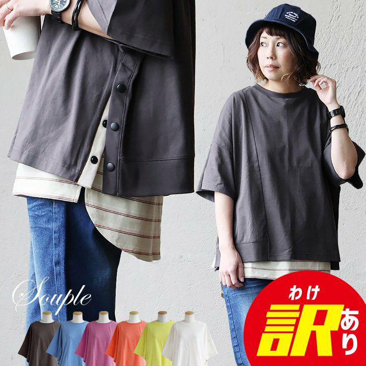 「あのタンクトップ」と合わせるだけで、おしゃれ見えします! 【メール便50】 【訳あり】 Tシャツ 5分袖 レディース クルーネック 脇 サイド ボタン開き 綿100% コットン しっかり生地 タフ 伸縮性 通気性 半袖 ゆったり 体型カバー 大きいサイズ すっきり カジュアル 夏 パティ Souple スプル Souple スプル