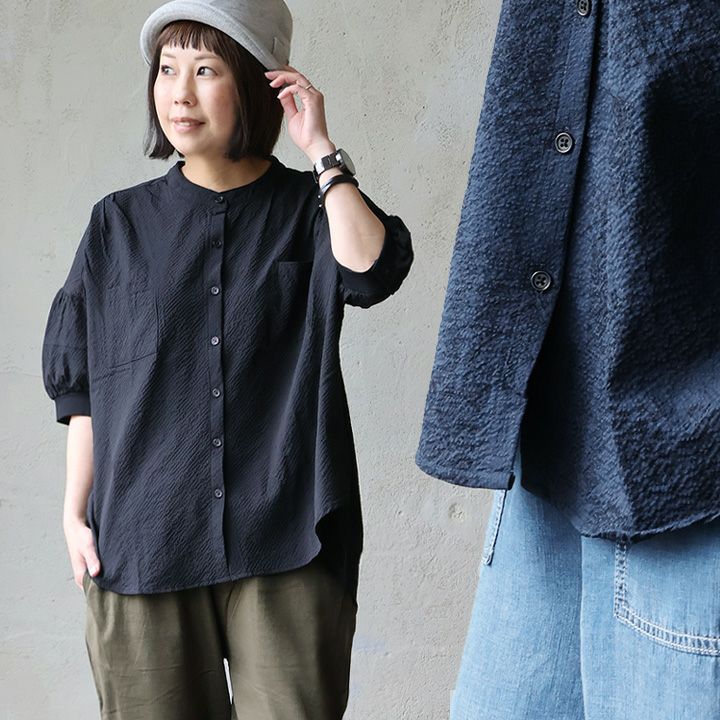 暑いときこそ、見た目も着心地も「心地良い」ものがいい。 【メール便50】 着痩せ ブラウス シャツ レディース 七分袖 バンドカラー ワイド 夏 涼しい シアサッカー 薄手 軽い 二の腕 お尻 カバー ポケット 大人 カジュアル パティ Souple スプル