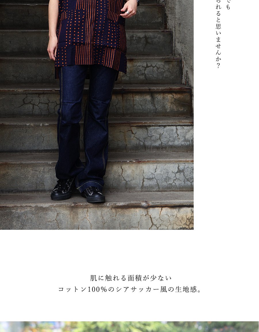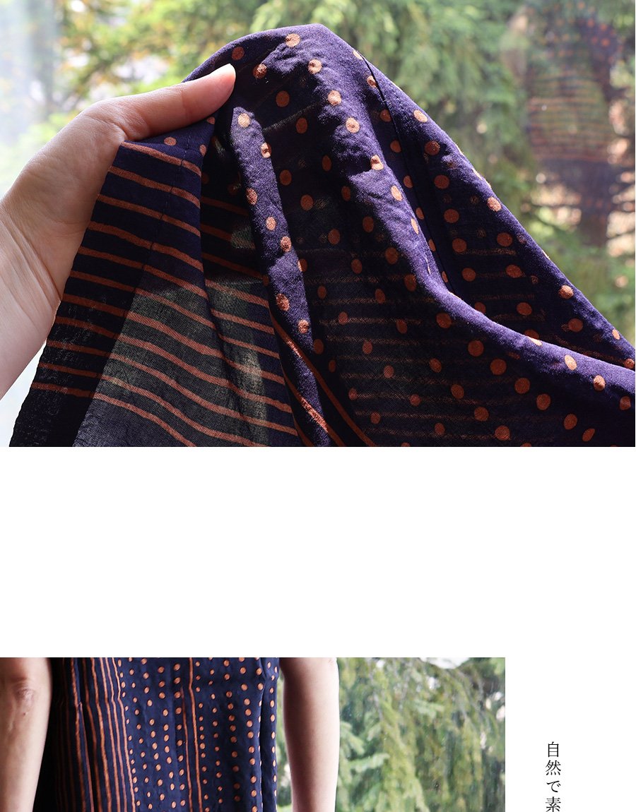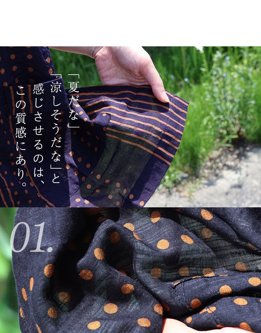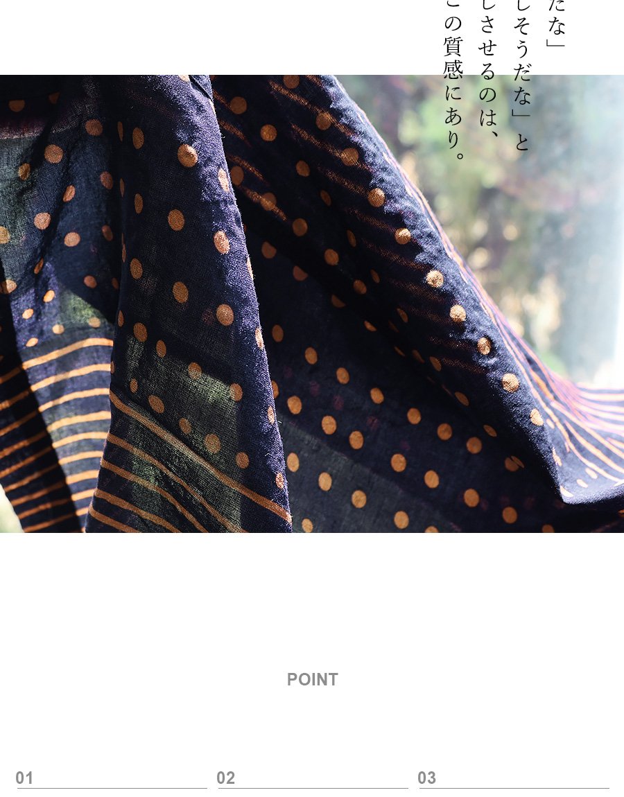 薄手でふわっと軽い、綿100%の生地。シアサッカー風の凹凸があり、柔らかな質感です。伸縮性はなく、光にかざすと透け感があります。
