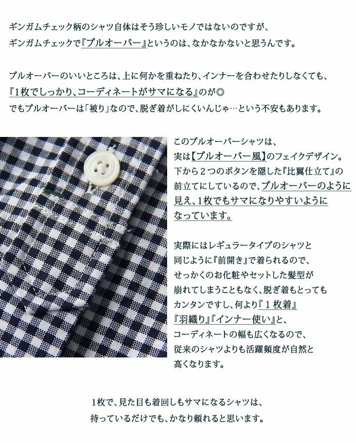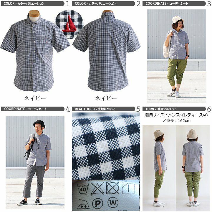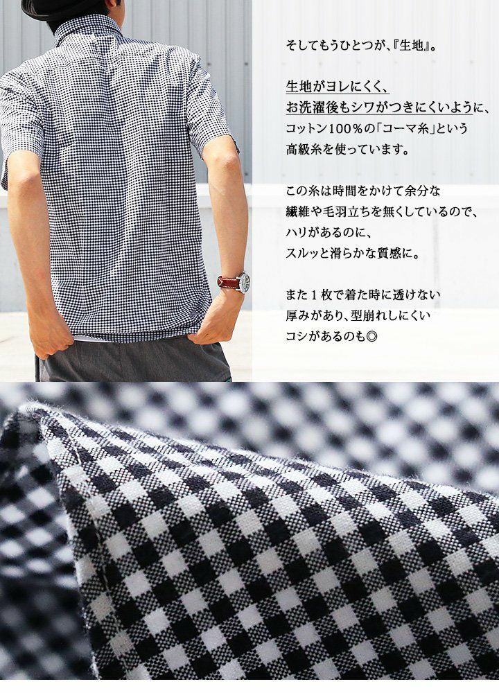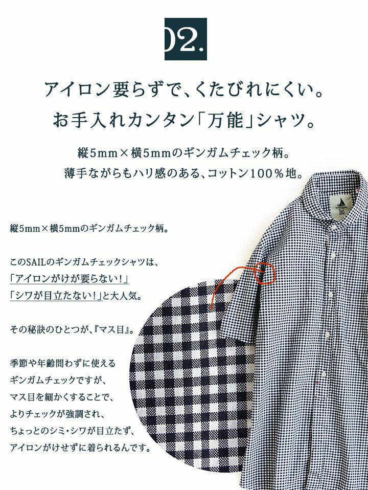 1枚で着られる「ゆとり」と、「アイロン要らず」の日本製チェック。 (セイル) SAIL 半袖 シャツ ギンガム チェック柄 プルオーバー風 日本製 綿100% 刺繍入り