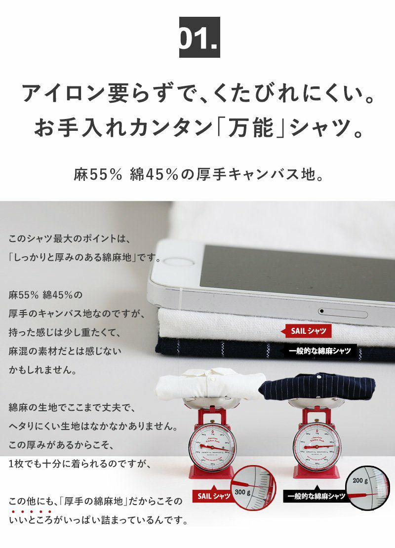 他の画像を見る アイロン要らずの、日本製「着痩せ」シャツ。 (セイル) SAIL シャツ 長袖 レギュラーカラー プルオーバー風 ワンポイント 刺繍 『綿麻 オックス キャンバス』 日本製 販売価格 ¥ 6,050 税込 在庫切れ カートに入れる お気に入りに登録する
