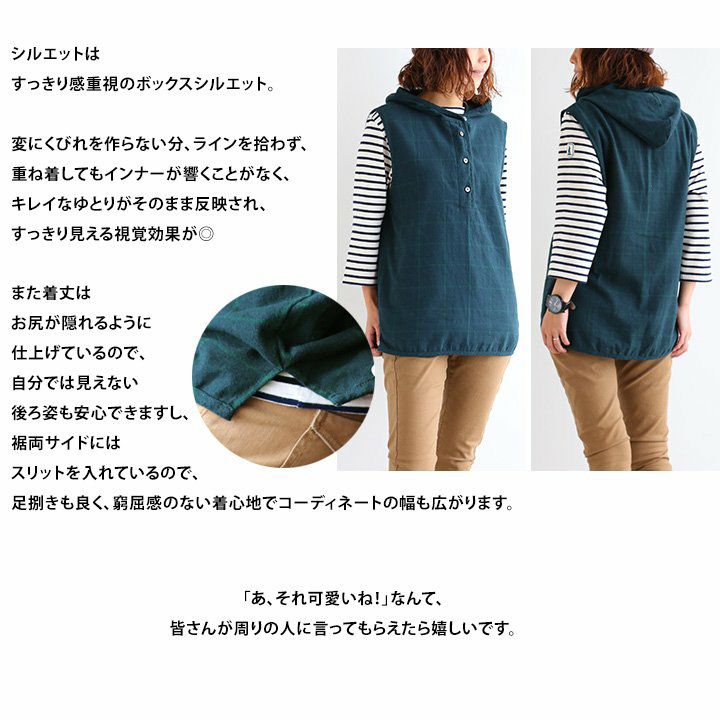 他の画像を見る 重ねているのに、着痩せして見える、涼しいゆるベスト。 (セイル) SAIL プルオーバー ベスト フード カシュクール ロング丈 チェック柄 シアサッカ―風 綿麻 販売価格 ¥ 4,290 税込 在庫切れ カートに入れる お気に入りに登録する