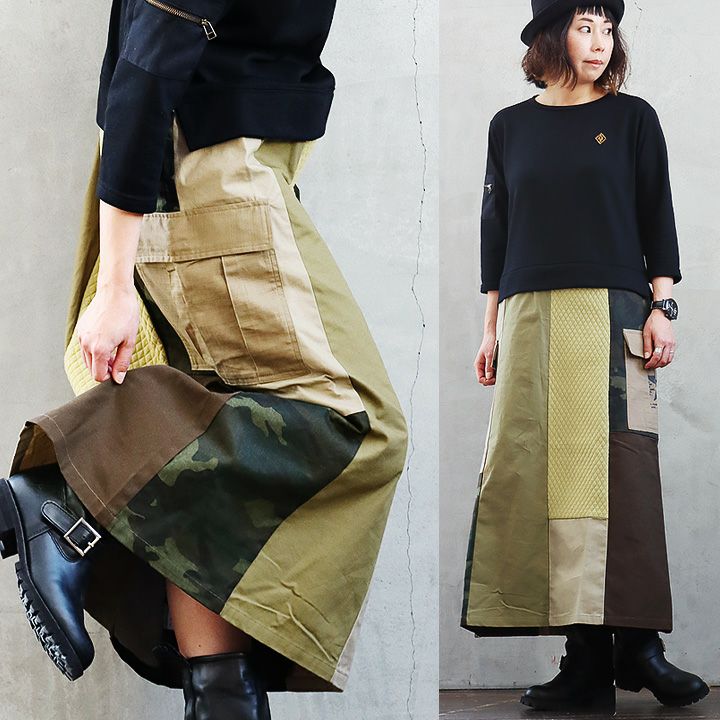 コーデに悩まず時短もできる、「失敗なし」の鉄板ワンピ。 ドッキングワンピース レディース 選べる ロング丈 マキシ丈 7分袖 春 カジュアル スウェット 異素材 切り替え 重ね着 風 リメイク パッチワーク カーゴポケット カモフラ 黒 Aライン 着痩せ ミリタリー ドッキングワンピ 40代 50代 PATY パティ OAR’S オールズ
