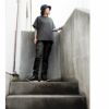 【モデルコメント】骨盤で穿きました。全体的にかなり強めフィット感があって、屈伸するのも厳しい感じでした…。 【客観的コメント】裾が地面に少し擦れるくらいの丈の長さです。見た目でも、かなりフィット感はありましたね。