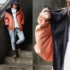 【モデルコメント】中は、トレーナーも合わせやすそうです。全体的にしっかりとゆとりのあるサイジングでしたね。 【客観的コメント】お尻は完全に隠れるくらいの着丈の長さです。中をしっかりと着込みたいなら、選んでも良さそうなサイジングですね