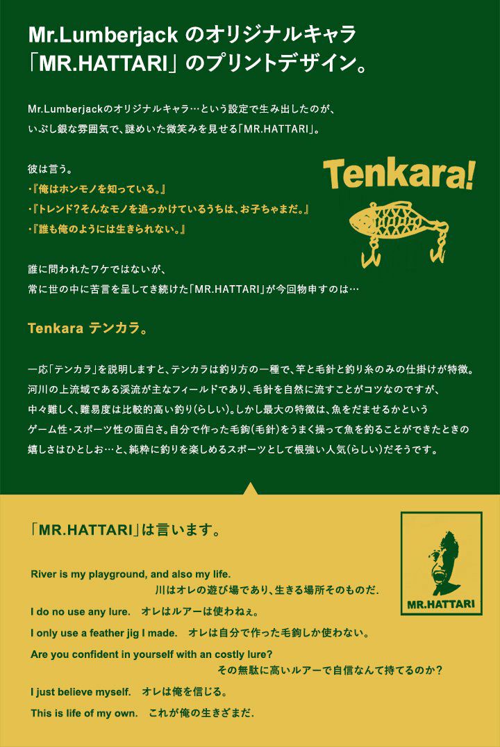 他の画像を見る 「MR.HATTARI」が、ひと言、物申す。 (ミスターランバージャック) Mr.Lumberjack 半袖Tシャツ TENKARA テンカラ HATTARI プリント 綿100% 販売価格 ¥ 4,950 税込 在庫切れ カートに入れる お気に入りに登録する