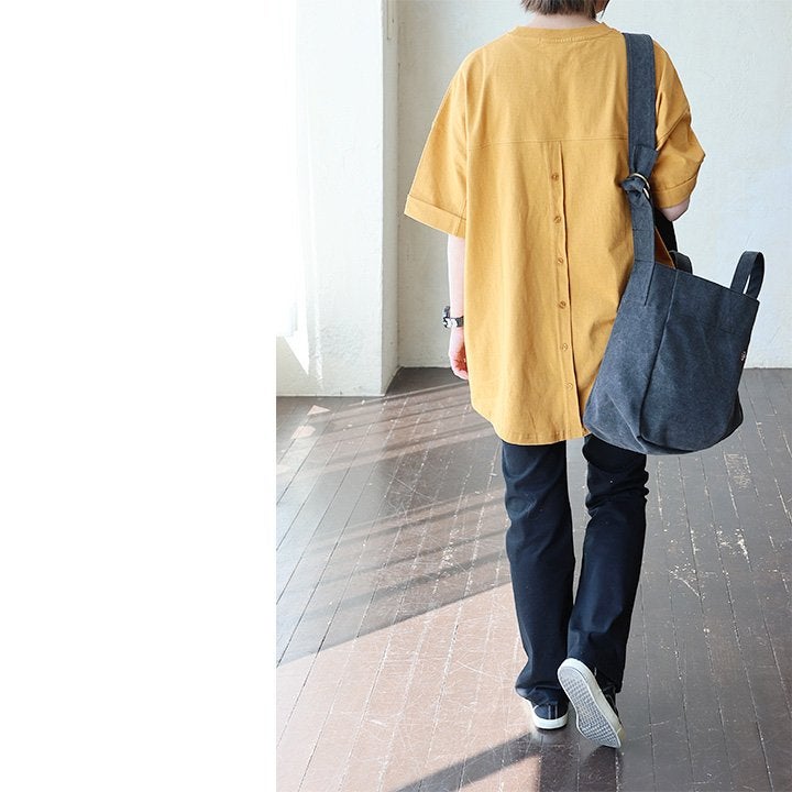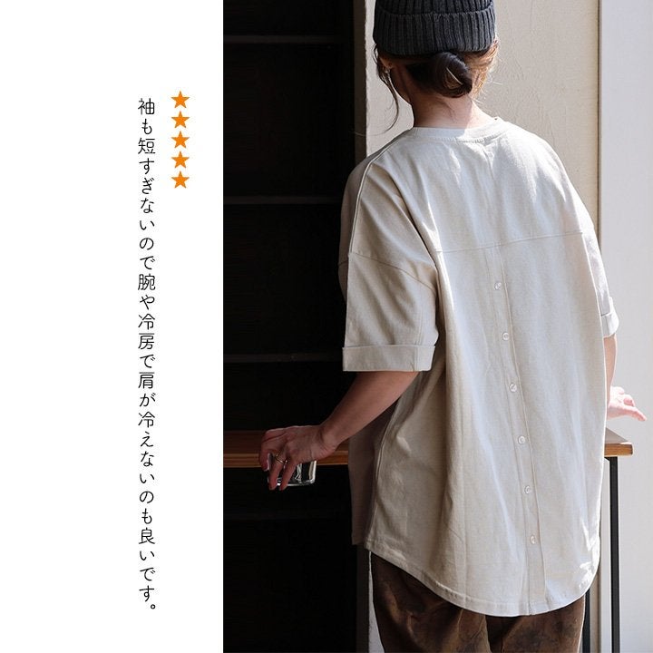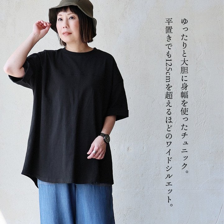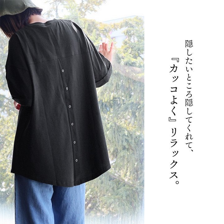 隠したいところを隠してくれて、『カッコよく』リラックス。 【メール便50】 チュニック 五分袖 ロング ワイド レディース すっきり 着痩せ 切替 夏 夏服 ゆったり tシャツ しっかり 柔らか 綿100% USA コットン バック ボタン お尻 二の腕 隠れる カバー 5分袖 半袖 大人 カジュアル パティ Souple スプル