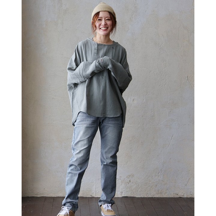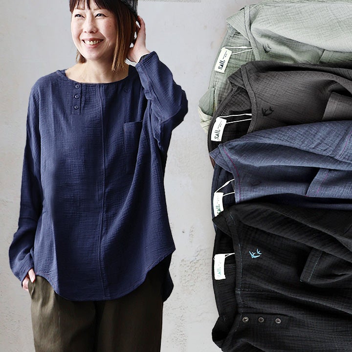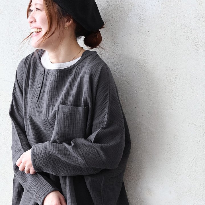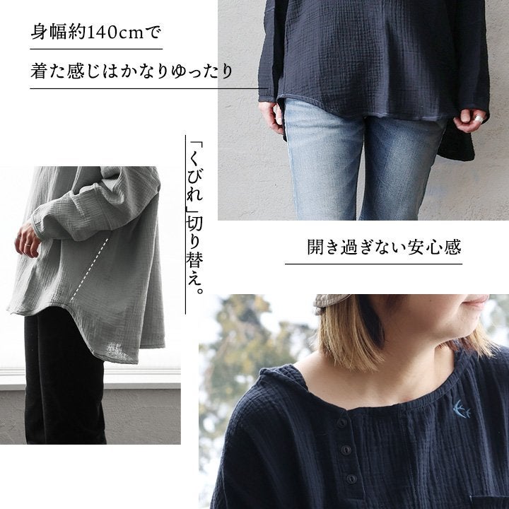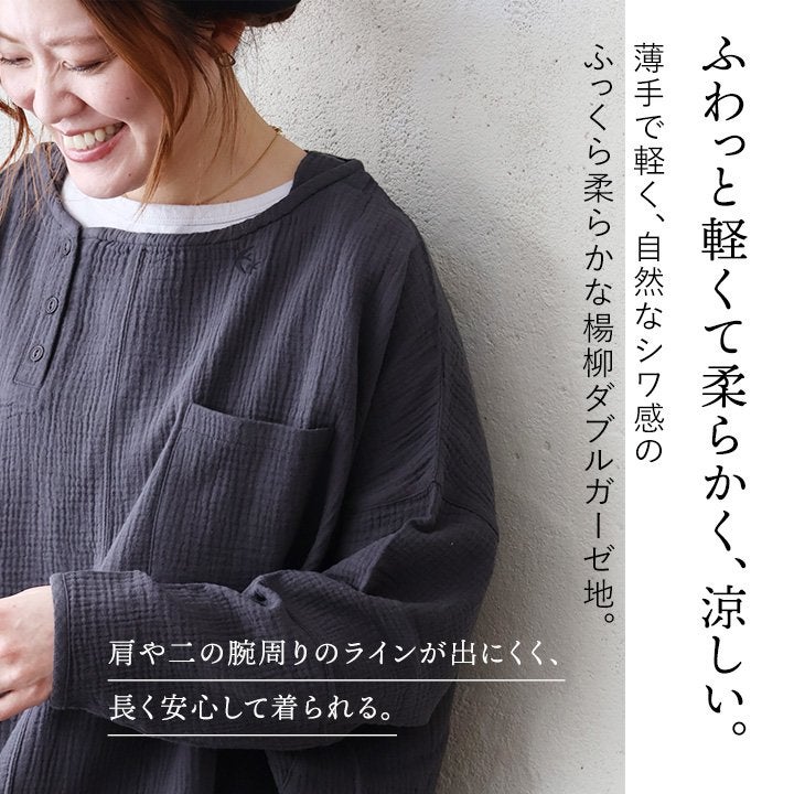 ふんわり、きちんと。大人の余裕シャツ。 シャツ 長袖 メンズ レディース ダブルガーゼ スタンドネック 綿100 コットン 春 すっきり 着やせ ワイド シームポケット 大きいサイズ ゆったり お尻 体系 カバー 吸湿 速乾 通気性 軽い 軽量 オフィス カジュアル パティ SAIL セイル