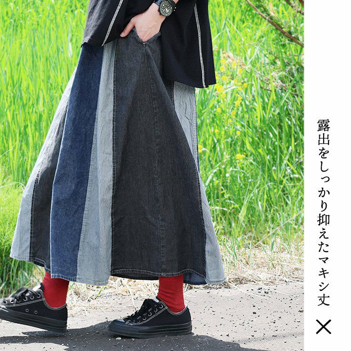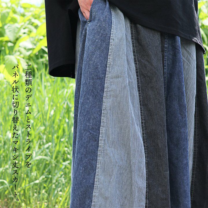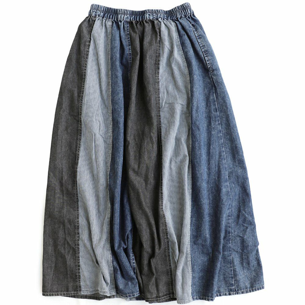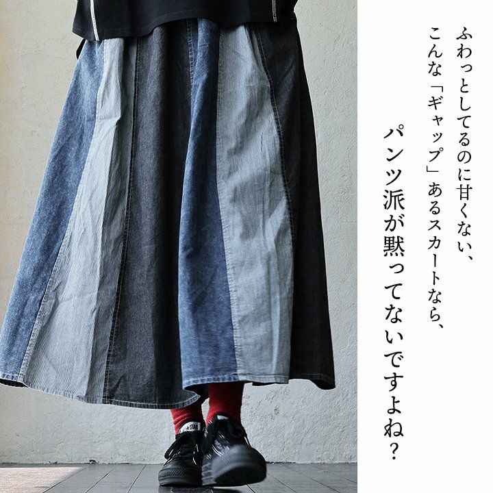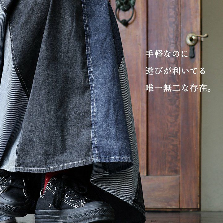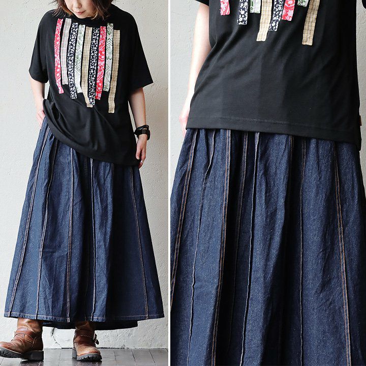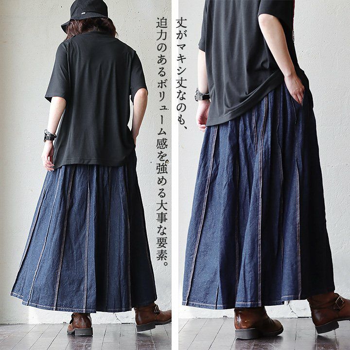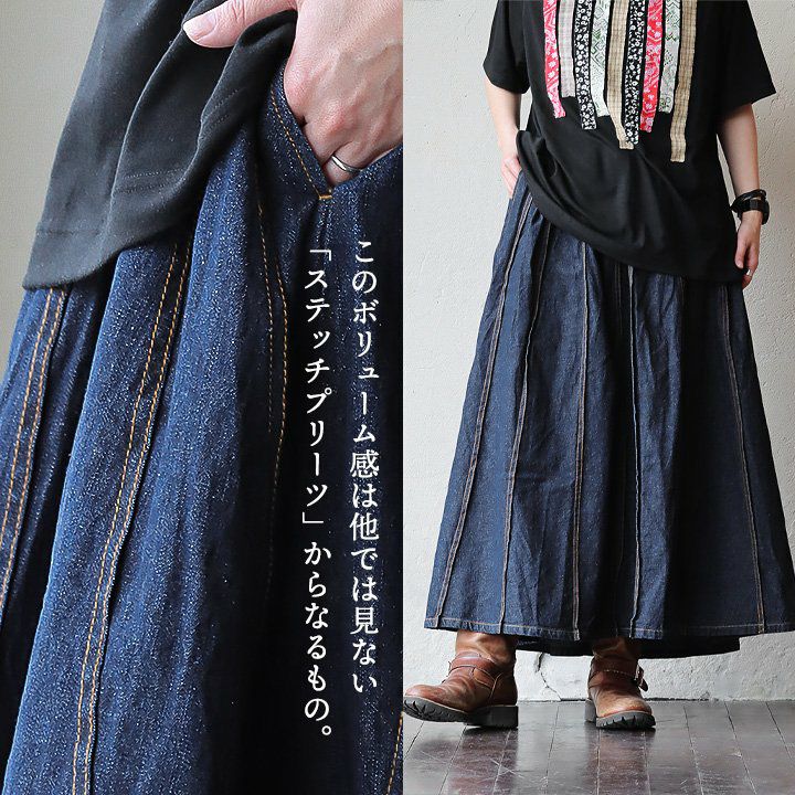 バサっと、見せつけたくなる唯一無二なボリューム感。 マキシスカート レディース スカート ロングスカート デニム ステッチ プリーツ 大きいサイズ マキシ丈スカート ウエストゴム 紐 変形 ボリューム リメイク カジュアル メンズライク パティ BLUETO ブルート