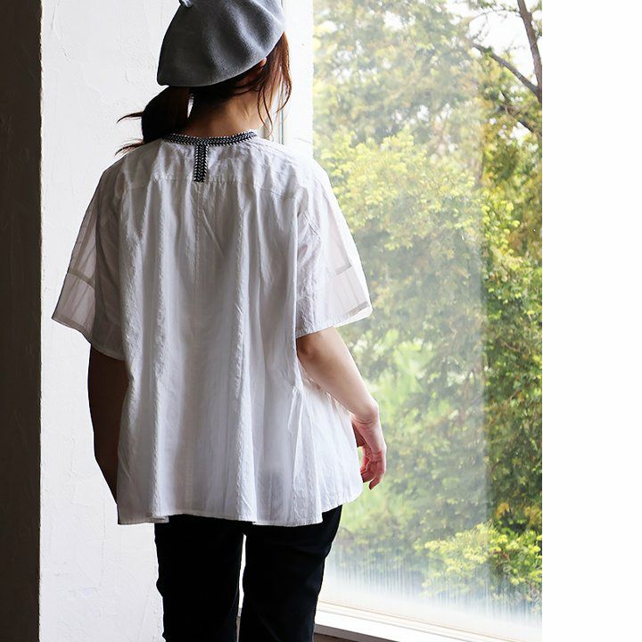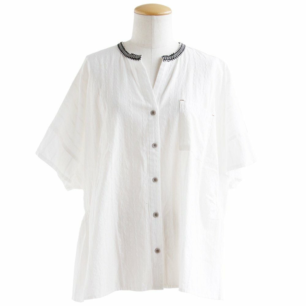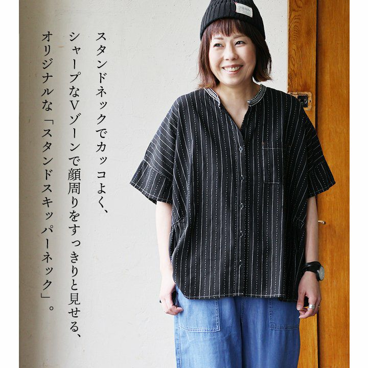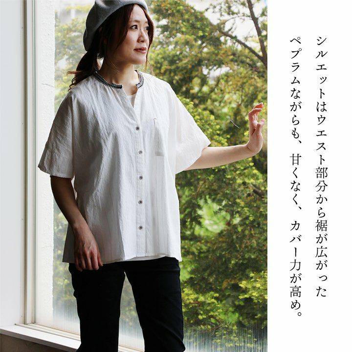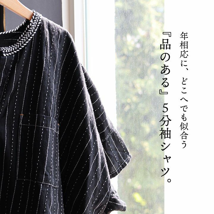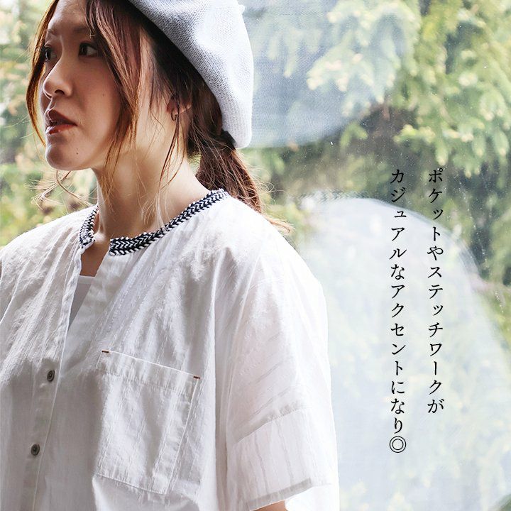 年相応に、どこへでも似合う『品のある』5分袖シャツ。 シャツ 5分袖 レディース スタンドネック ハイネック スキッパーネック 刺繍 アクセント 綿混 ドビー織り 薄手 軽い 涼しい ワイド 着痩せ 軽い カジュアル シンプル おしゃれ 夏 パティ BLUETO ブルート