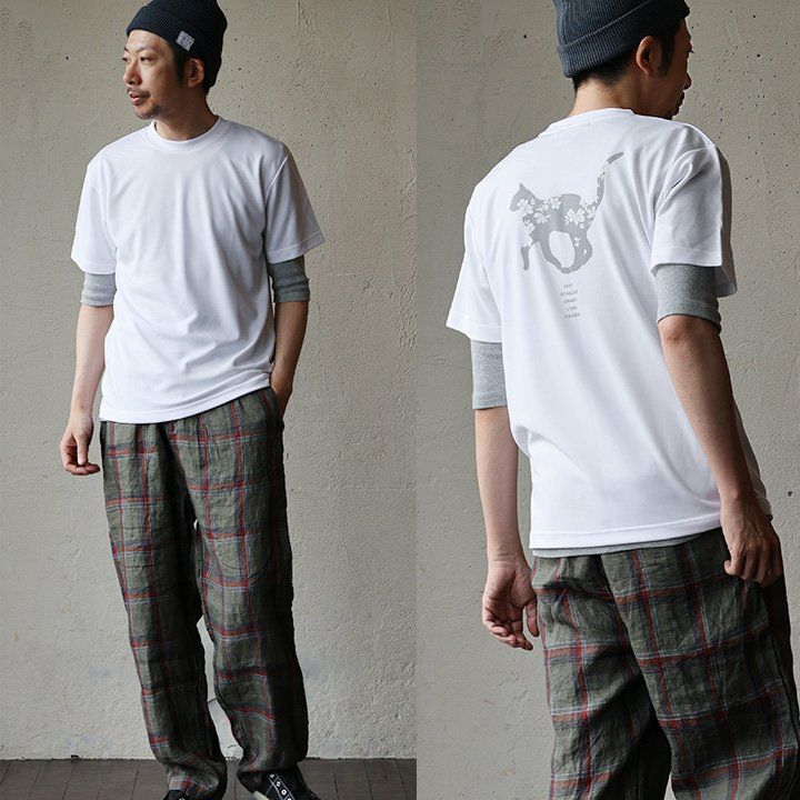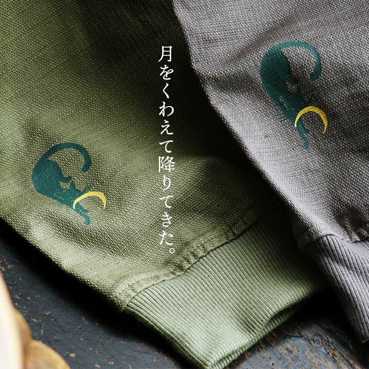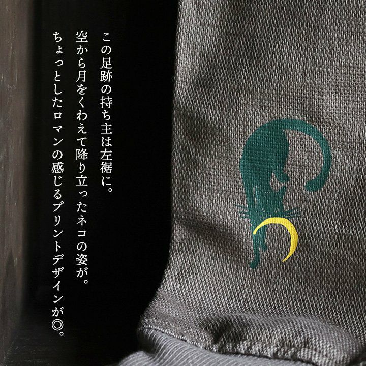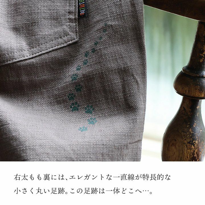 月をくわえて降りてきた。 麻 パンツ メンズ レディース 夏 涼しい 伸びる ストレッチ 綿麻 しっかり 丈夫 ウエストゴム 裾 リブ ポケット付き バック プリント 猫 ねこ ネコ すっきり 細見え スリム テーパード カジュアル 洗える 軽い パティ Spants スパンツ
