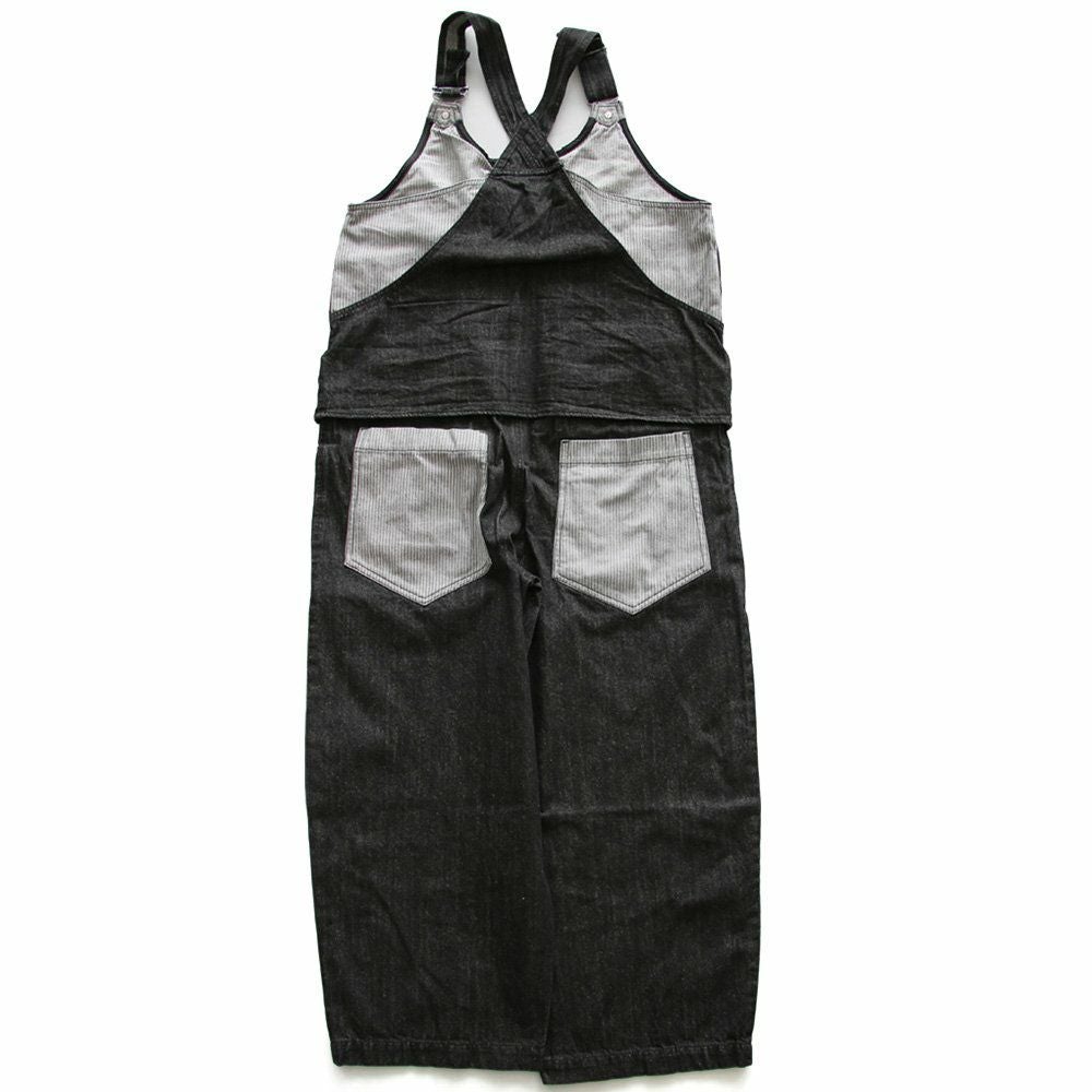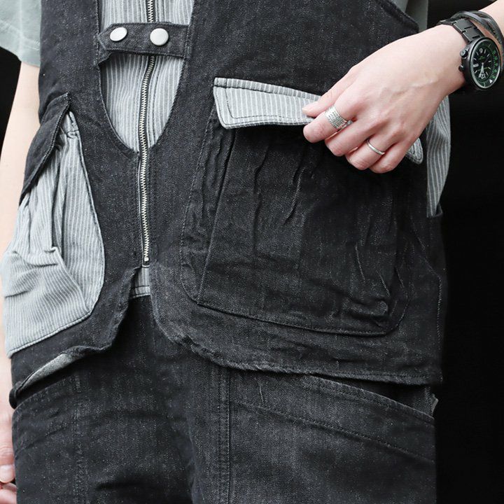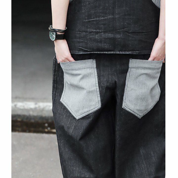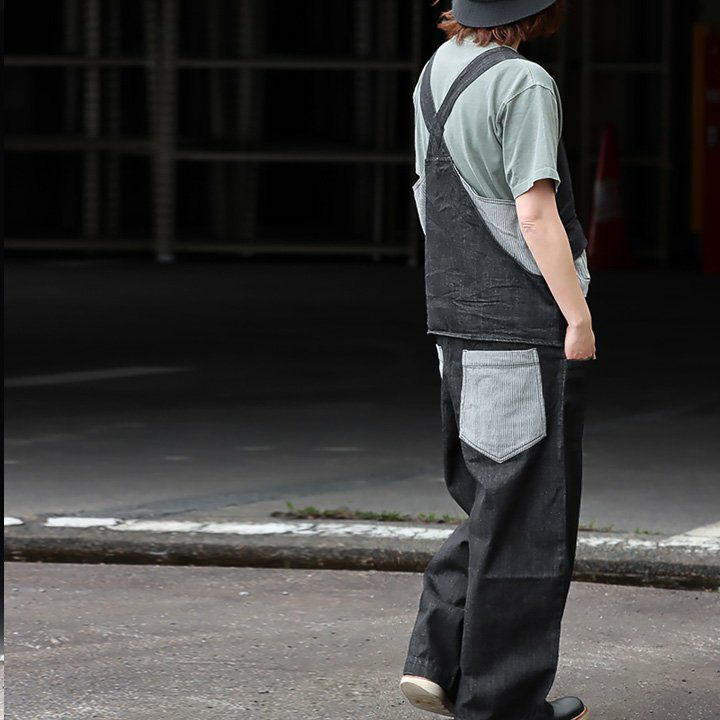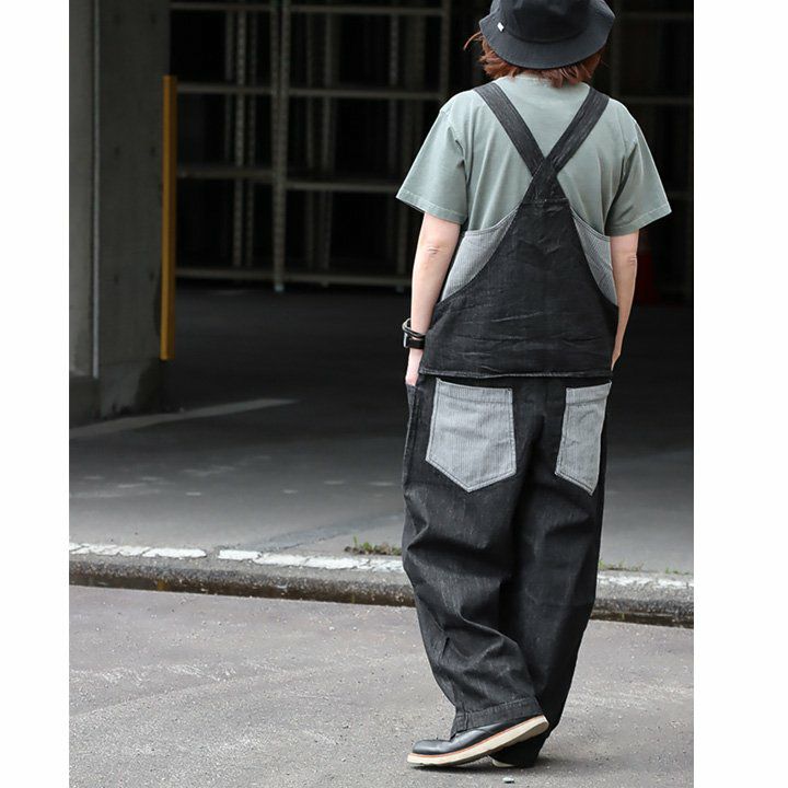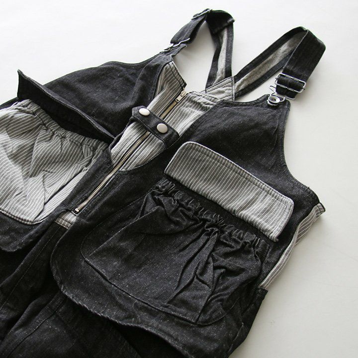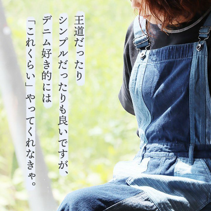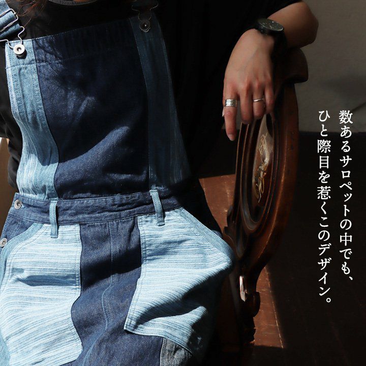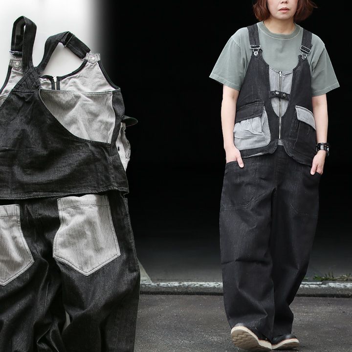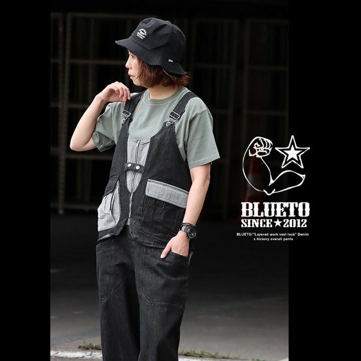 「カッコイイ」だけじゃなく、『面白い』からハマる。 サロペット パンツ ワイド ストレート ベスト 重ね着風 フェイクレイヤード ドッキング デニム ヒッコリー ストライプ 切り替え レディース メンズライク かっこいい BLUETO ブルート