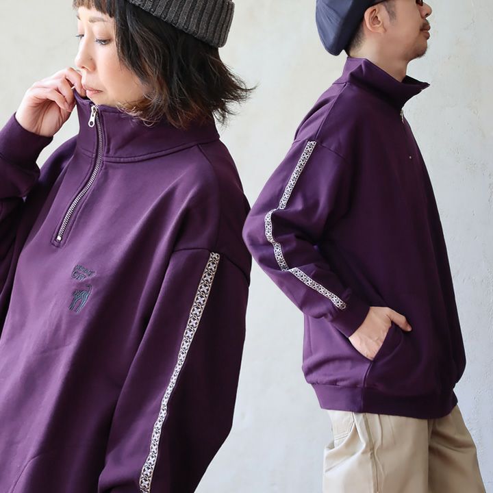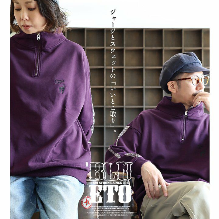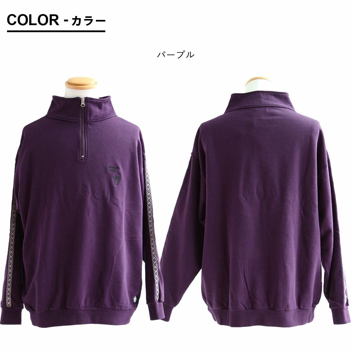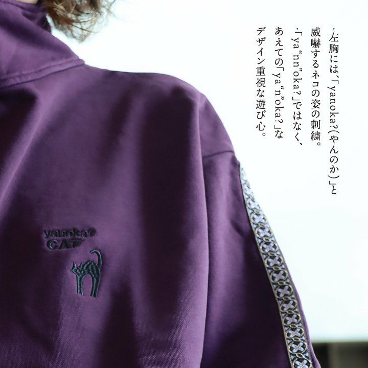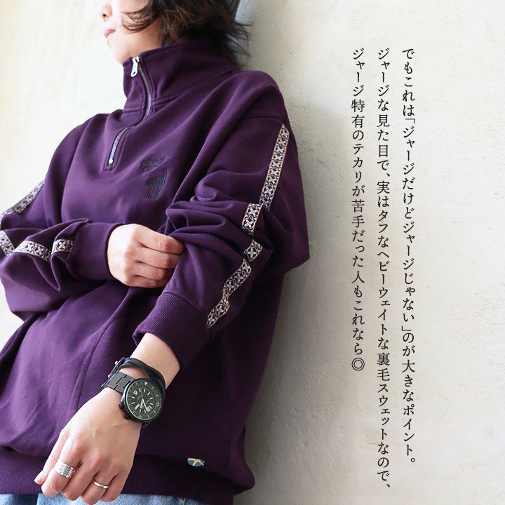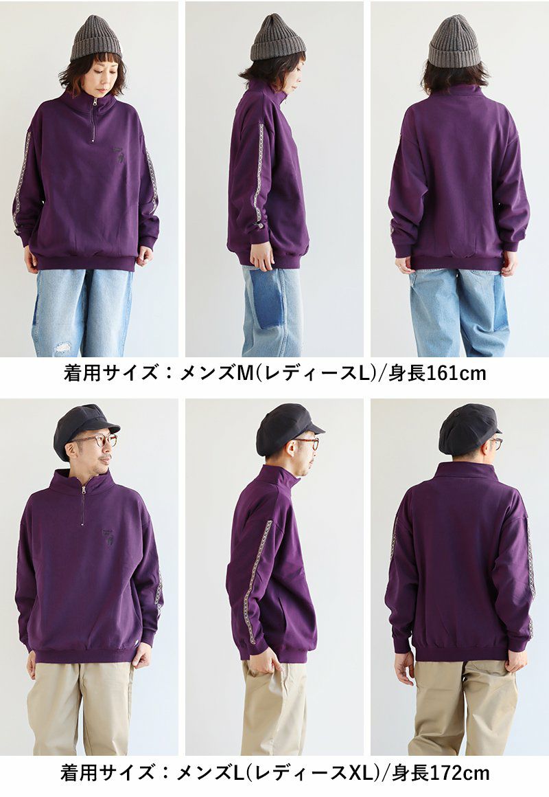 ジャージとスウェットの「いいとこ取り」。 スウェット トレーナー 長袖 ハーフジップ メンズ レディース 猫 ねこ ネコ しっかり 丈夫 綿100% 裏毛 活性染め ワイド ビッグシルエット お尻 隠れ カバー ポケット 刺繍 スエット レトロ ジャージ風 大人 カジュアル パティ BLUETO ブルート