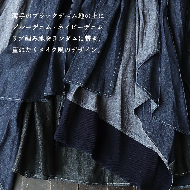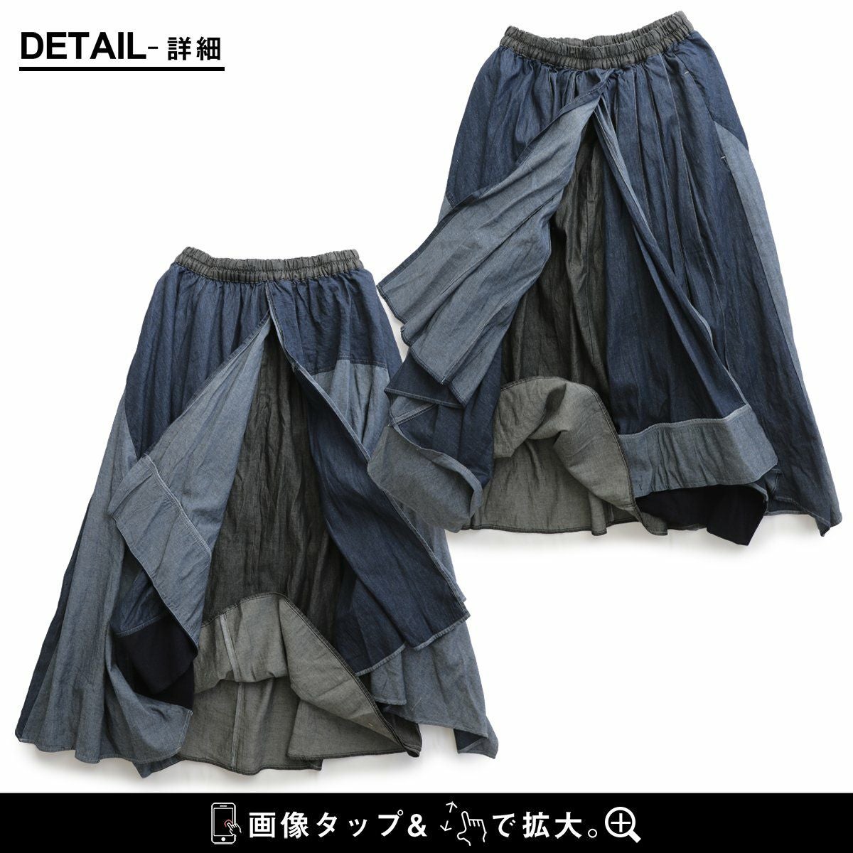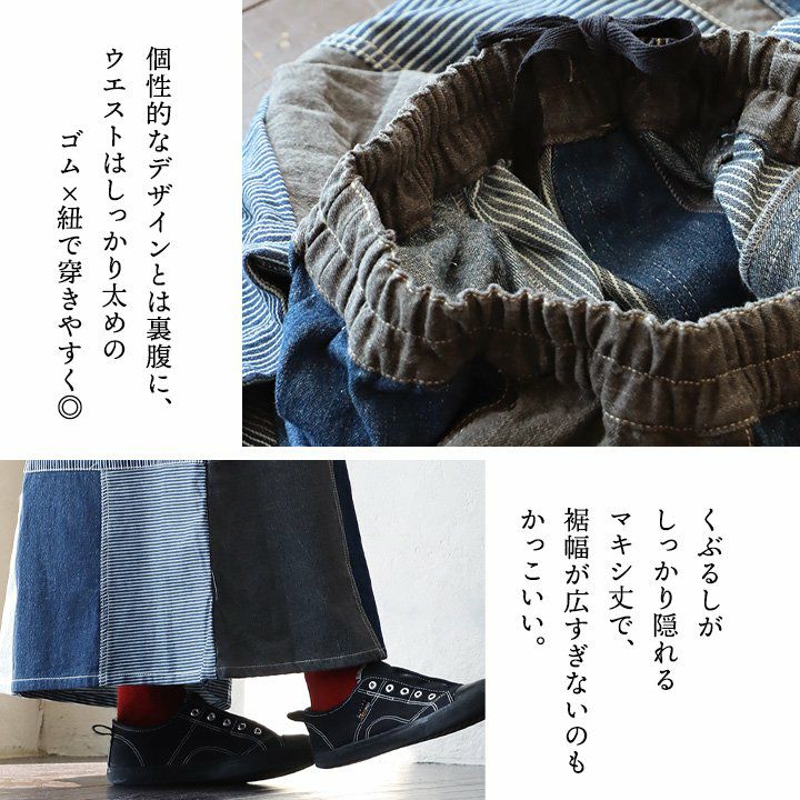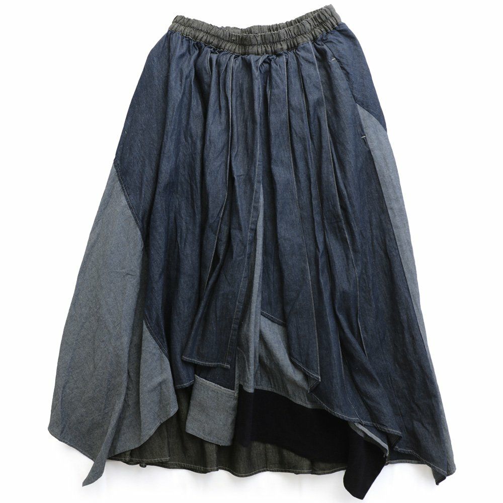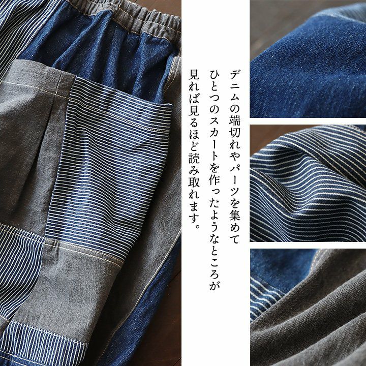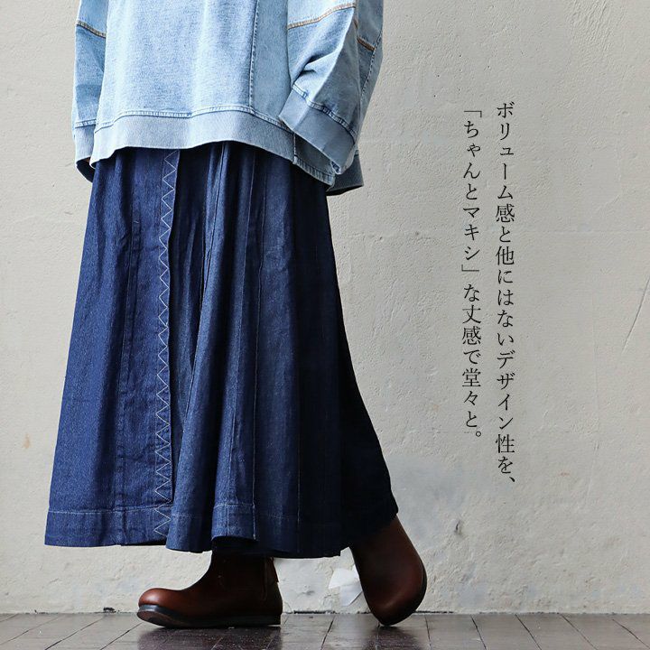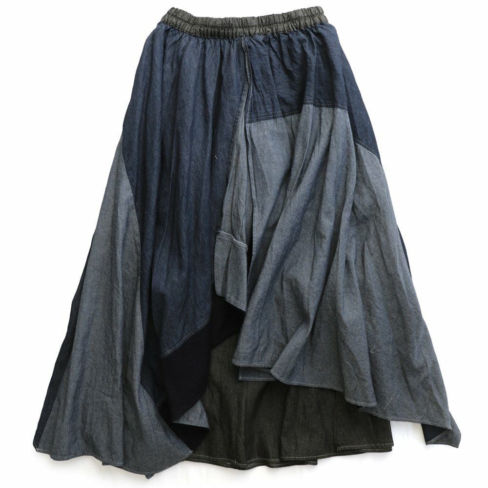 360度、どこからみてもかっこいい「メーニーパーツ」なスカート。 スカート マキシ丈スカート デニムマキシ リメイク パッチワーク 着痩せ 脚長 ロングスカート マキシスカート レディース ゆったり かっこいい フレアスカート 大きいサイズ 大人 カジュアル アメカジ パティ BLUETO ブルート