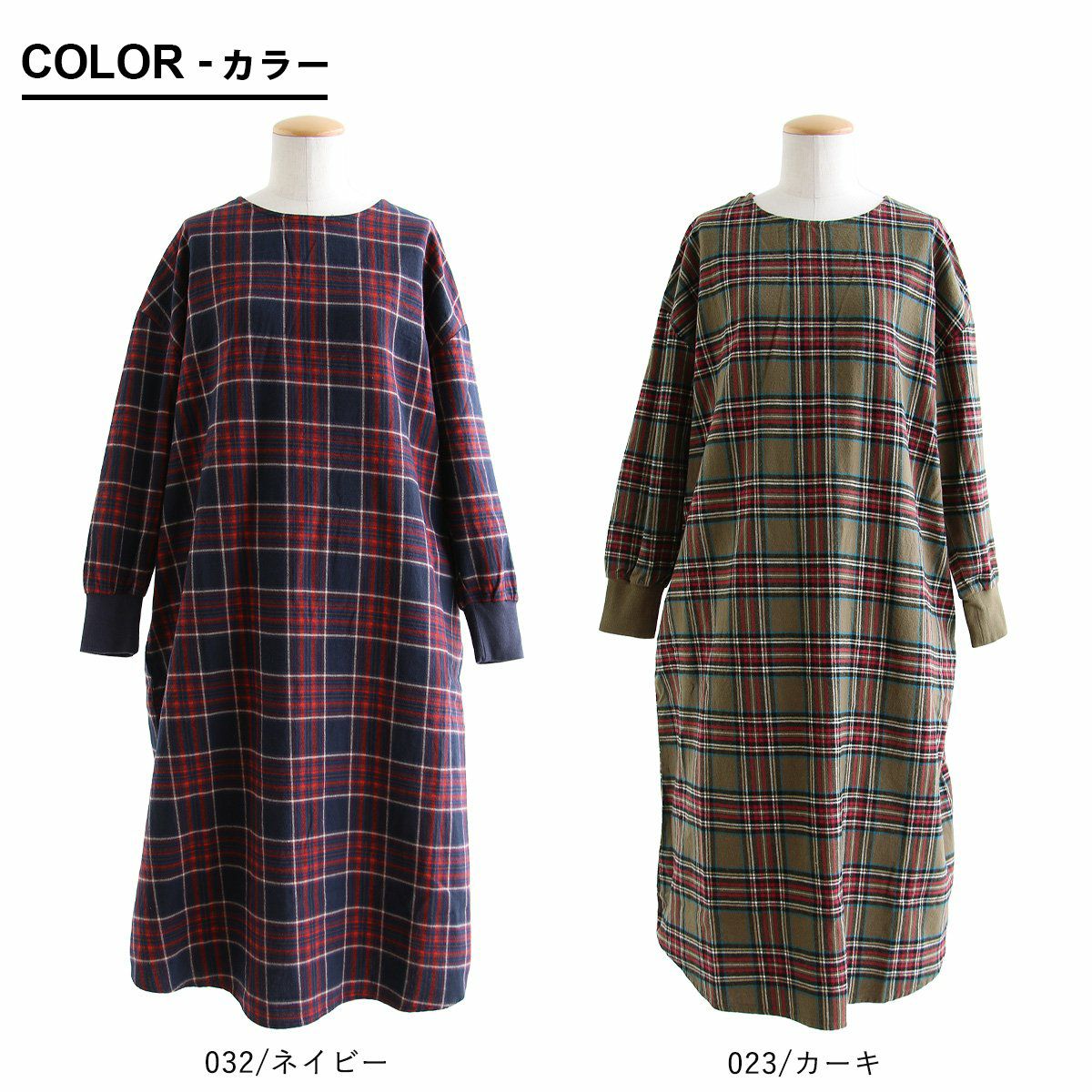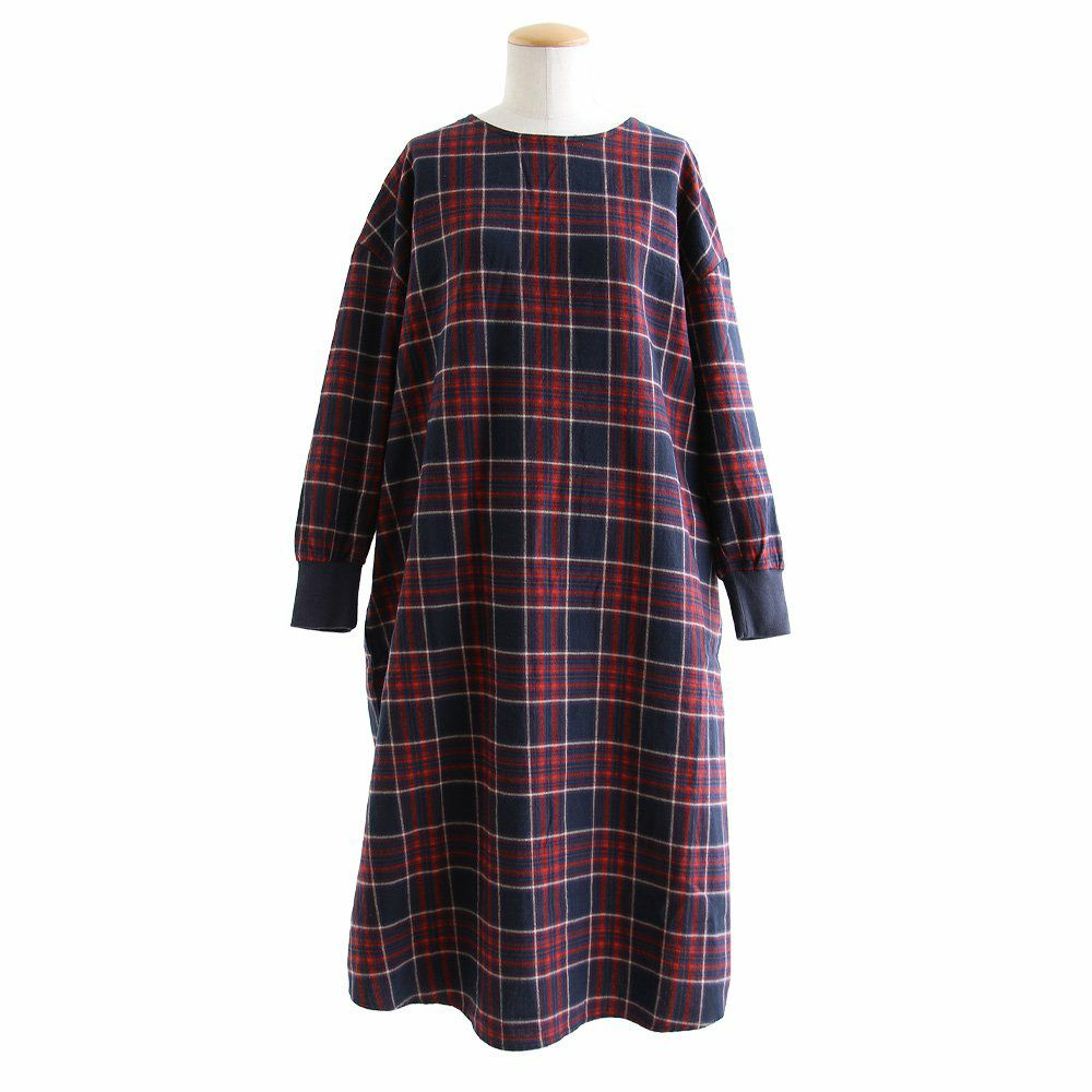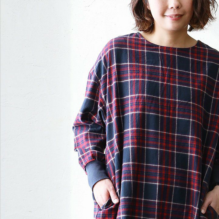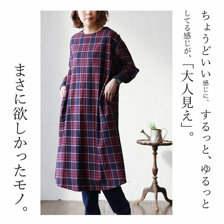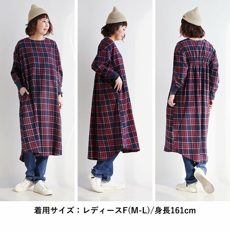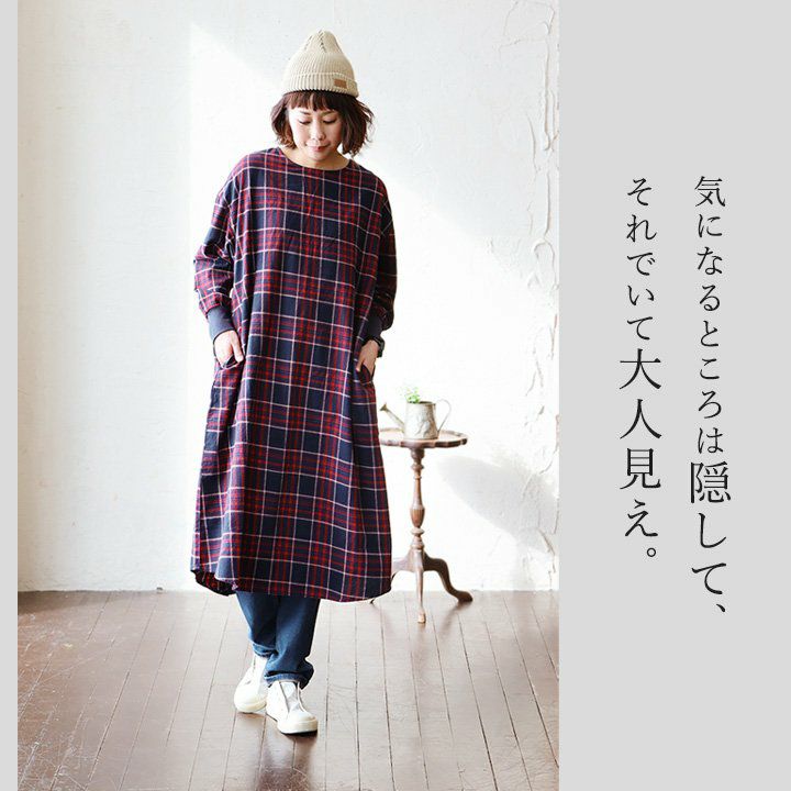 気になるところは隠して、それでいて大人見え。 ワンピース チェック 長袖 レディース リブ袖 ボートネック プルオーバー ワイド 着痩せ お尻 体系 カバー シャツ ロング バックギャザー ネルシャツ カジュアル パティ SAIL セイル