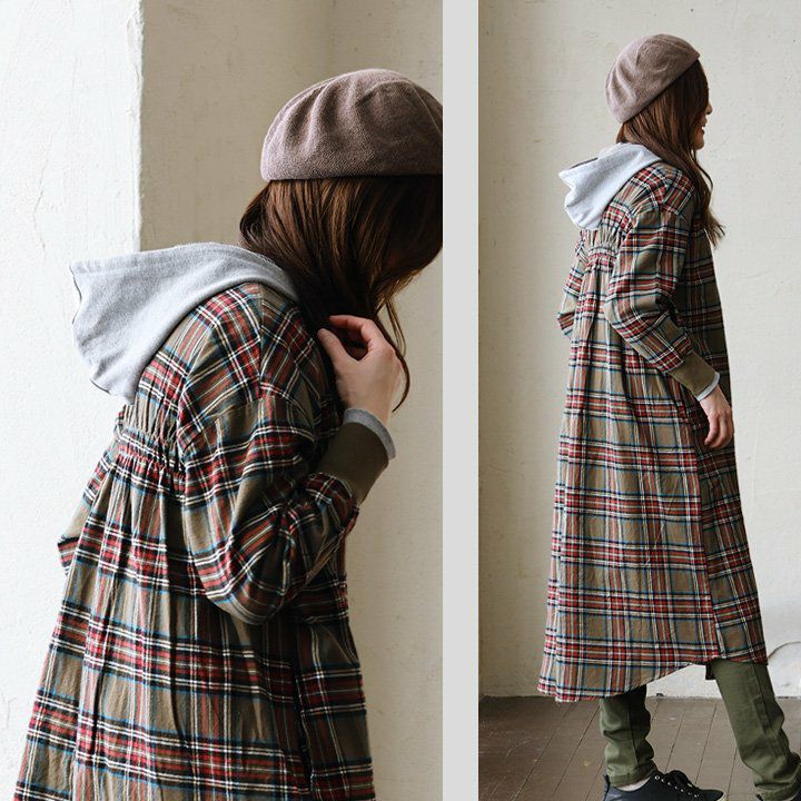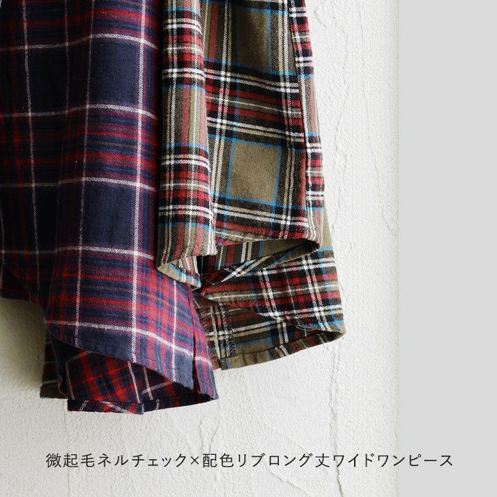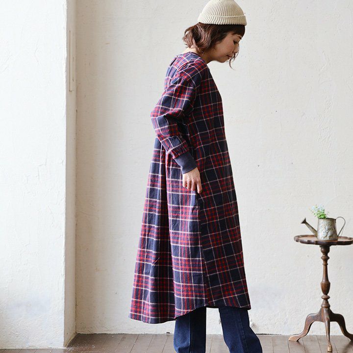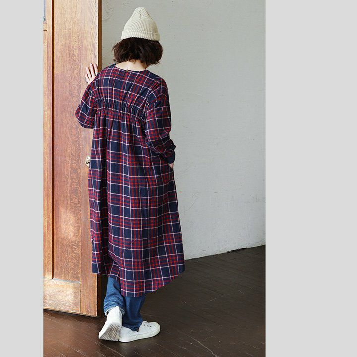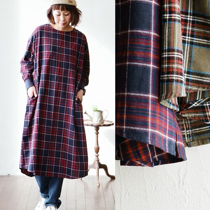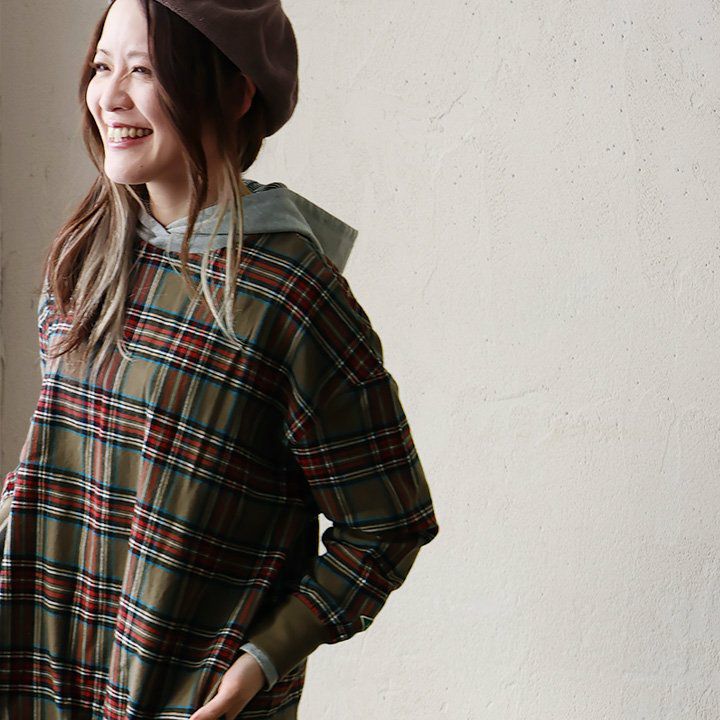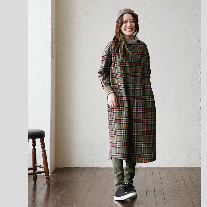 気になるところは隠して、それでいて大人見え。 ワンピース チェック 長袖 レディース リブ袖 ボートネック プルオーバー ワイド 着痩せ お尻 体系 カバー シャツ ロング バックギャザー ネルシャツ カジュアル パティ SAIL セイル