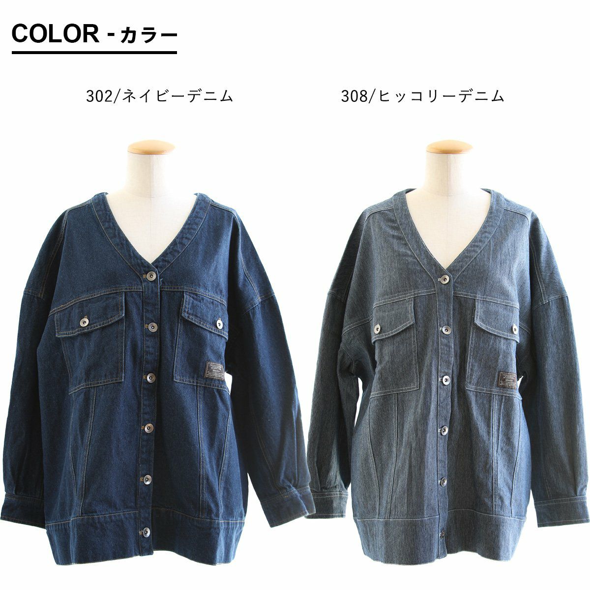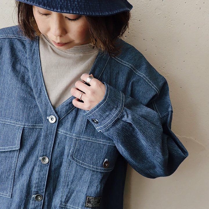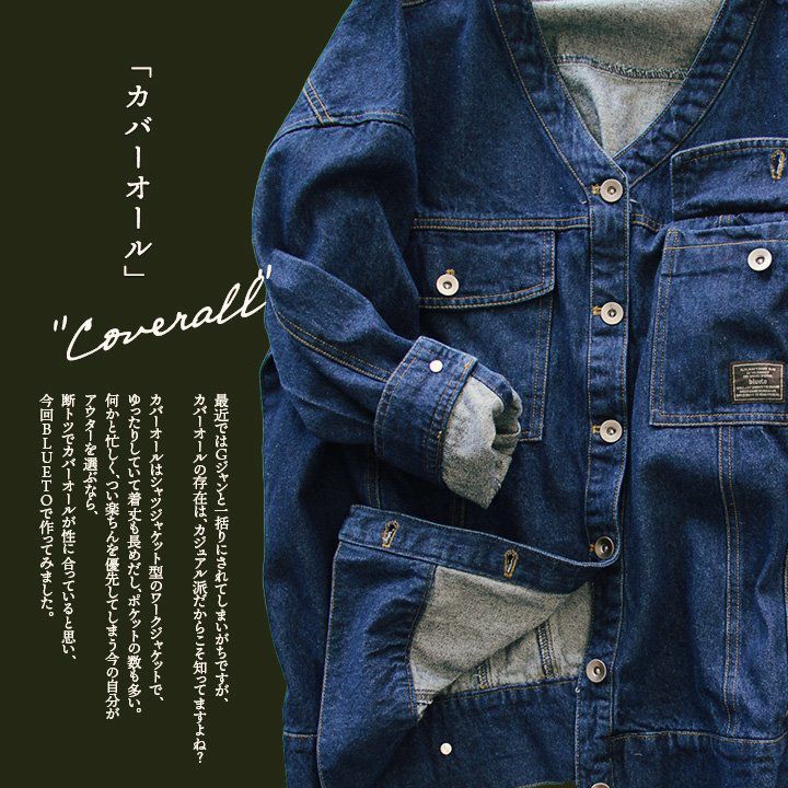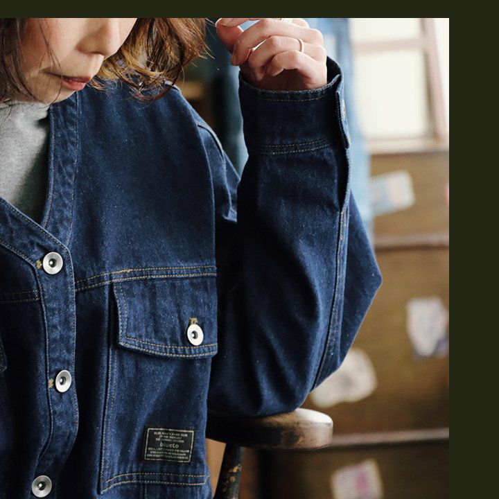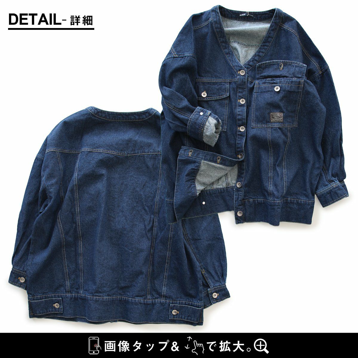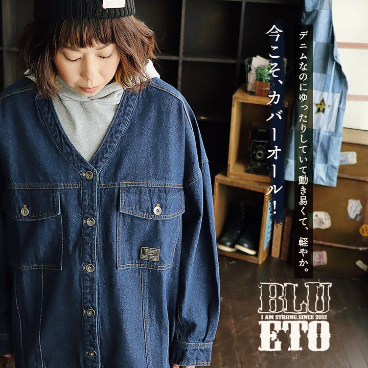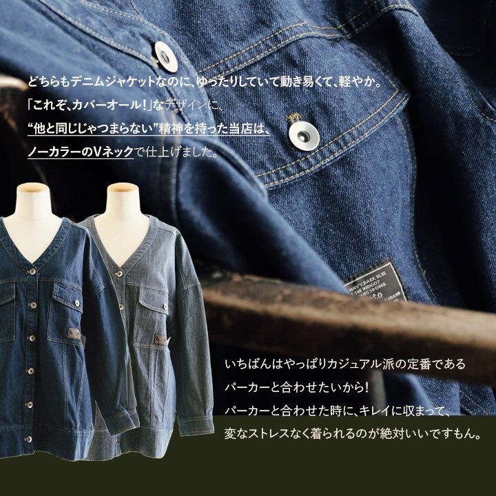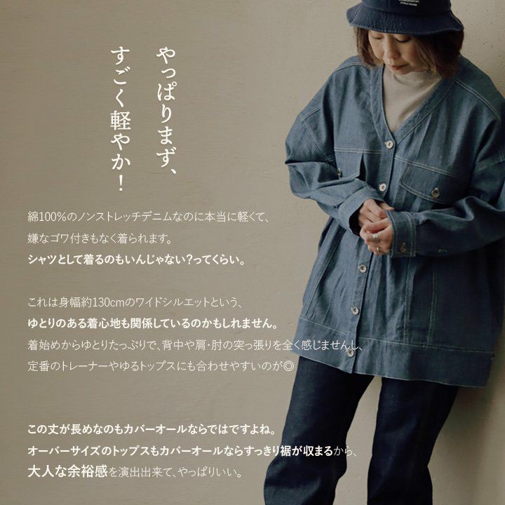 デニムなのにゆったりしていて動き易くて、軽やか。 デニムジャケット レディース 大きめ Gジャン レディース 大きいサイズ オーバーサイズ コットン ノーカラー カバーオール 長袖 カジュアル 大人 おしゃれ シンプル 春 秋 PATY パティ BLUETO ブルート
