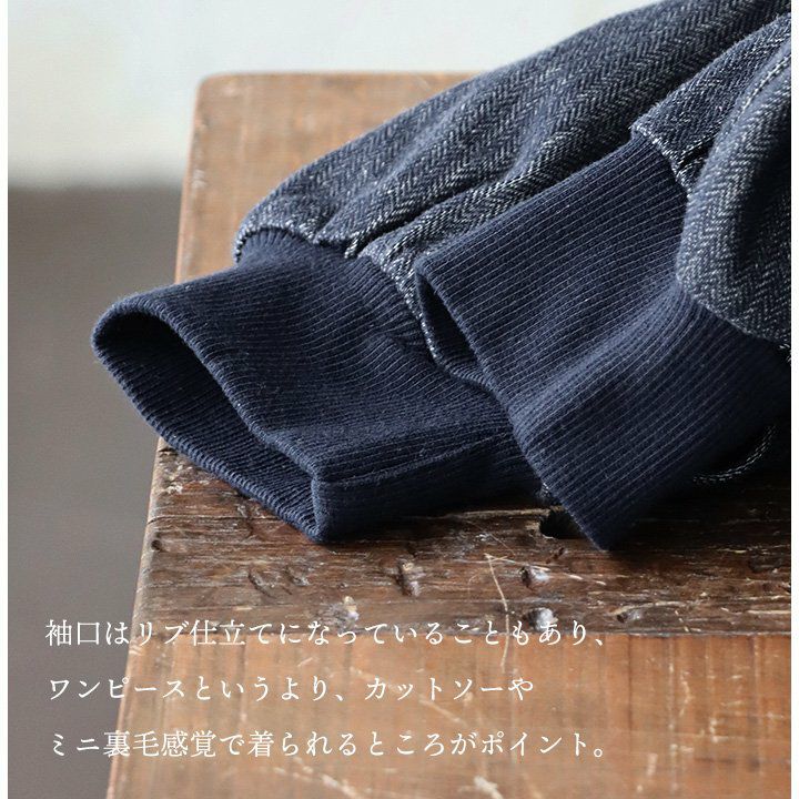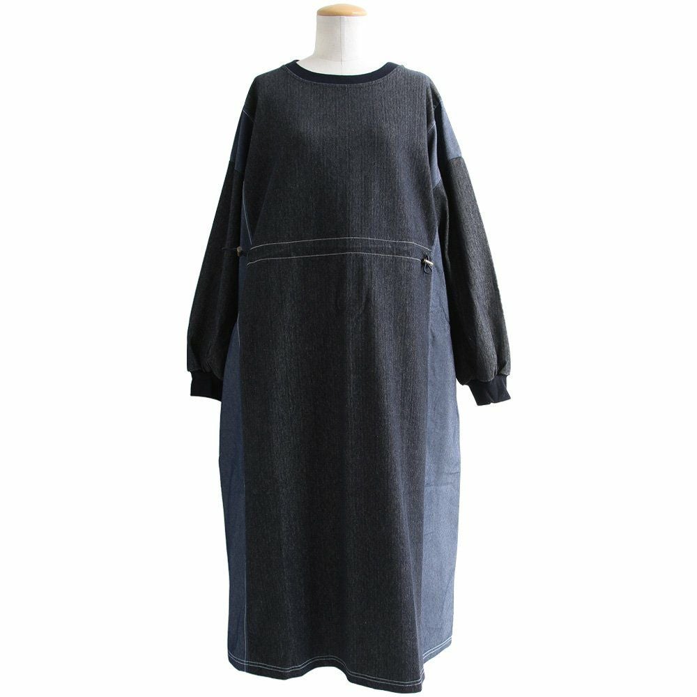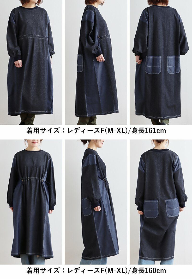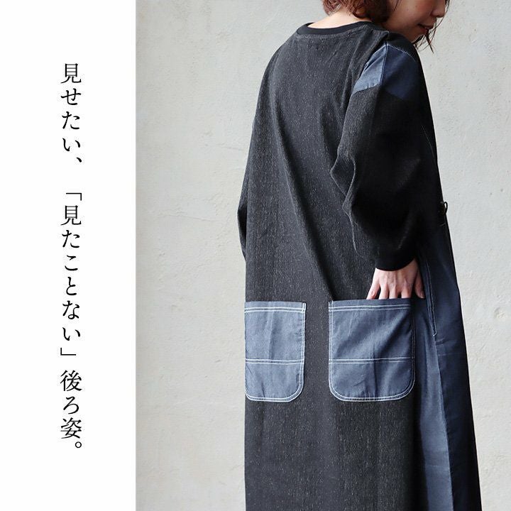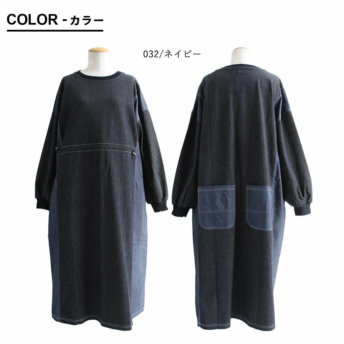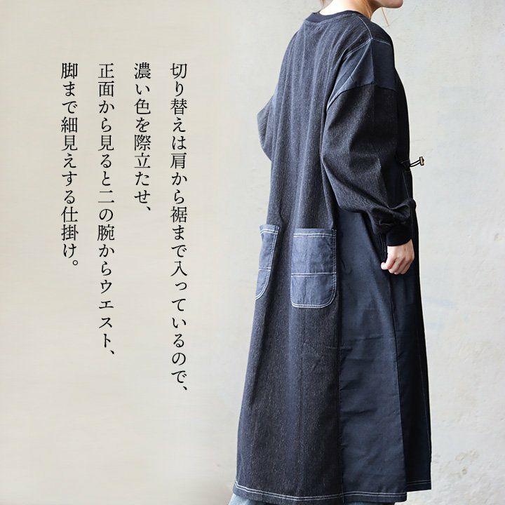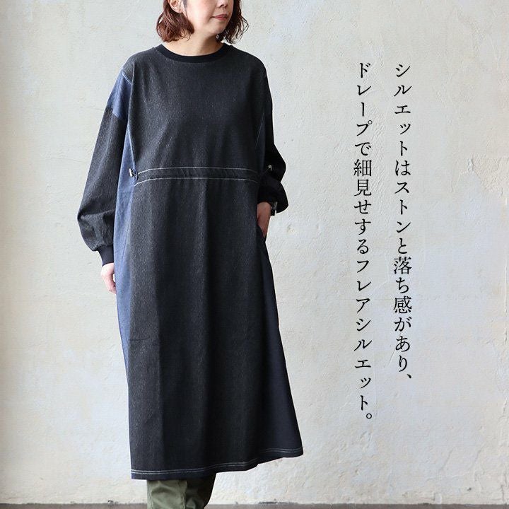 見せたい、「見たことない」後ろ姿。 ワンピース ワンピ 長袖 レディース 着痩せ ストレッチ カットデニム 布帛 切り替え クルーネック 袖リブ 配色ステッチ ポケット 伸縮性 ゆったり 体型カバー 春 パティ BLUETO ブルート