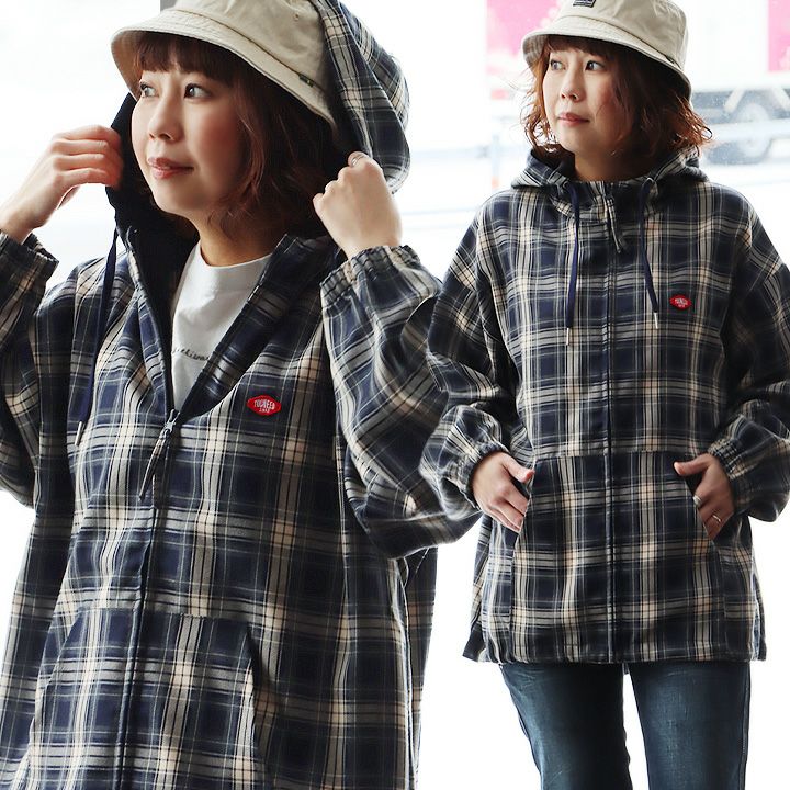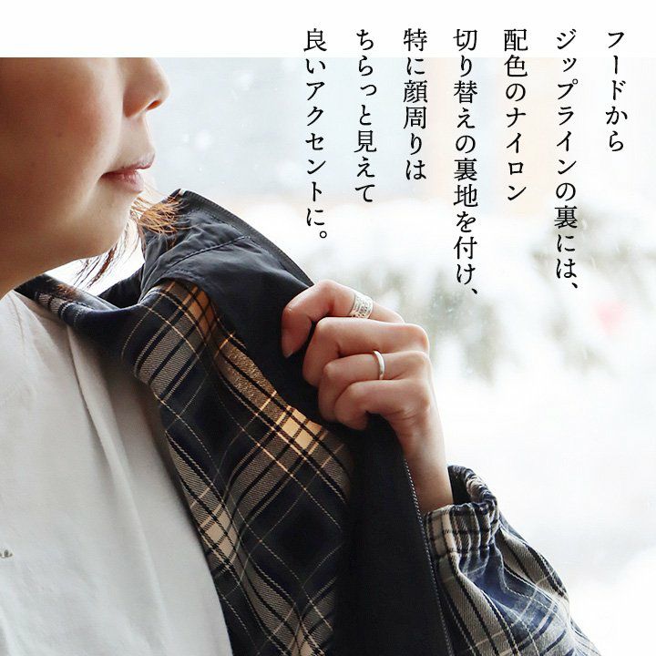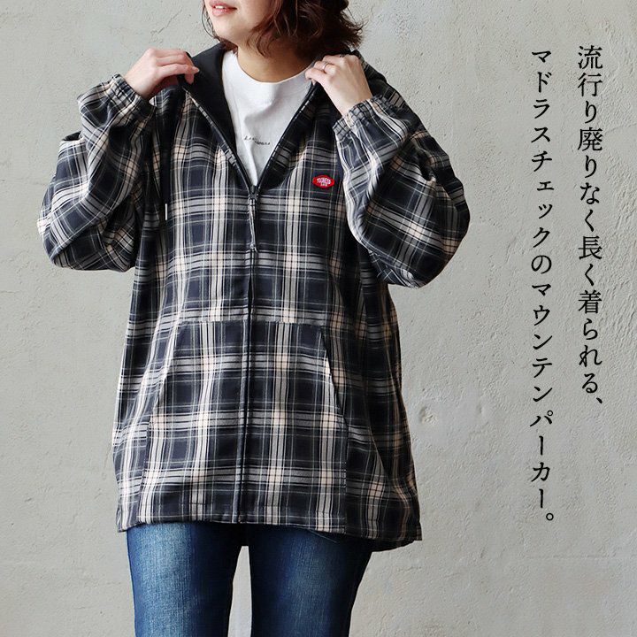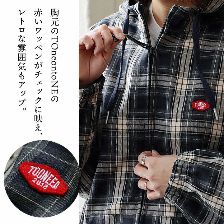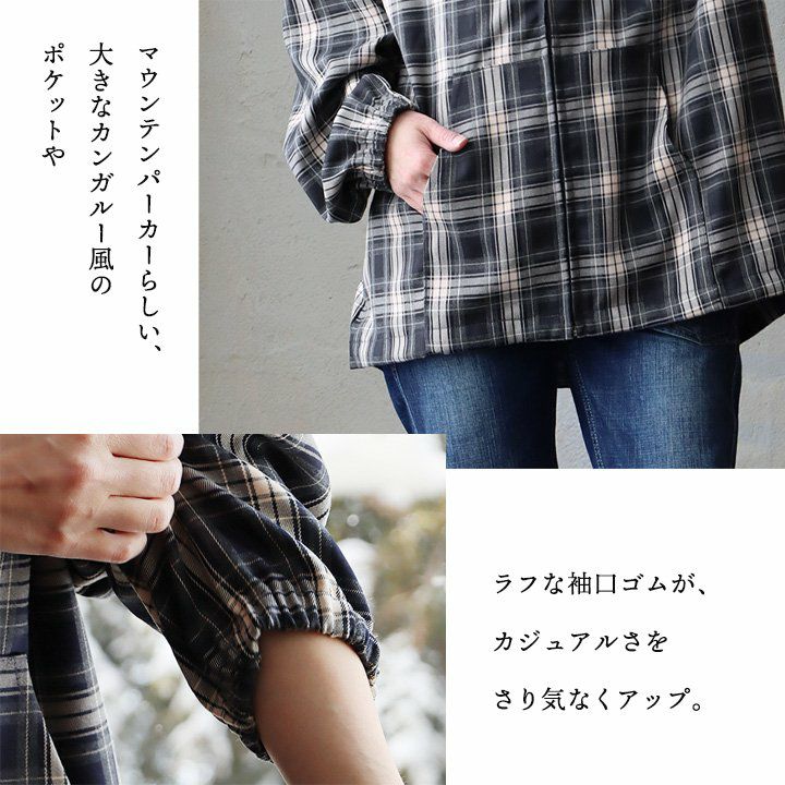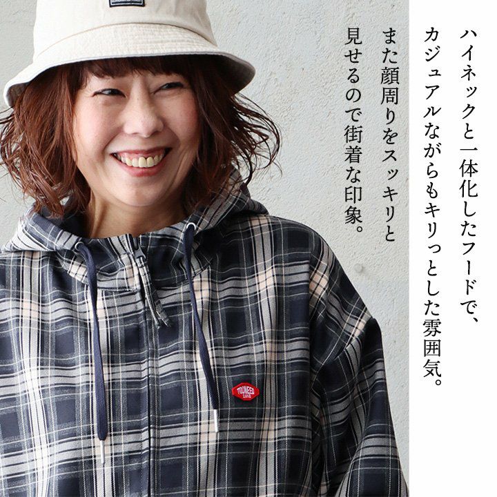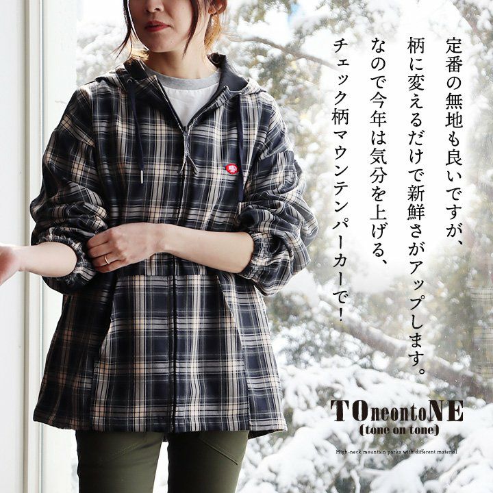 着せるの変わり目や、ちょっとした羽織りが欲しい時に。 マウンテンパーカー 長袖 レディース すっきり 着やせ ワイド サラサラ 薄手 軽い チェック柄 ギンガム ハイネック 袖口ゴム ポリエステル ナイロン シャツパーカー カジュアル パティ TOneontoNE トーン