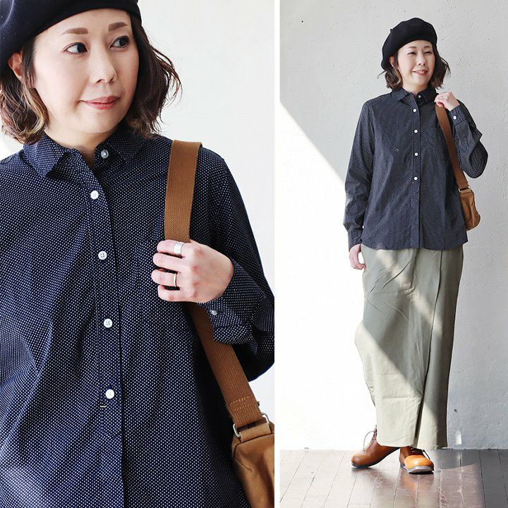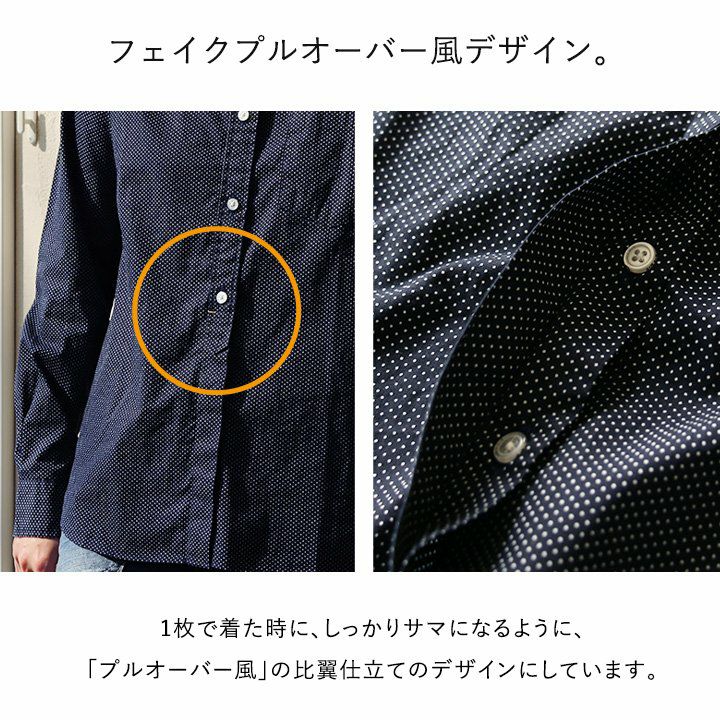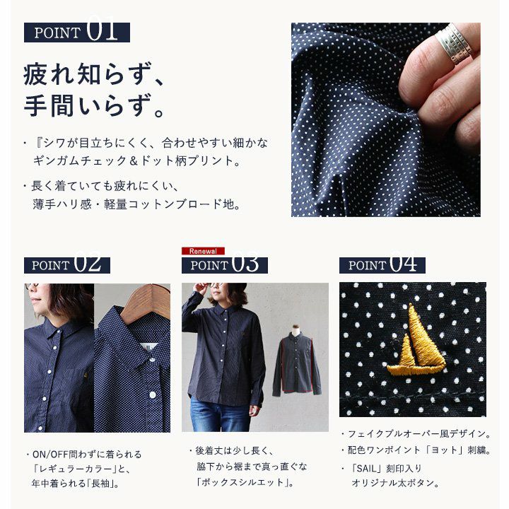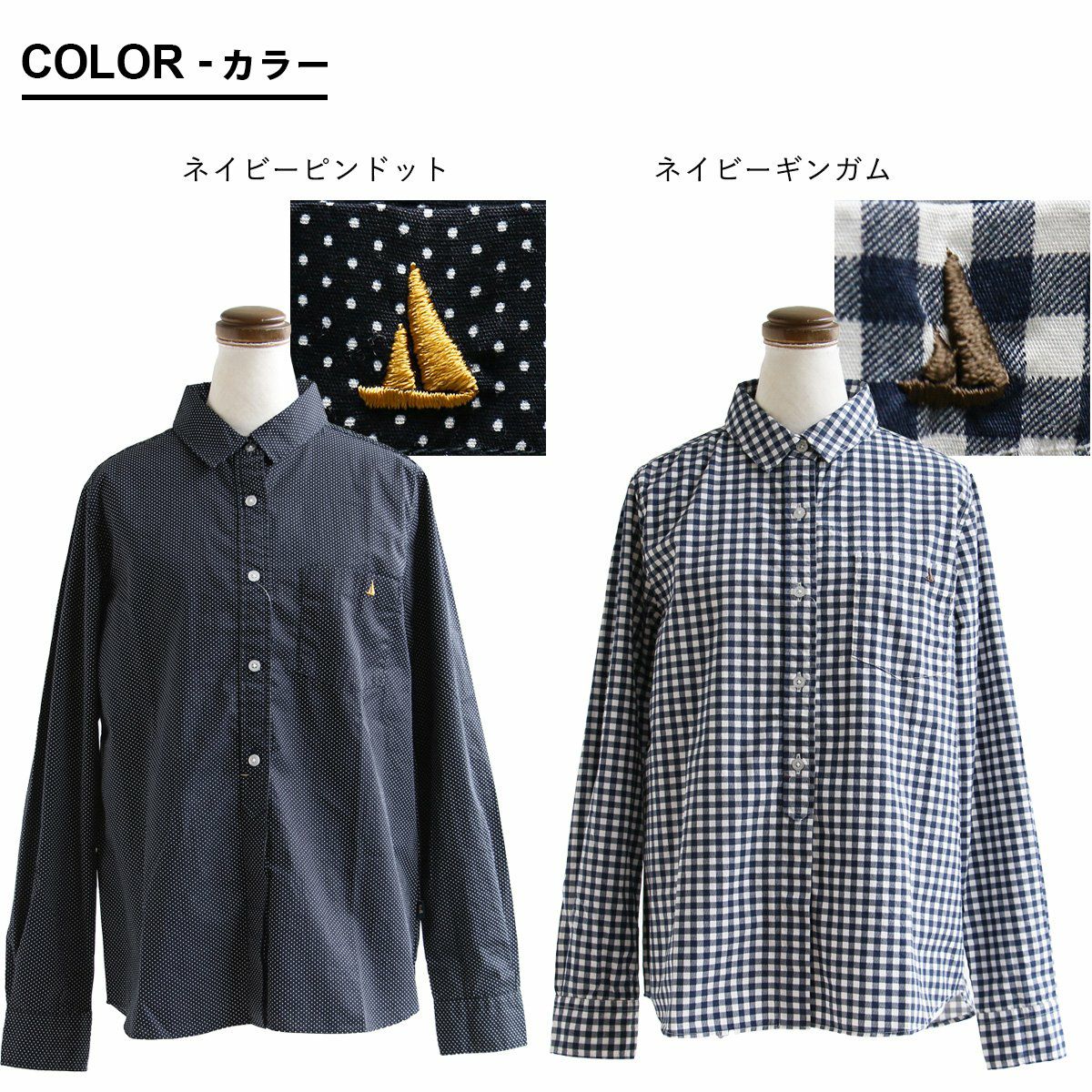 着るだけで「こなし上手」。大人パターンの「着痩せ」シャツ。 シャツ レディース 長袖 日本製 レギュラーカラー 長袖シャツ 綿100% コットン ドット 水玉 ギンガム 春 夏 秋 冬 ノーアイロン ブランド 刻印 つばめ 刺繍 プルオーバー デザイン すっきり 着痩せ 大人 30代 40代 50代 60代 SAIL セイル