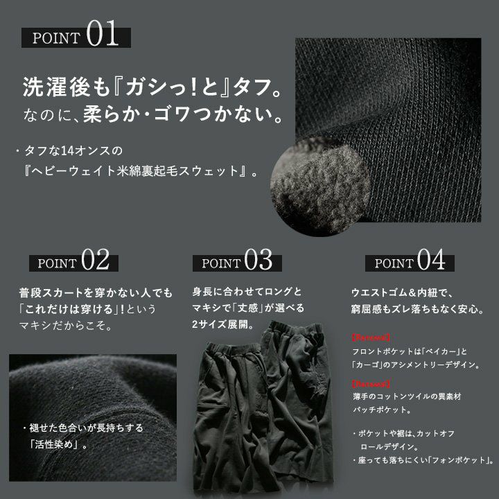 「スウェット」なのに、雰囲気があって、媚びない感じ。 スカート 選べる マキシ ロング レディース スウェット 暖かい 裏起毛 USAコットン 綿100 異素材切り替え ベイカーポケット ウエストゴム 内紐 スマホポケット 色合い 活性染め かっこいい 大人 カジュアル パティ OAR’S オールズ