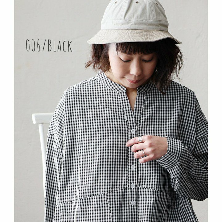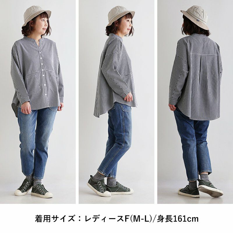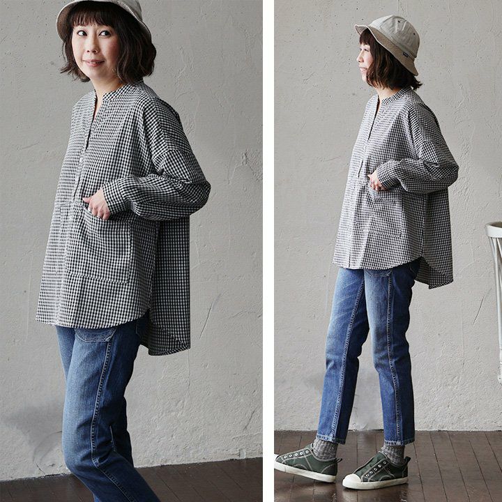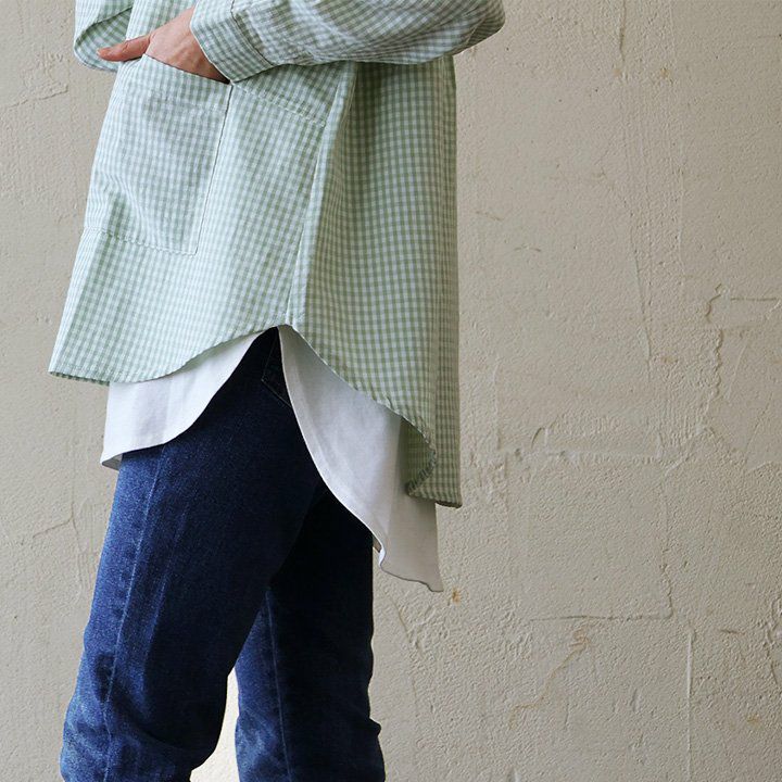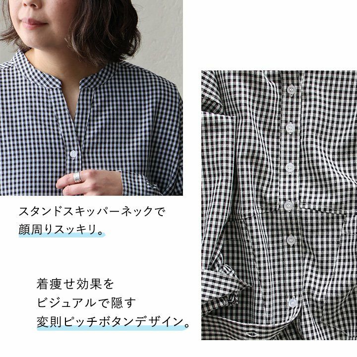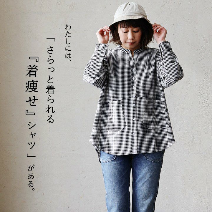 わたしには、「さらっと着られる『着痩せ』シャツ」がある。 シャツ チュニック 長袖 レディース スタンド スキッパーネック ツイル ギンガム チェック 着痩せ 裁断 お尻が隠れる フレア ワイド 変則ピッチボタン 軽い 無地 パティ SAIL セイル