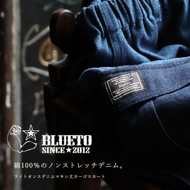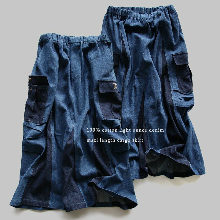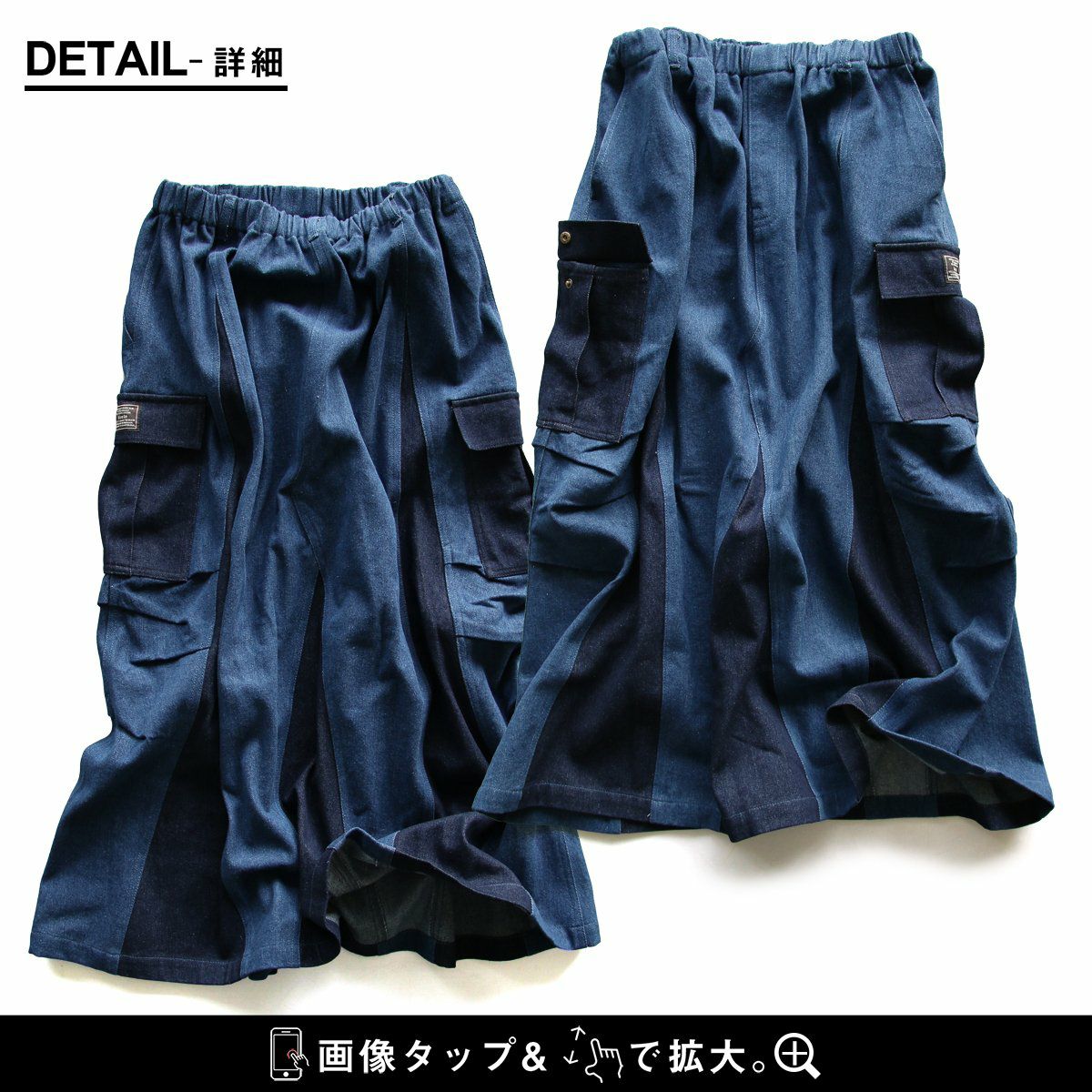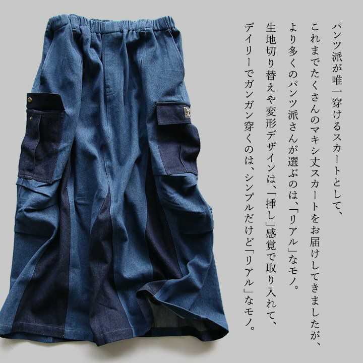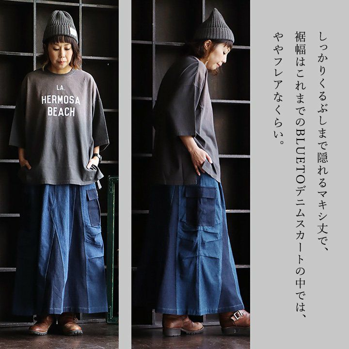 生地も加工もデザインも、「リアル」だからカッコいい。 デニム スカート マキシ丈スカート マキシスカート フレア Aライン ロングスカート 無地 デニムスカート カーゴ ポケット サイドベルト ウエストゴム レディース 大きいサイズ ゆったり かっこいい 大人 PATY パティ BLUETO ブルート