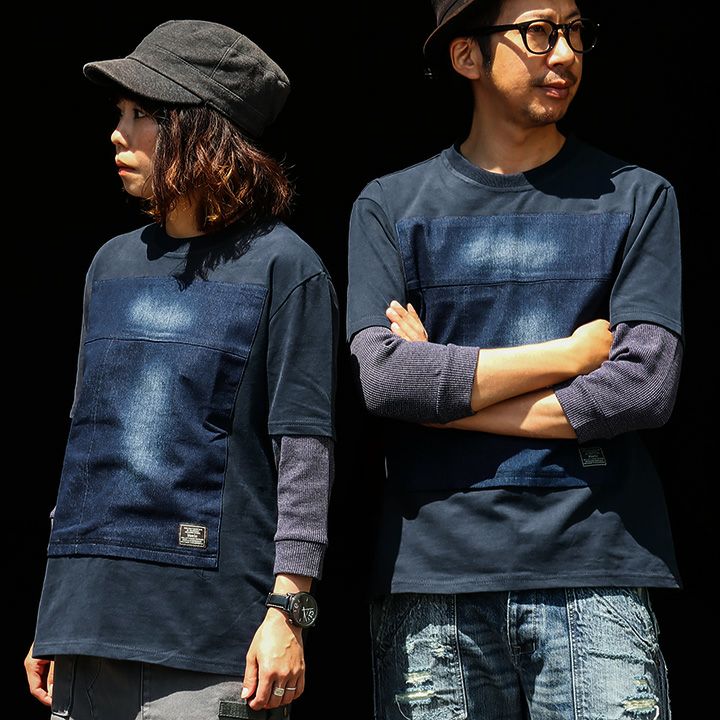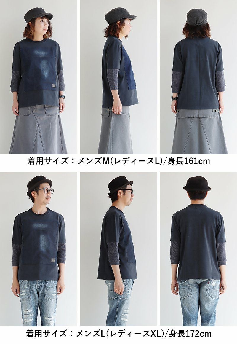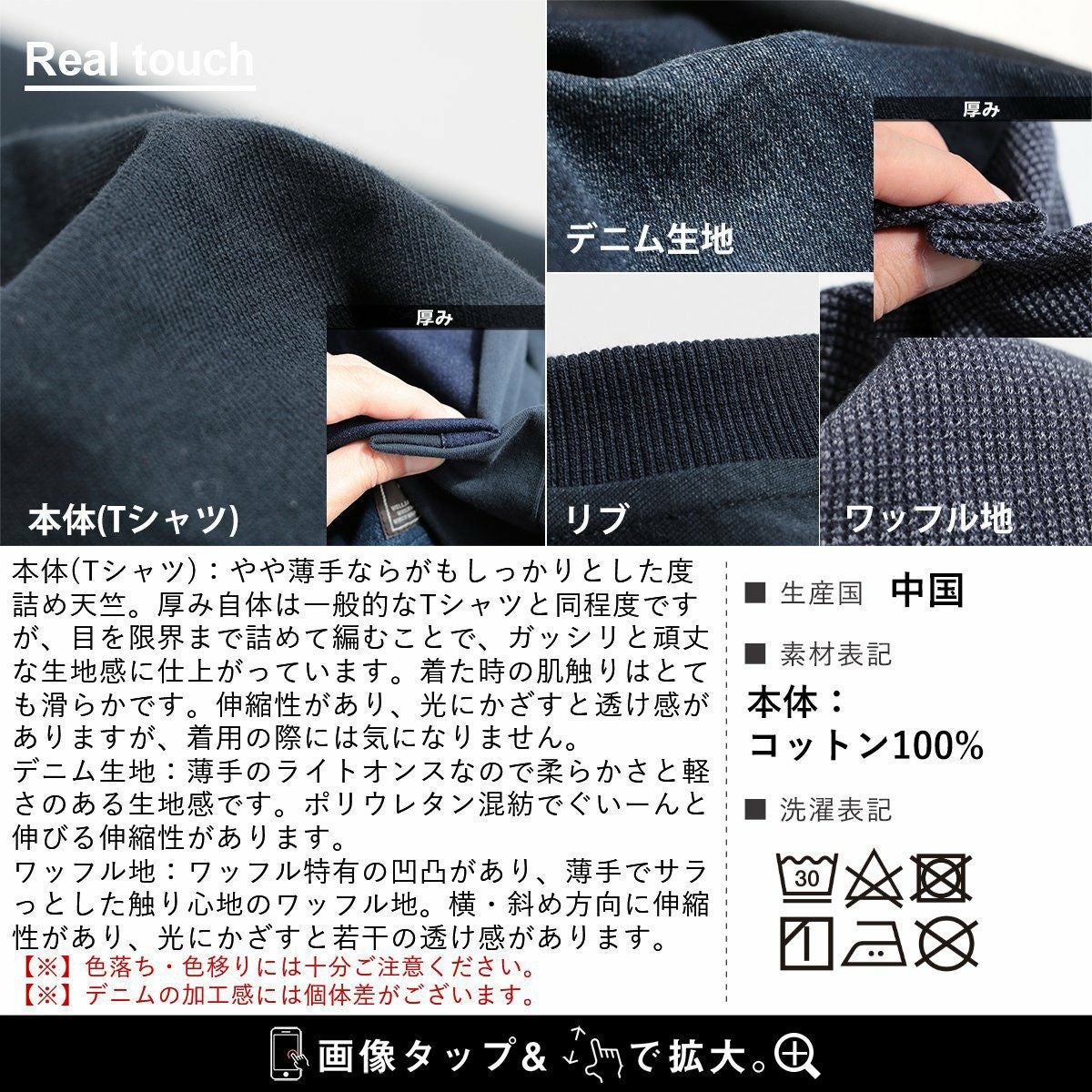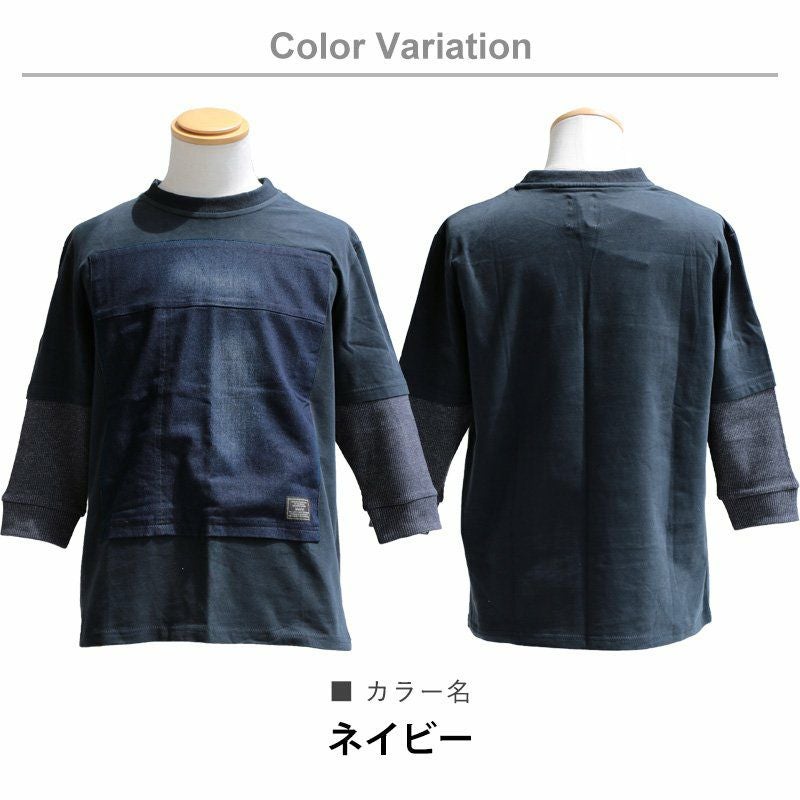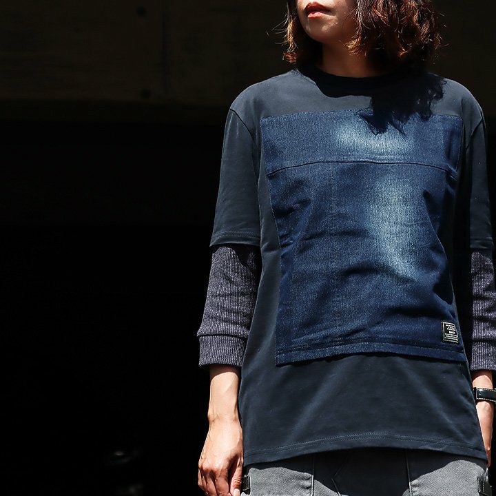 一瞬で、服好きマニア。 七分袖 tシャツ メンズ レディース フェイクレイヤード 綿100% コットン ストレッチ デニム カットソー 重ね着 かっこいい おしゃれ 異素材 切り替え ネイビー 青 紺 春 春服 PATY BLUETO ブルート