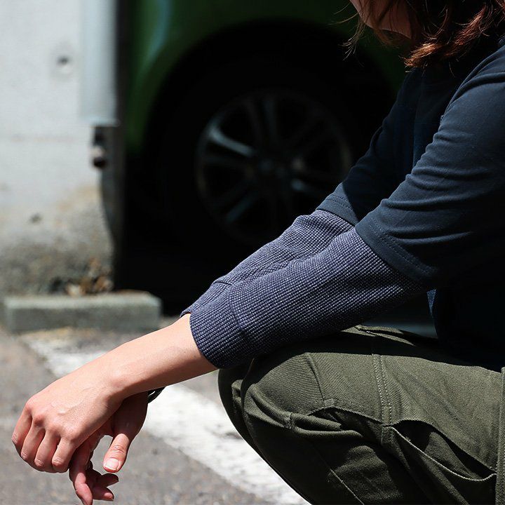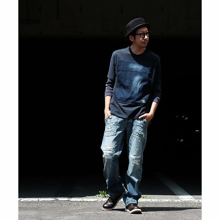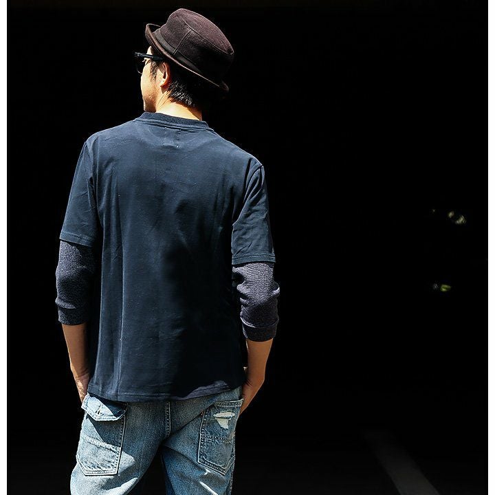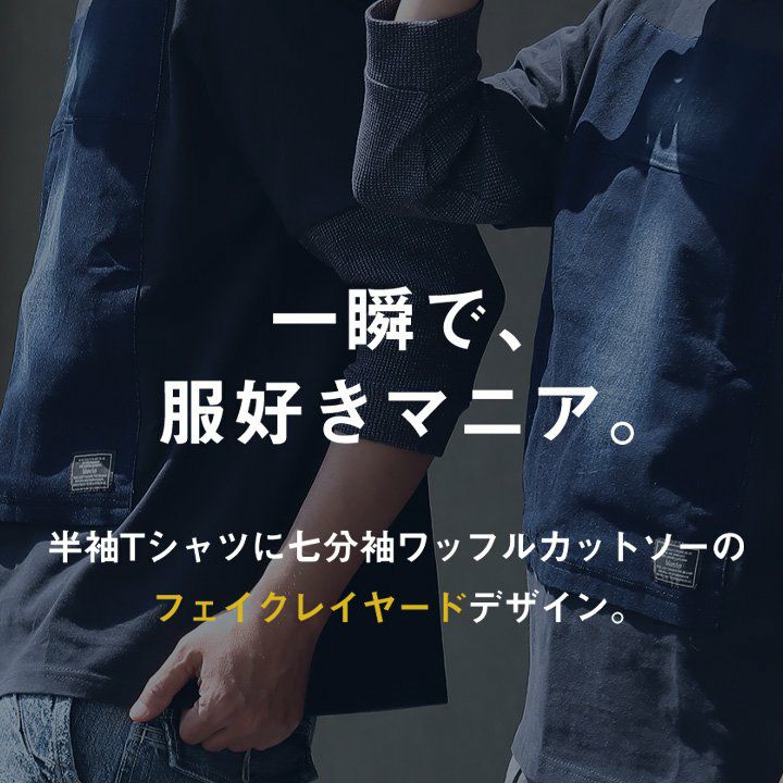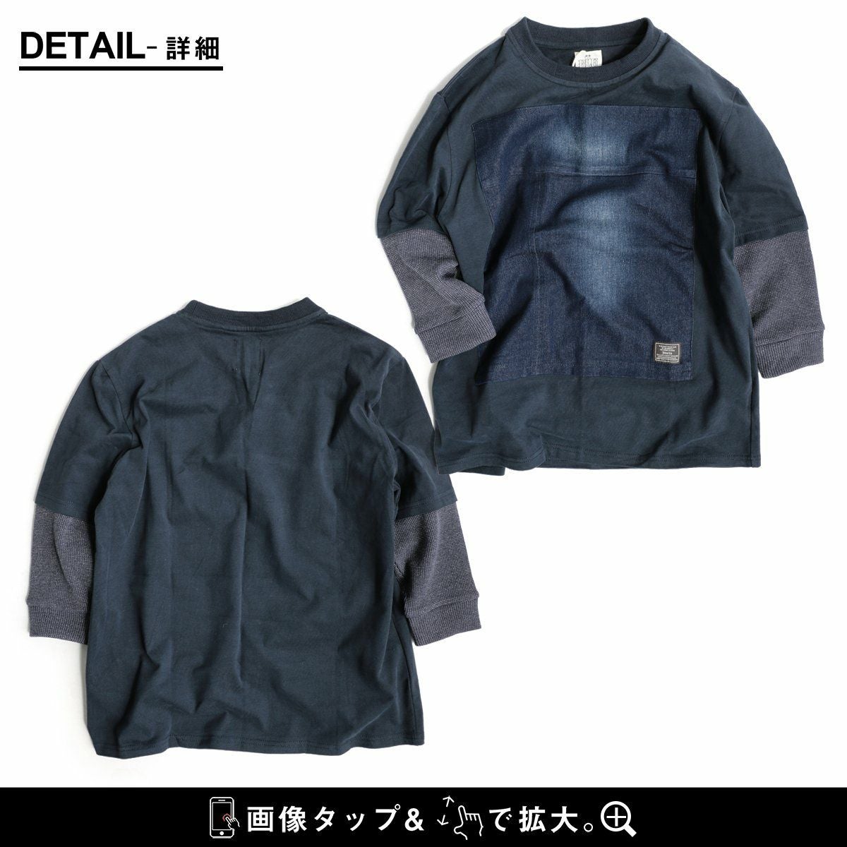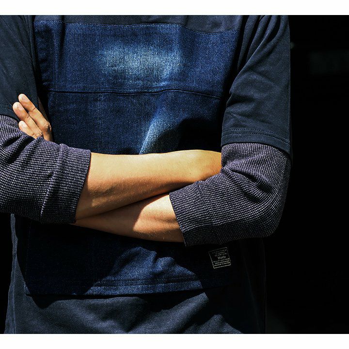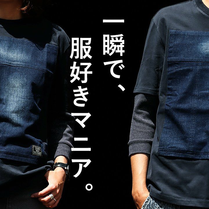 一瞬で、服好きマニア。 七分袖 tシャツ メンズ レディース フェイクレイヤード 綿100% コットン ストレッチ デニム カットソー 重ね着 かっこいい おしゃれ 異素材 切り替え ネイビー 青 紺 春 春服 PATY BLUETO ブルート