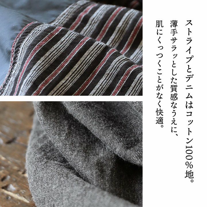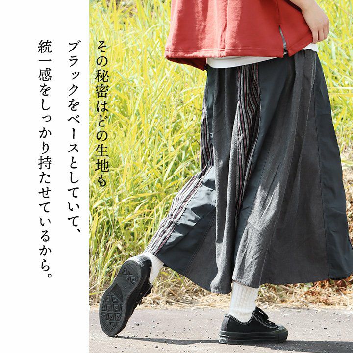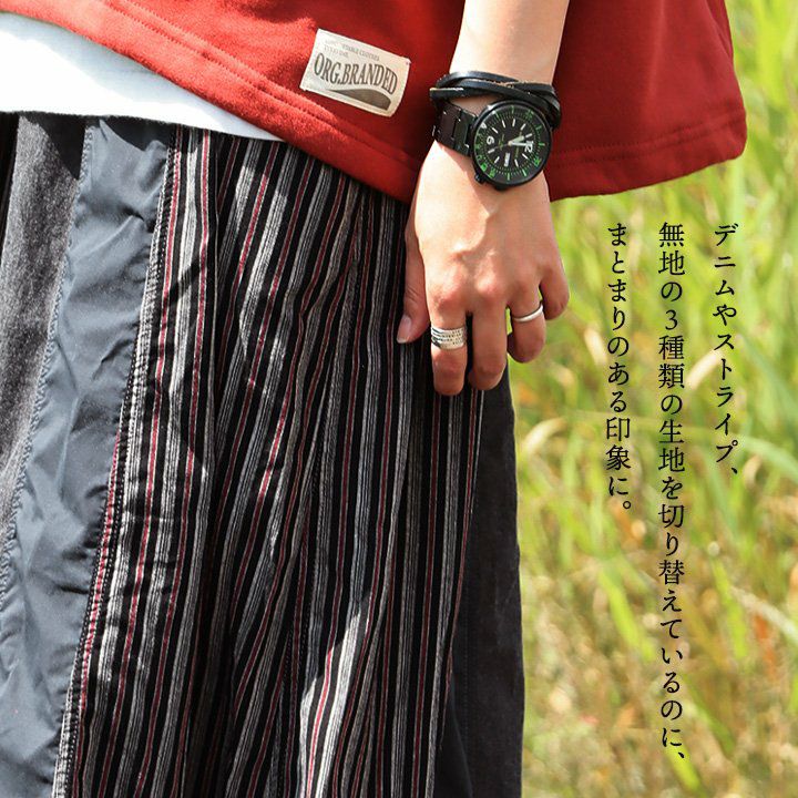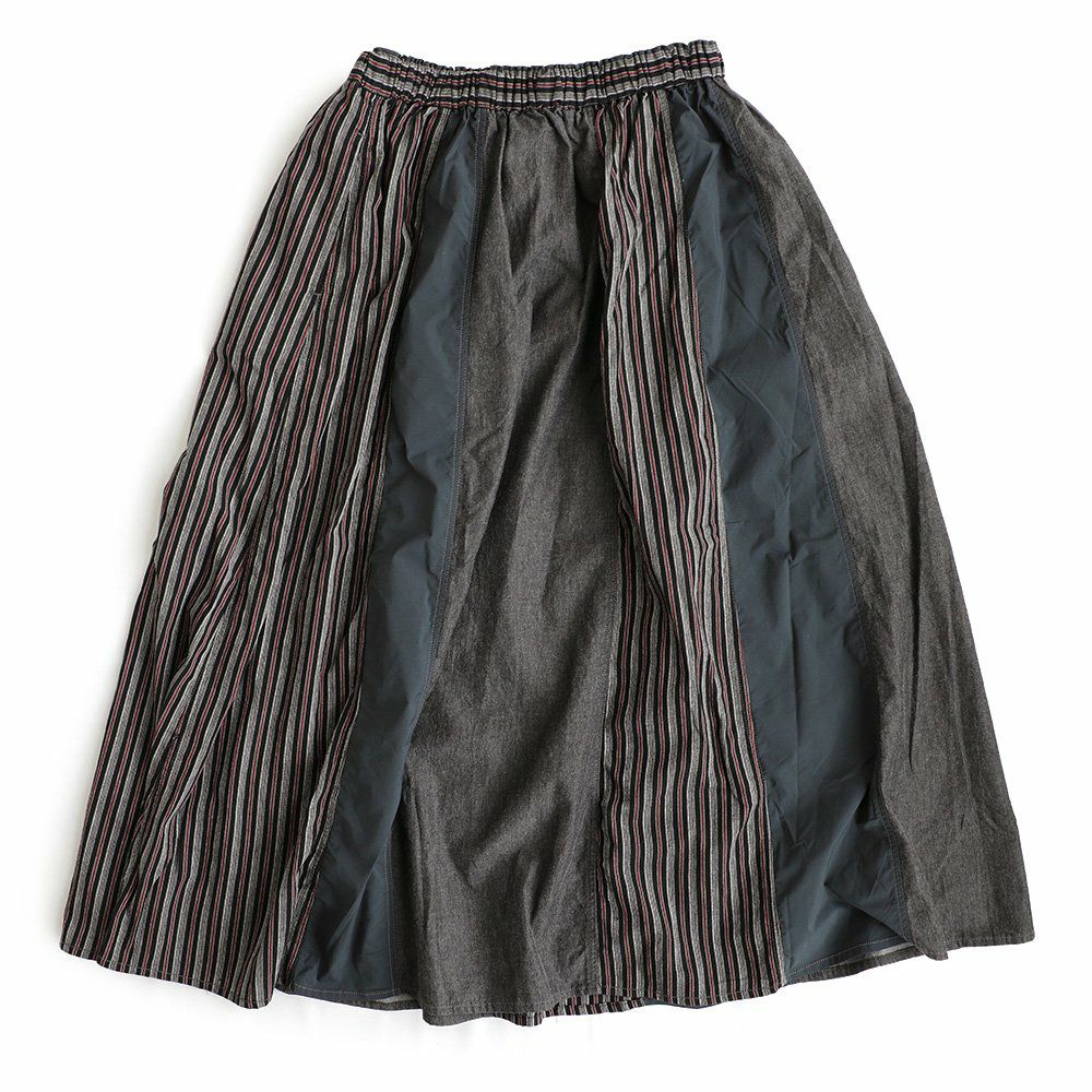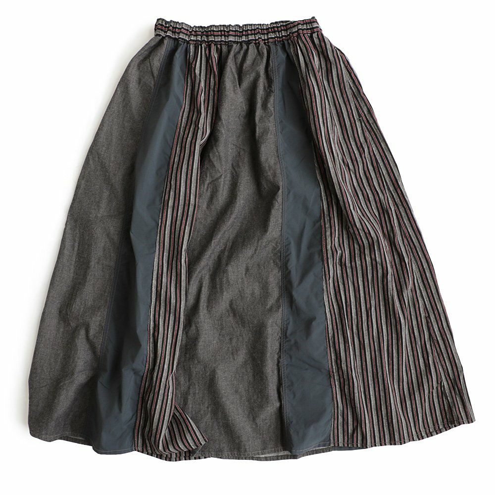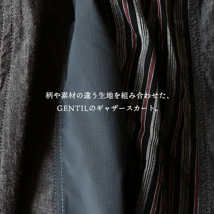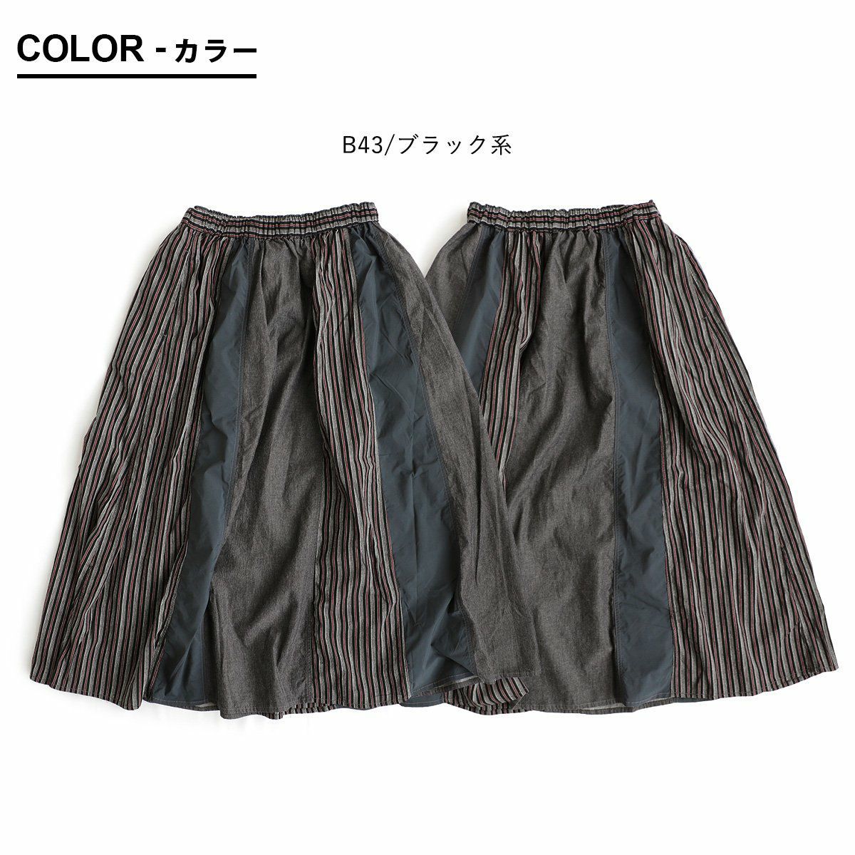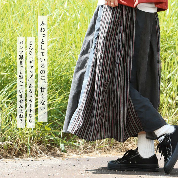 ふわっとしてるのに、甘くない、この「ギャップ」。 スカート ギャザースカート レディース ロング丈 異素材切り替え 配色 ストライプ 無地 綿100 コットン デニム ウエストゴム ゆったり 大きいサイズ 体型カバー カジュアル 春 夏 秋 パティ GENTIL ジャンティ