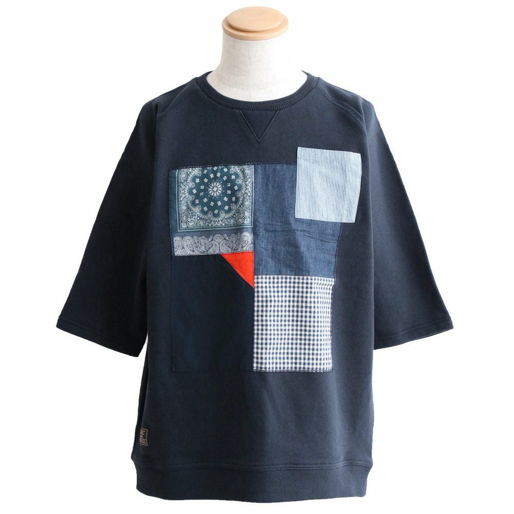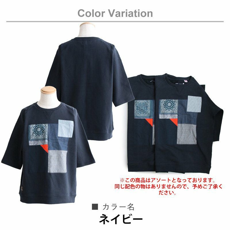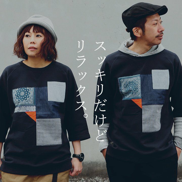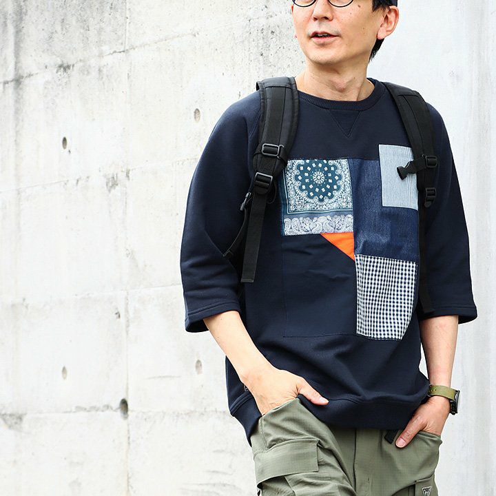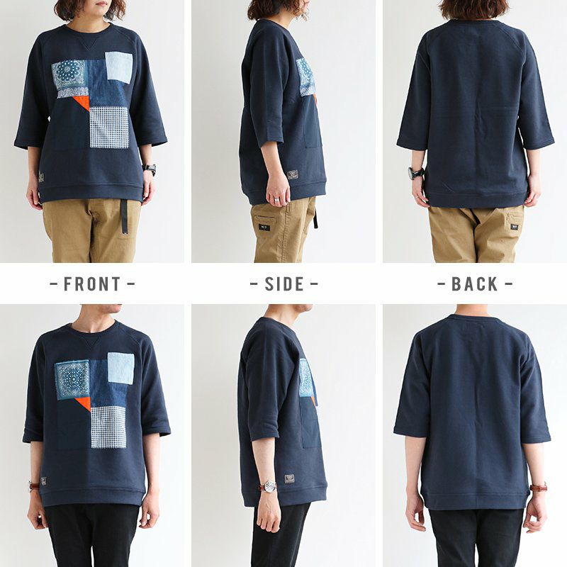 控えめなのに、他のどのトレーナーよりも断トツの存在感。 トレーナー 6分袖 七分袖 半端袖 プルオーバー スウェット スエット ラグラン 『異素材 パッチワーク』 メンズ レディース トップス 40代 50代 BLUETO [ブルート]