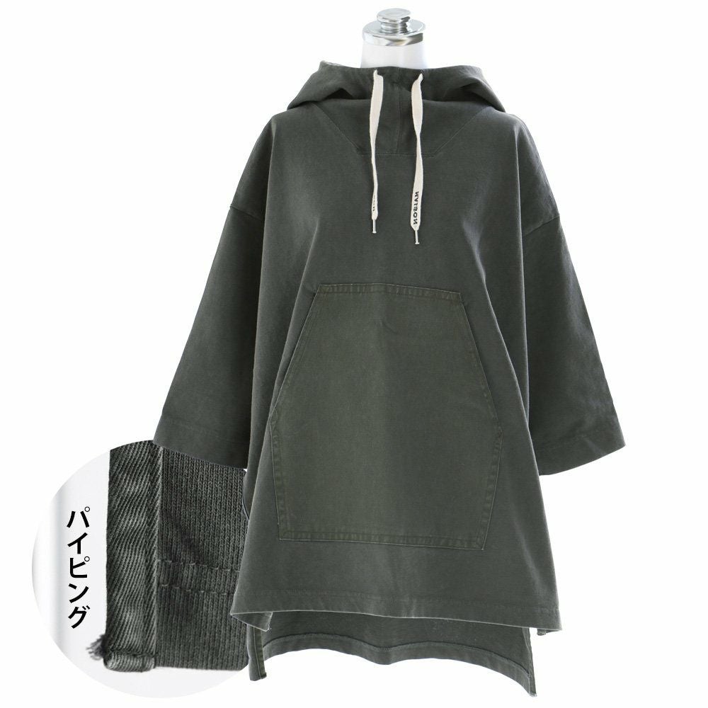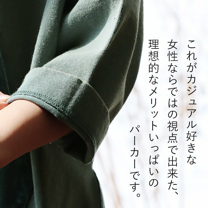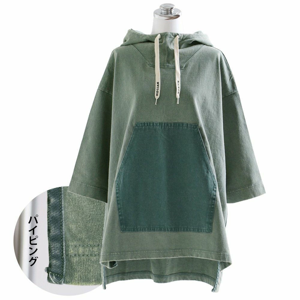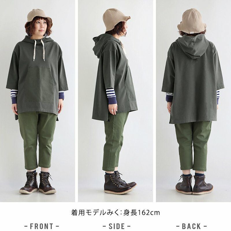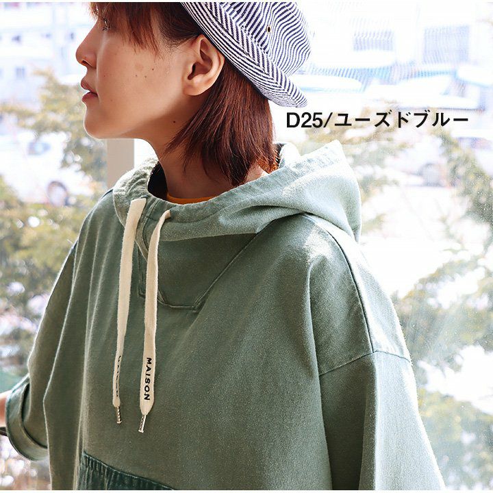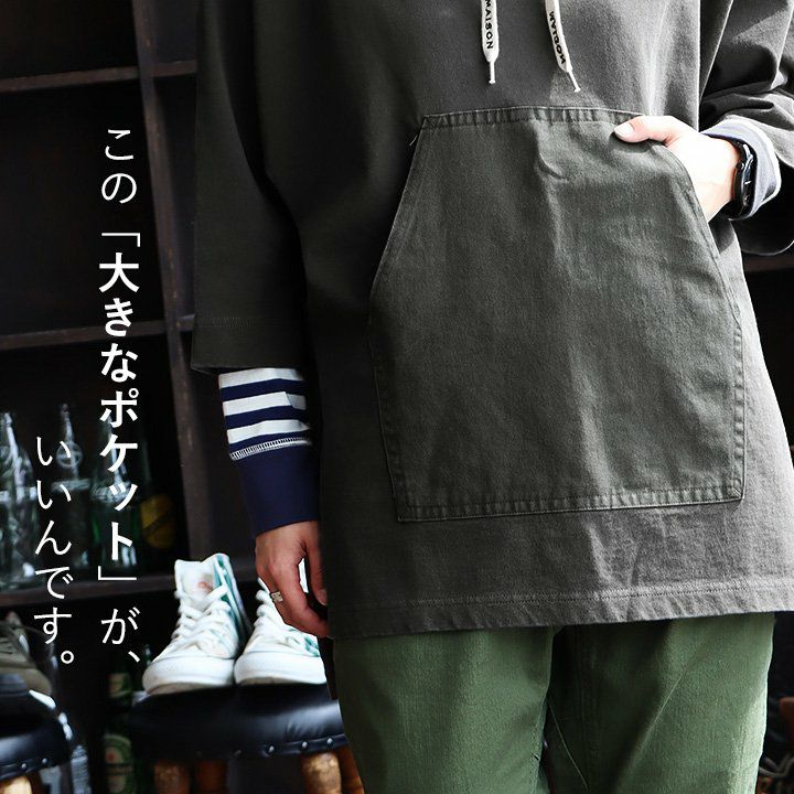 この「大きなポケット」が、いいんです。 パーカー プルオーバー ゆるハイネック ワイド 七分袖 褪せ色 バイオウォッシュ 度詰め天竺 布帛ポケット切替 サイドスリット ロゴ刺繍フード紐 レディース 着痩せ トップス 40代 50代 春 OAR'S [オールズ]