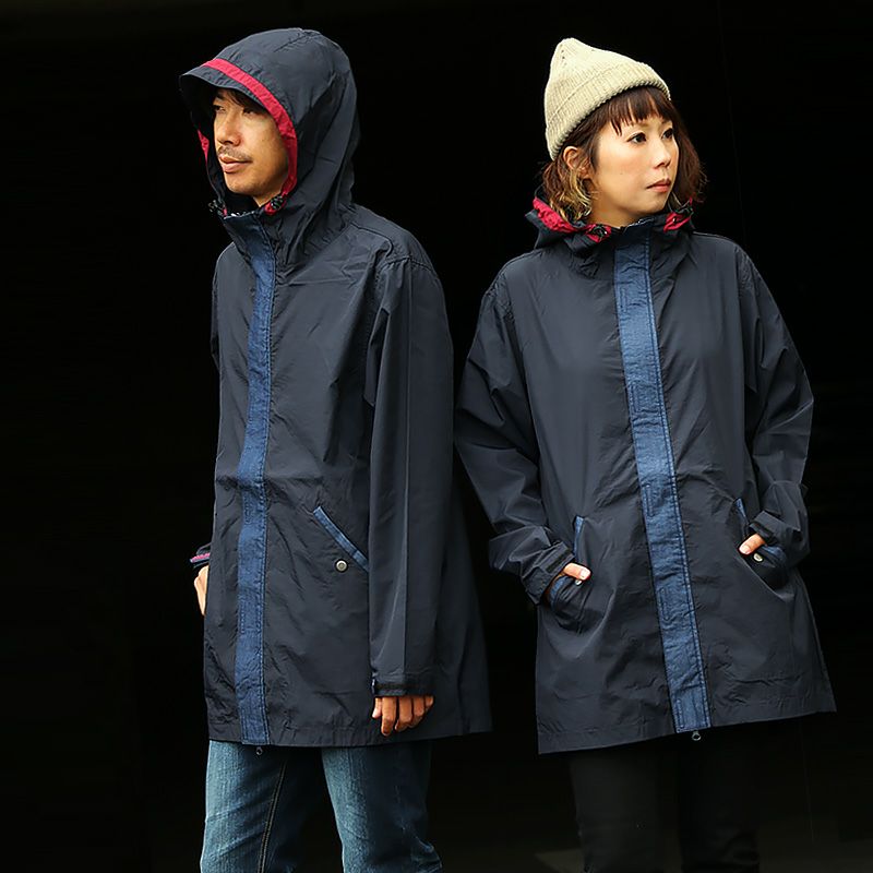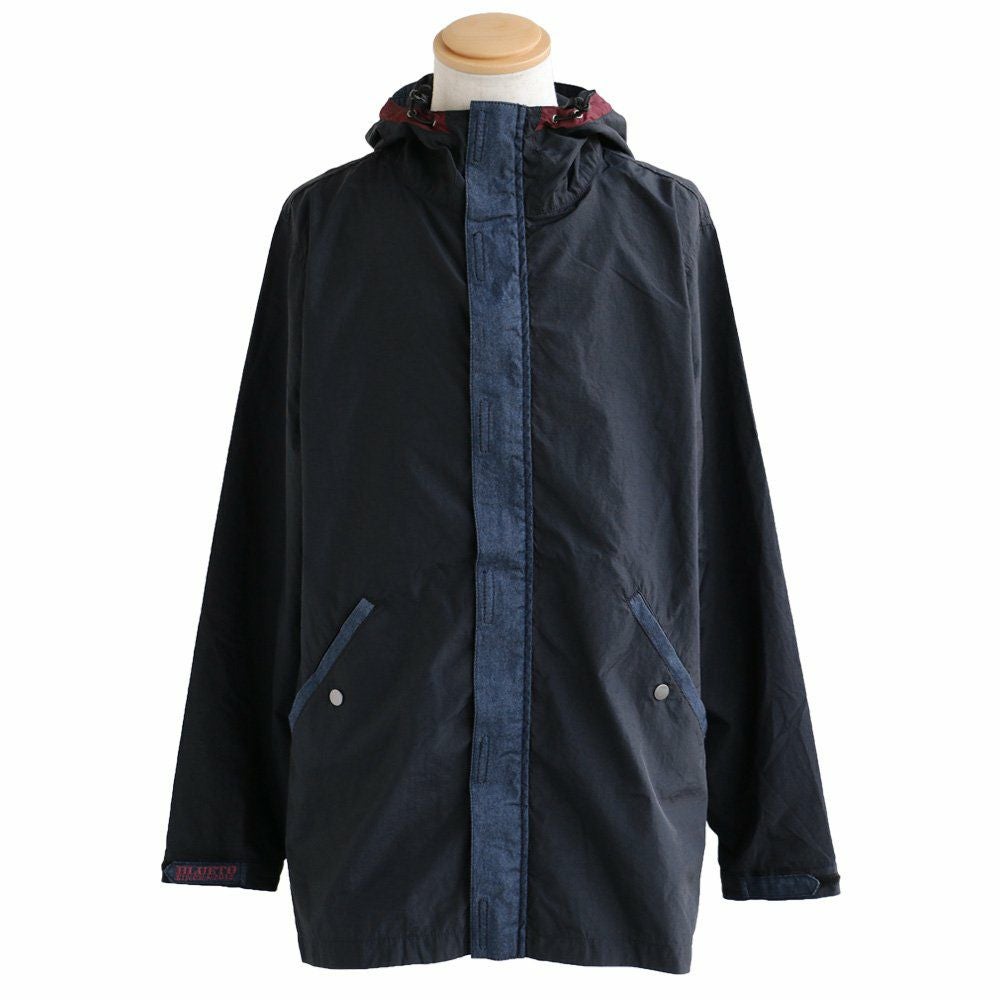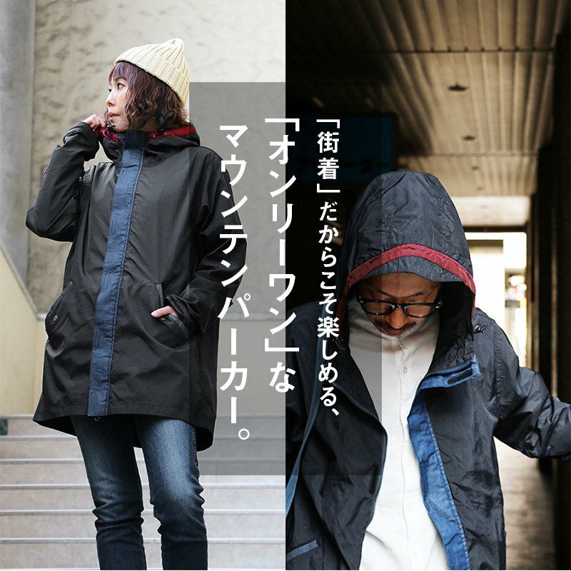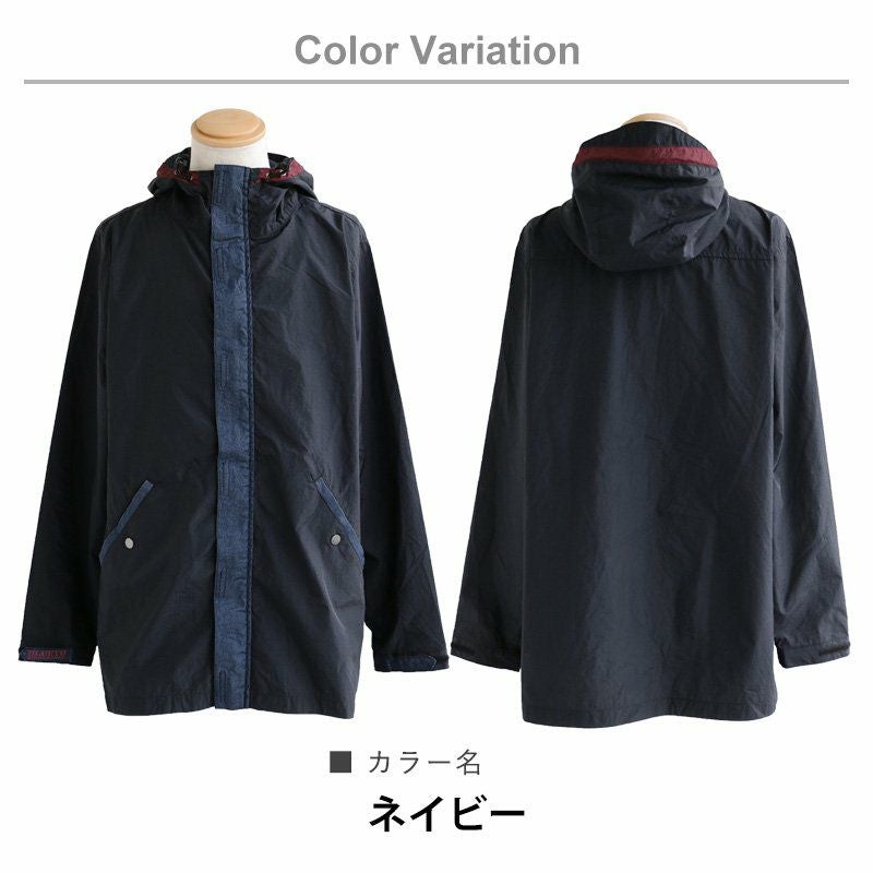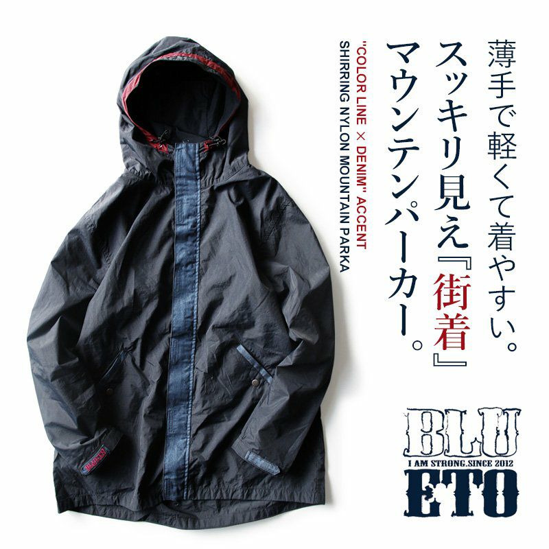 薄手で軽くて着やすい。スッキリ見え『街着』マウンテンパーカー マウンテンパーカー お尻が隠れる ロング丈 薄手 ハリ感 ナイロン 撥水 「デニム地 切り替え」 「配色 アクセント」 刺繍入り ベルクロ比翼 メンズ レディース40代 50代 BLUETO [ブルート]
