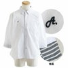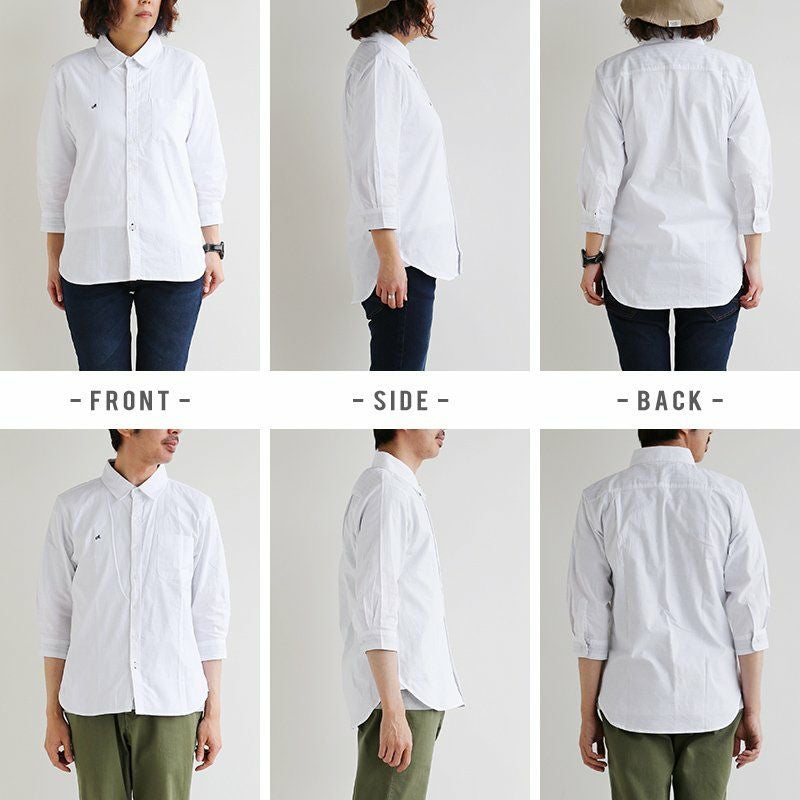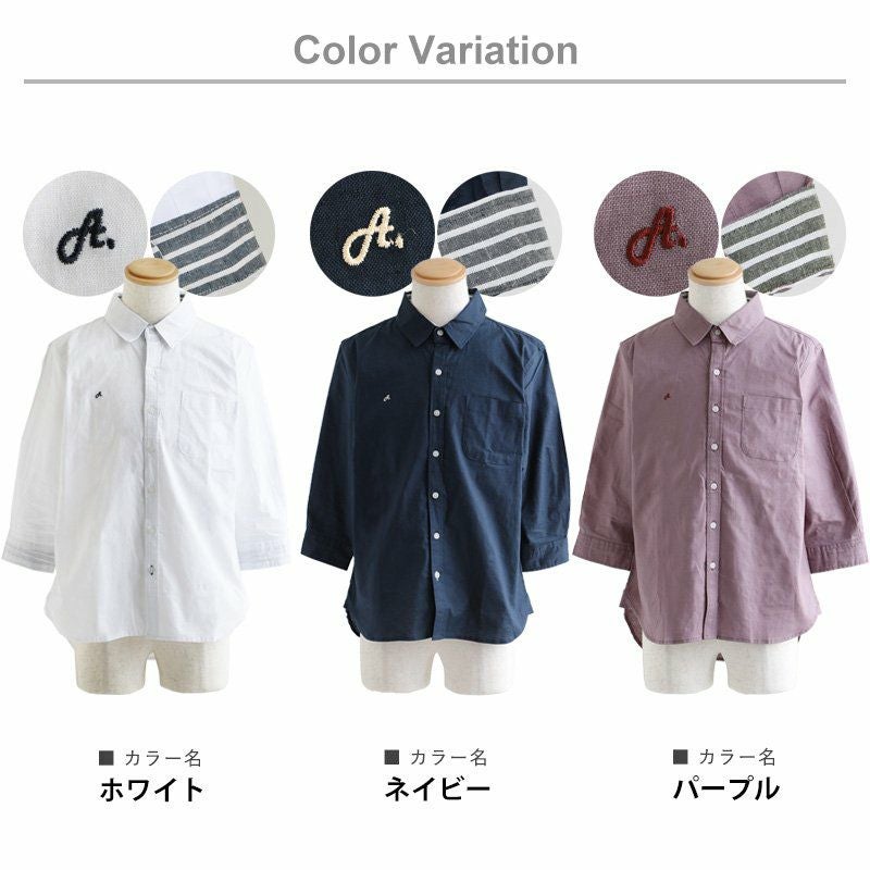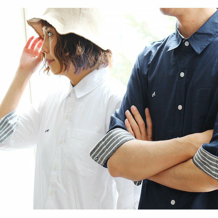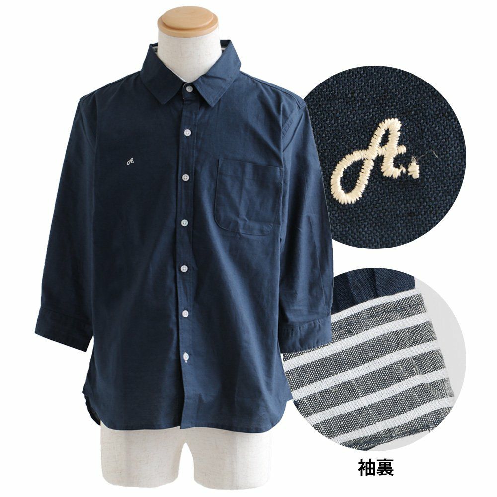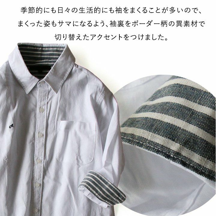 蒸す日もベタつかず、涼しく細見せ。 シャツ 七分袖 半端袖 袖裏 異素材 ストライプ 横使い 切り替え 綿麻 微ストレッチ オックス レギュラーカラー 涼しい 軽量 薄手 ワンポイント 配色 刺繍 メンズ レディース トップス 夏 40代 50代 ALISTAIR [アリステア]