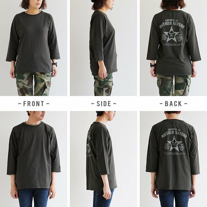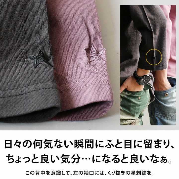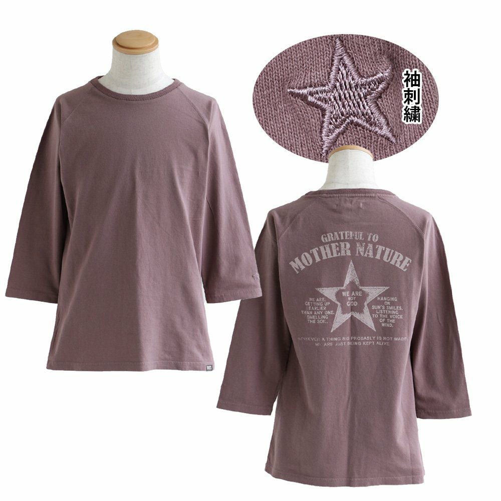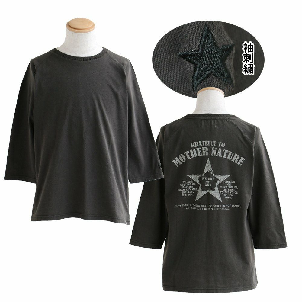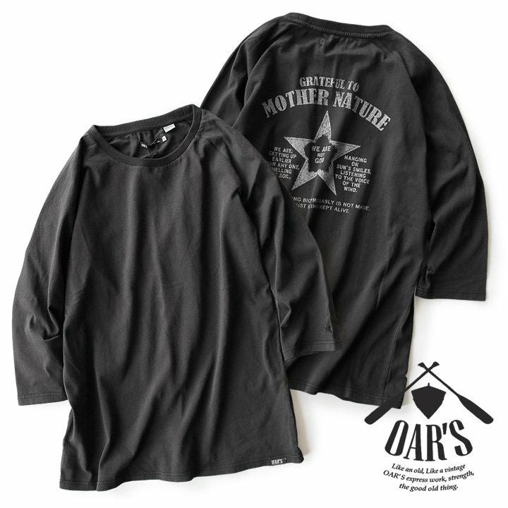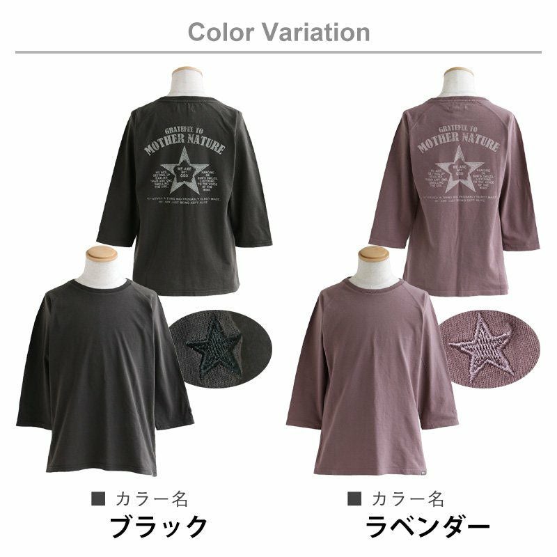 洗濯後も『ガシっ!と』タフ。ハマる色合い。見せたい背中。 Tシャツ ティーシャツ Tee カットソー 七分袖 7分袖 ラグラン 袖口 星刺繍 バック スタープリント 褪せ色 活性染め 綿100% ヘリンボーンリブ メンズ レディース 夏服 夏 夏物 重ね着 40代 50代 OAR'S [オールズ]