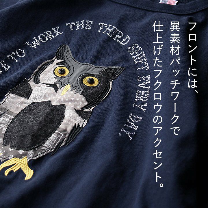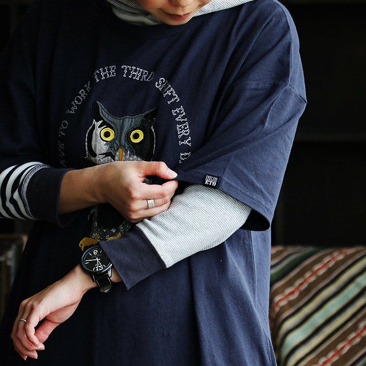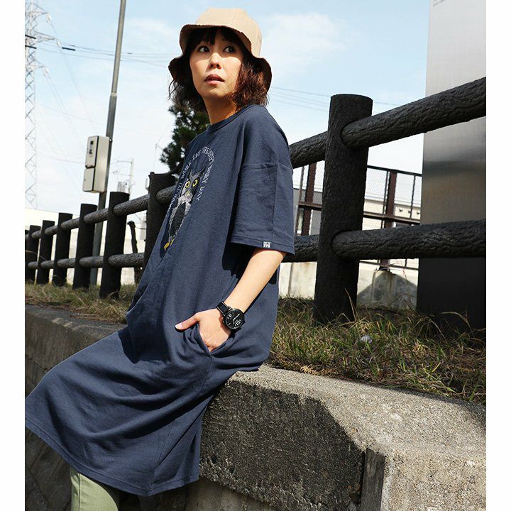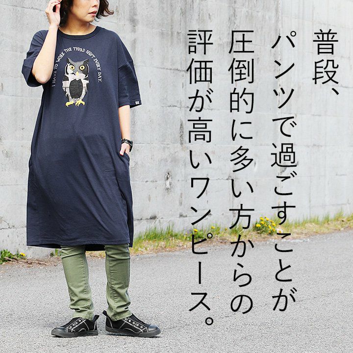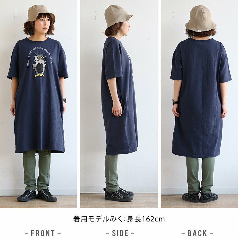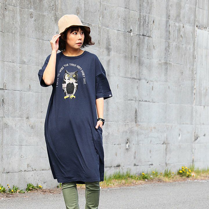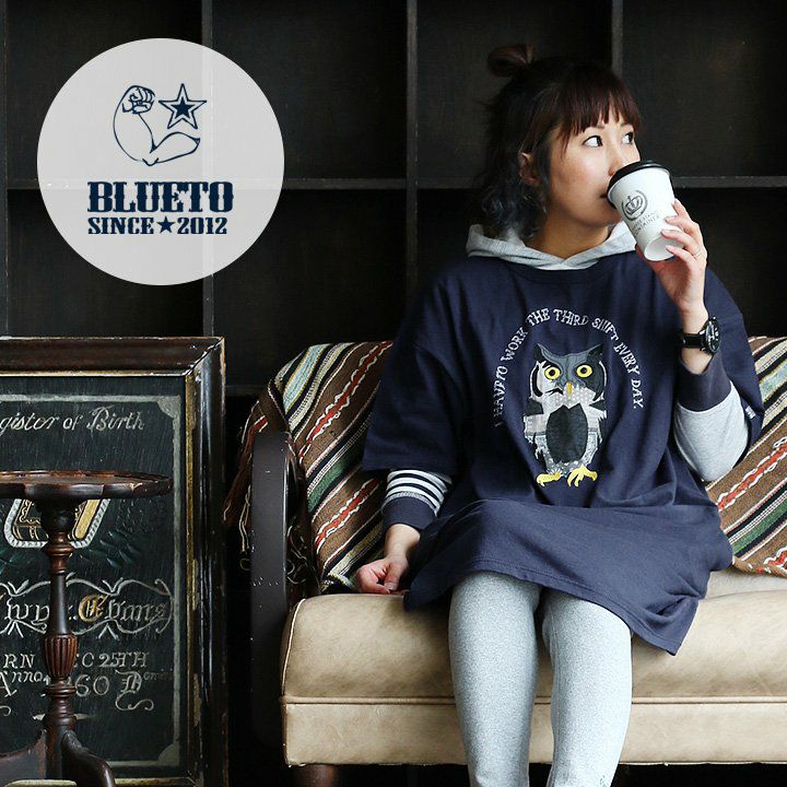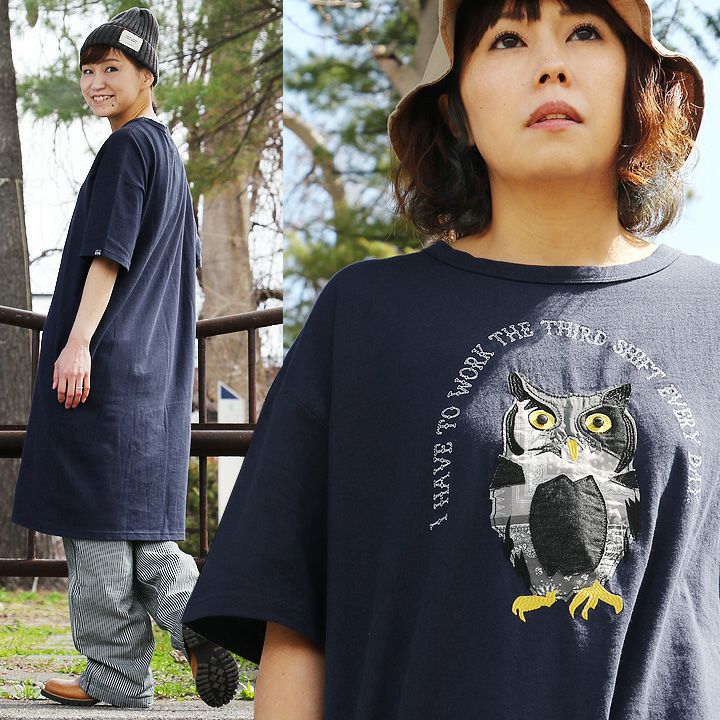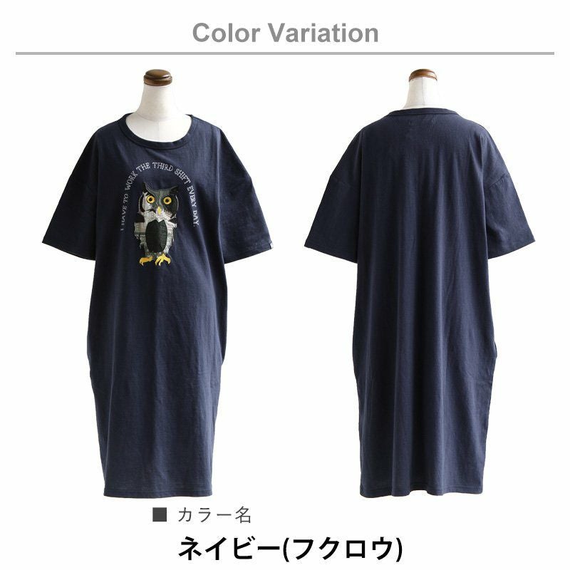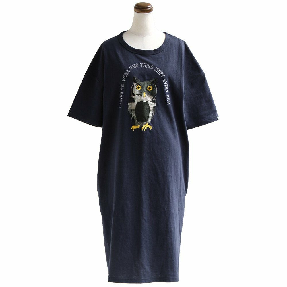 デニム好き、スキニー好きは、絶対このワンピ。 ワンピース ワンピ 半袖 ロング丈 マキシ丈 Tシャツワンピース Tシャツワンピ フクロウ パッチワーク 刺繍 インディゴ染め コットン 綿 レディース カジュアル アメカジ 40代 50代 BLUETO [ブルート]