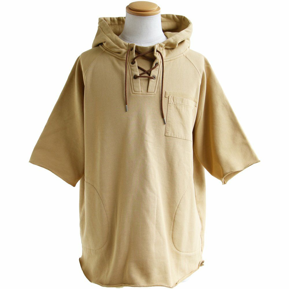 控えめなのに、他のどのパーカーよりも断トツの存在感。 パーカー プルオーバー 半袖 5分袖 裏毛 スウェット カシュクール ハイネック フード 「パッチワーク プリント」 メンズ レディース BLUETO [ブルート]