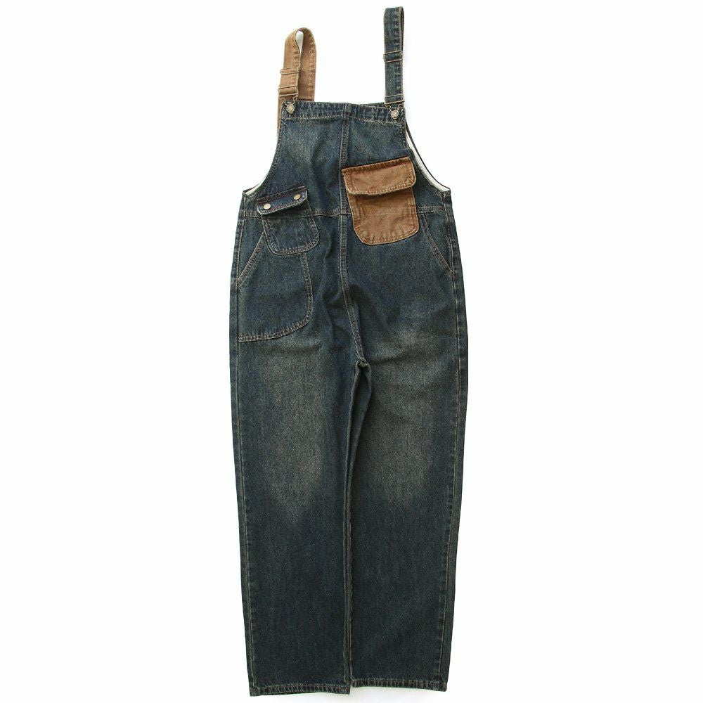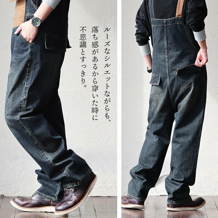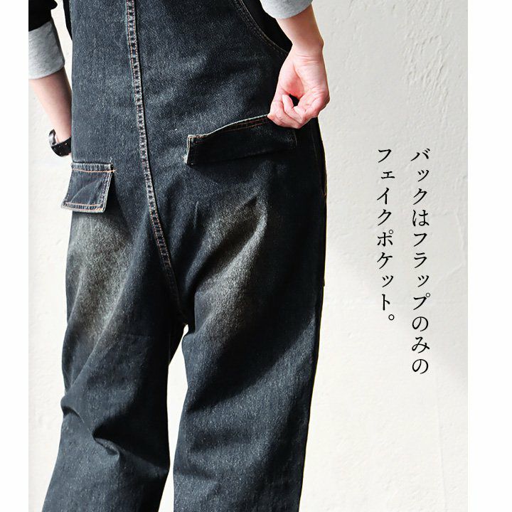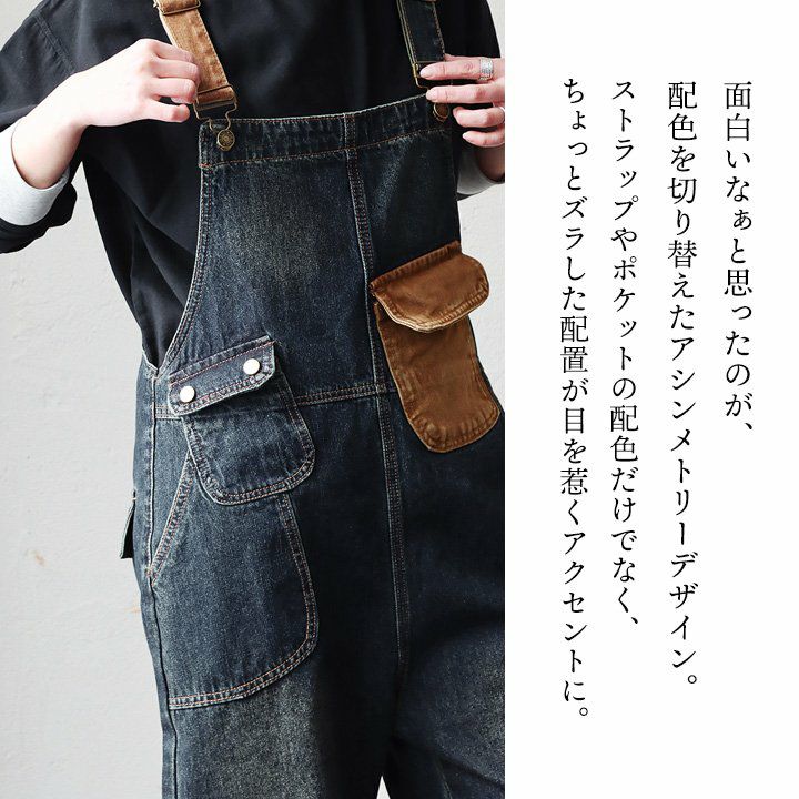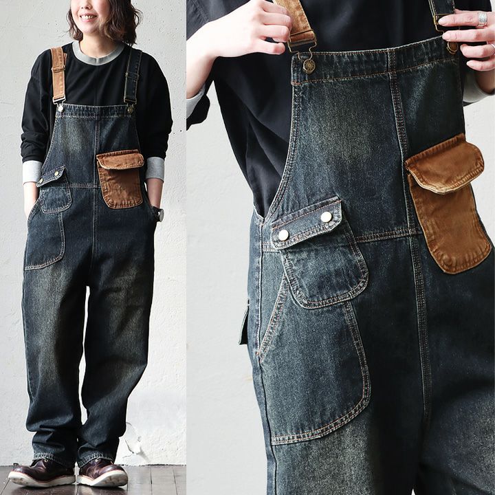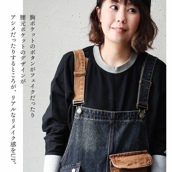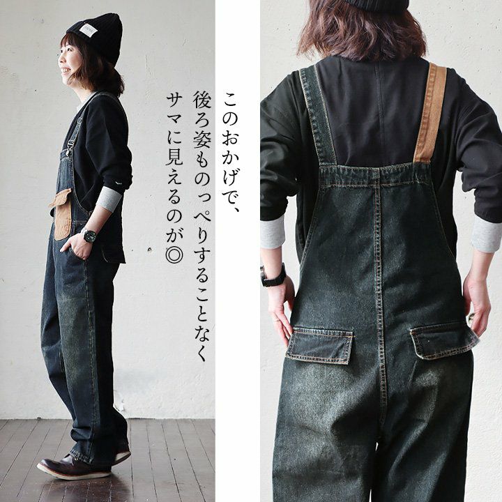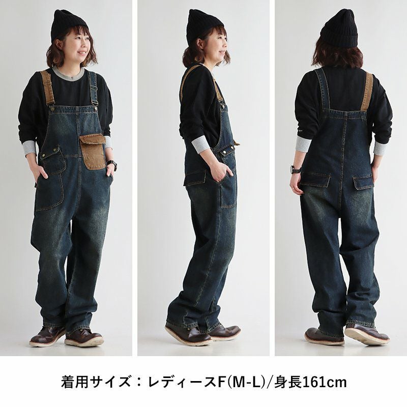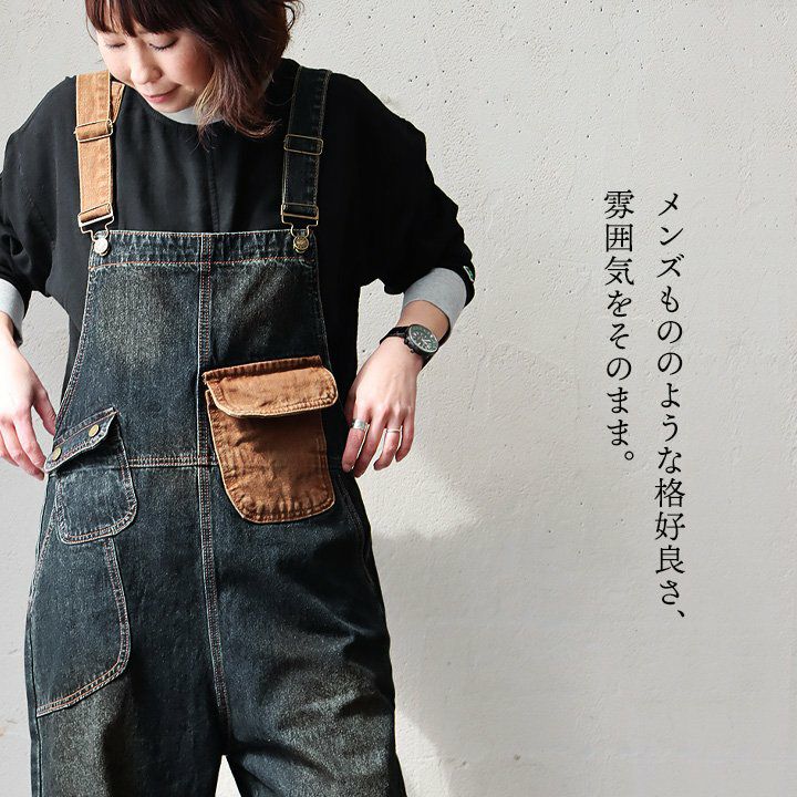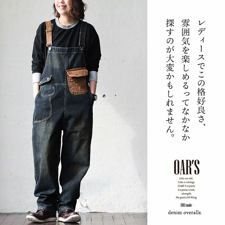 メンズもののような格好良さ、雰囲気をそのまま。 デニム サロペット レディース オーバーオール 綿100% しっかり 丈夫 ダメージ 配色切り替え ワイドシルエット ポケット ゆったり 大きいサイズ カジュアル ヴィンテージ ユーズドウォッシュ アメカジ パティ OAR’S オールズ