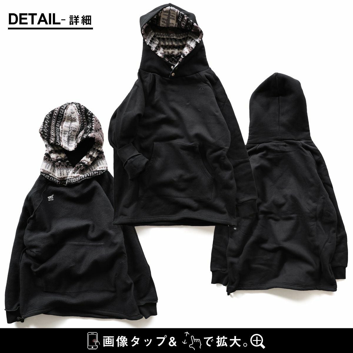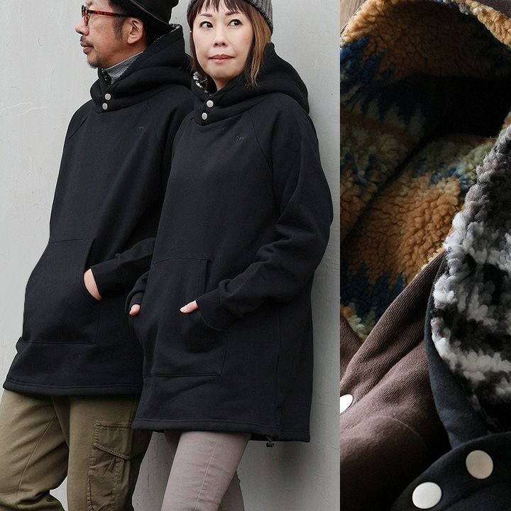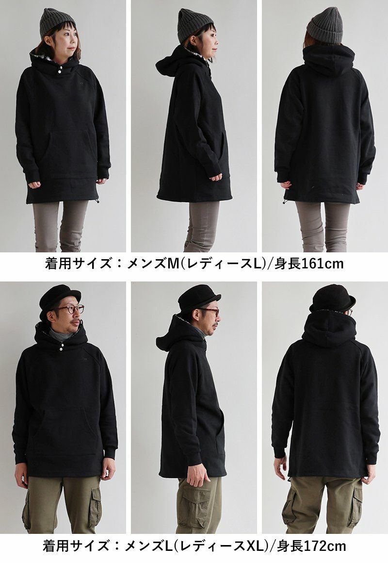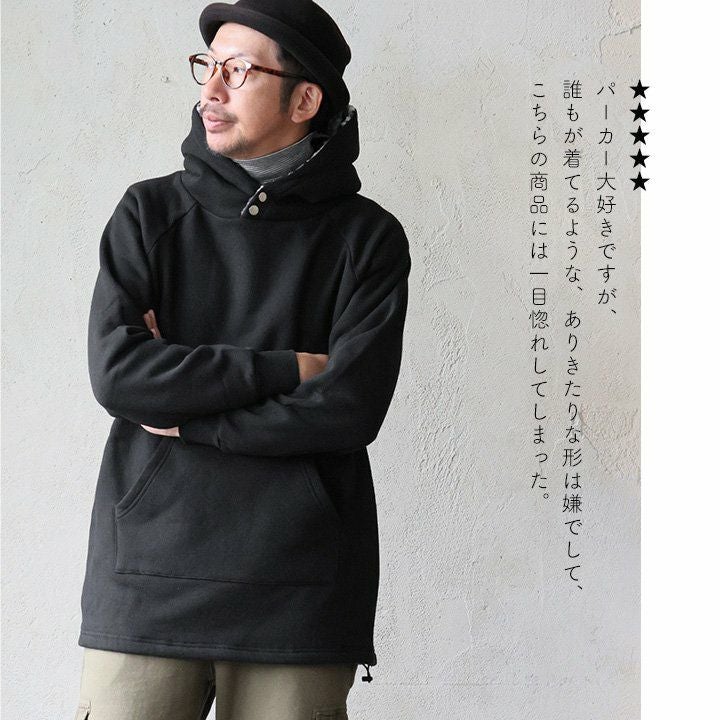 「崩れないネック」で魅せつつ、実は「着痩せ」が大本命。 パーカー メンズ レディース 着痩せ ロング丈 裏起毛 しっかり 丈夫 USAコットン 綿100% 14オンス 袖裾リブ ラグラン 長袖 裏ボア フード立つ 小顔効果 カシュクールネック プルオーバー ハイネック 裾ドローコード 黒 大きいサイズ パティ SAIL セイル