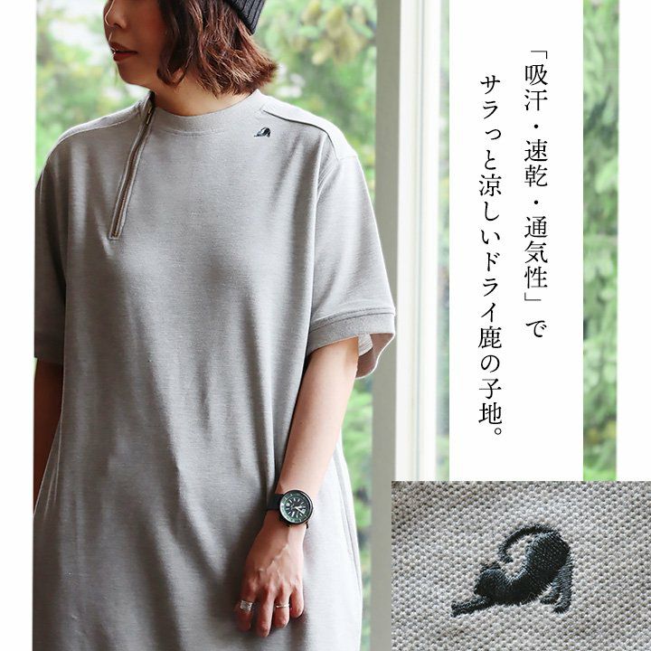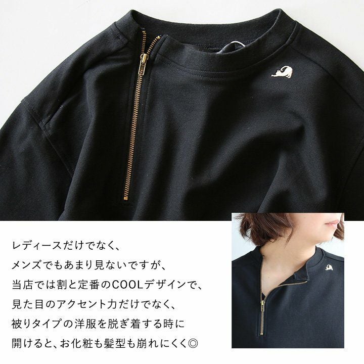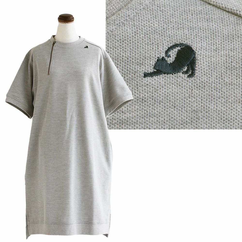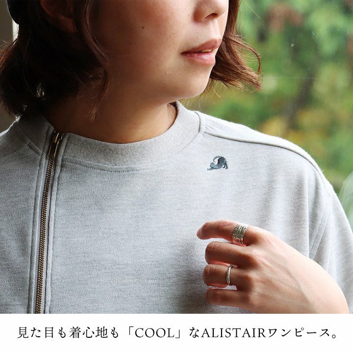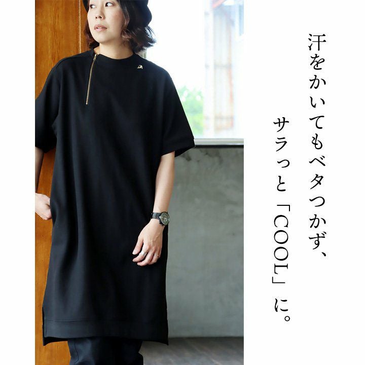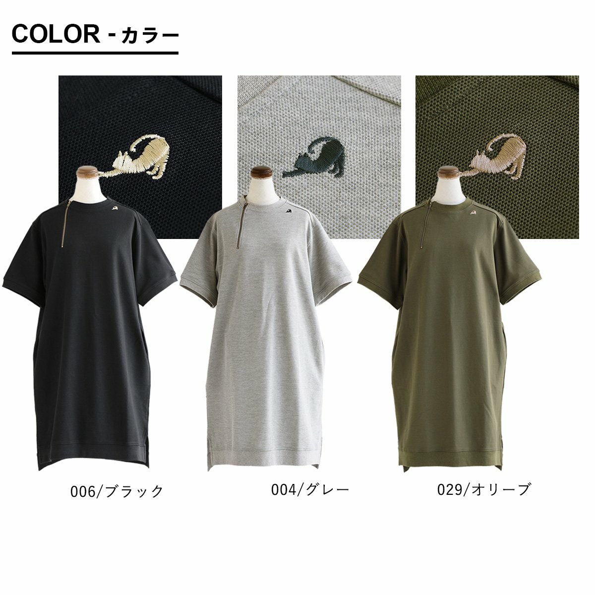 汗をかいてもベタつかず、サラっと「COOL」に。 ワンピ ワンピース 半袖 クルーネック 斜め ジップ 涼しい 夏 鹿の子 軽量 軽い 通気性 ドライ 速乾 かっこいい 紫外線対策 UV対策 ねこ 刺繍 リブ すっきり 着痩せ レディース ALISTAIR アリステア