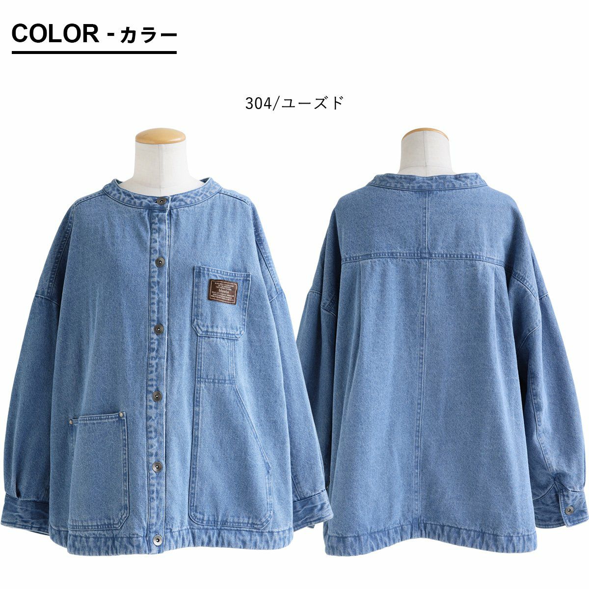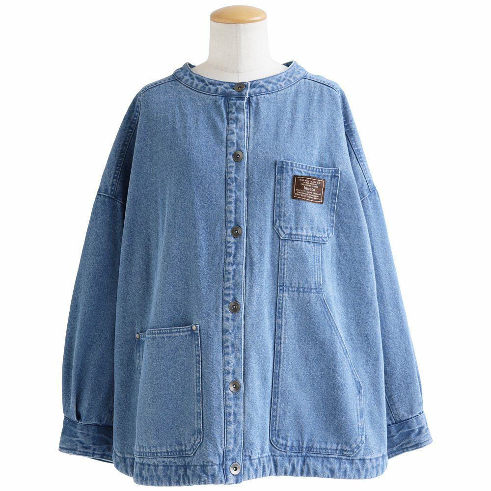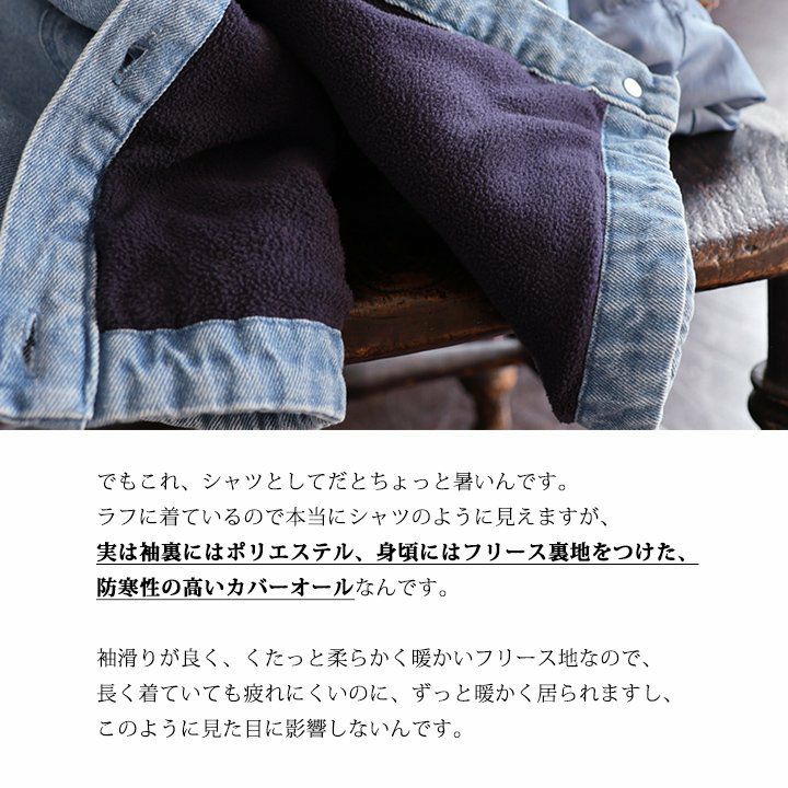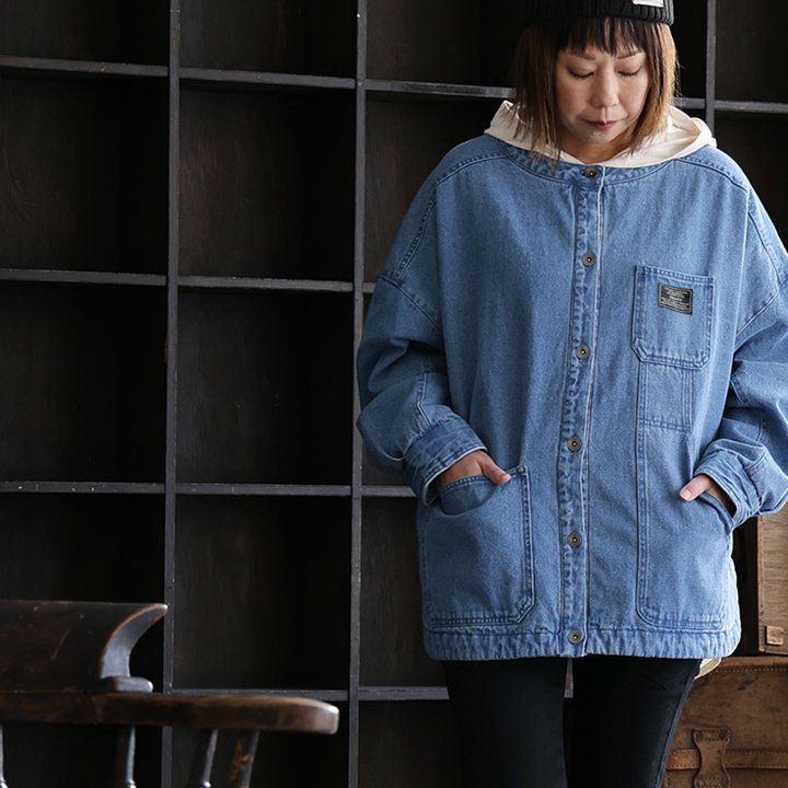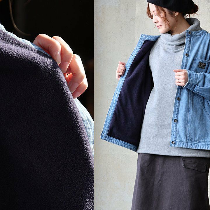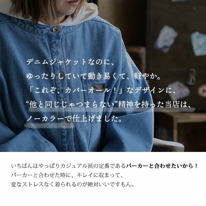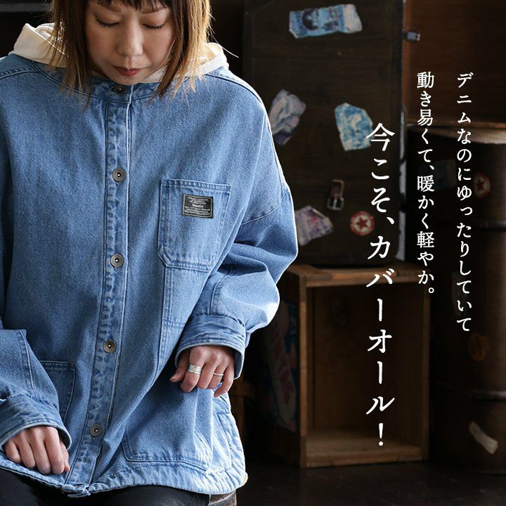 デニムなのにゆったりしていて動き易くて、暖かく軽やか。今こそ、カバーオール! デニムジャケット レディース 暖かい 裏フリース ワイド Gジャン 着痩せ すっきり ノーカラー 軽い 柔らか 綿100 コットン お尻 隠れ 体系 カバー ラウンドヘム ポケット 重ね着 ゆったり 大きめ カジュアル 大人 カジュアル パティ BLUETO ブルート