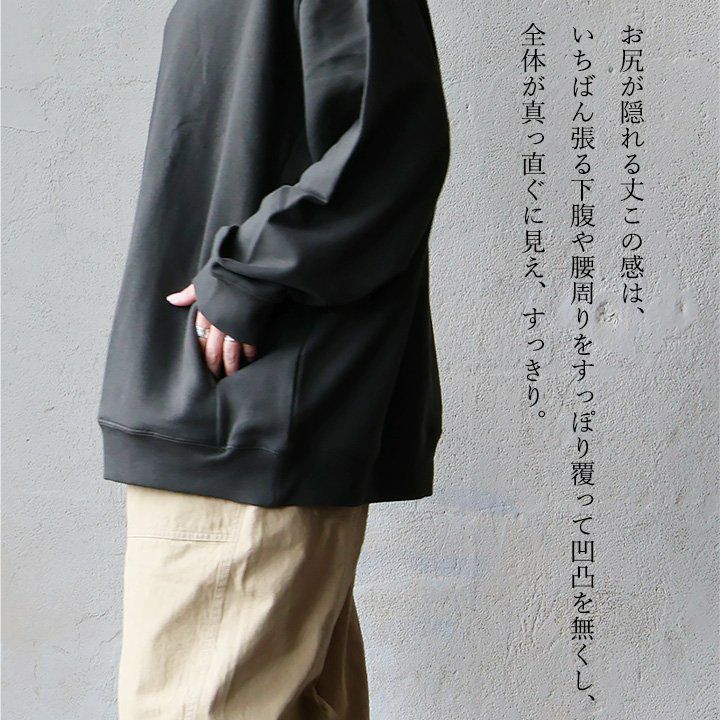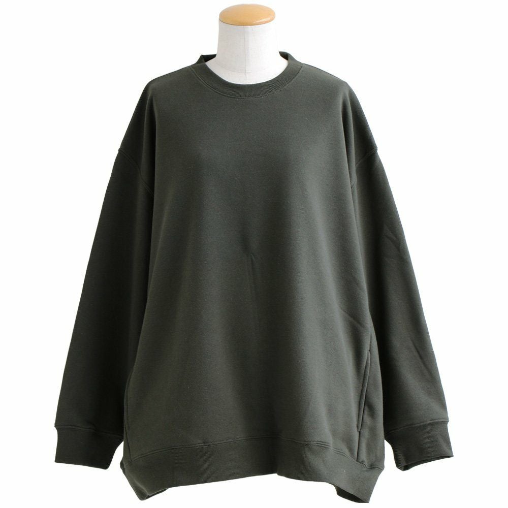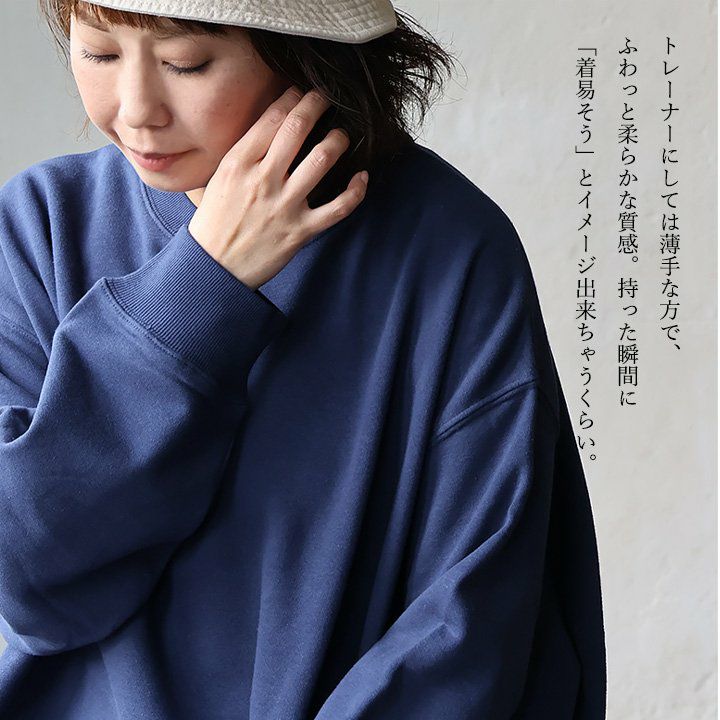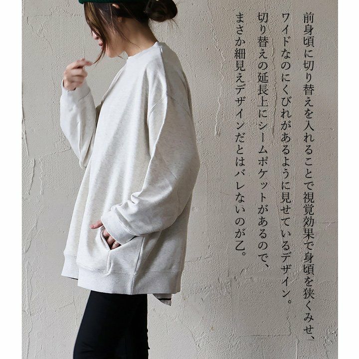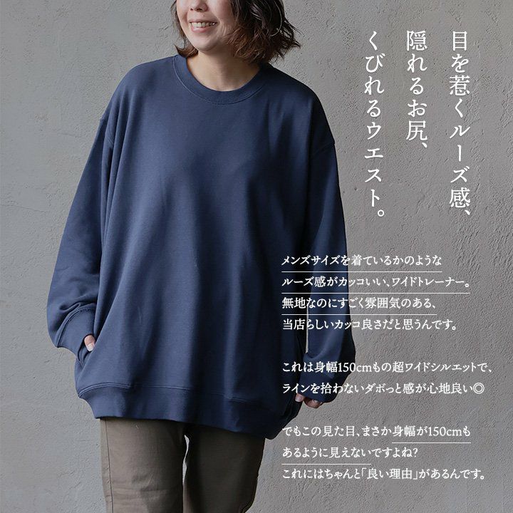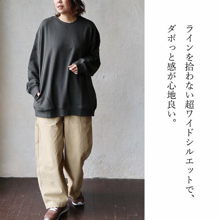 軽い着心地、目を惹くルーズ感、隠れるお尻。 トレーナー スウェット レディース クルーネック 着痩せ ワイド オーバーサイズ 裏毛 柔らか 軽い 綿100 コットン ポケット リブ カジュアル 体系 お尻 カバー 大きめ パティ TOneontoNE トーン