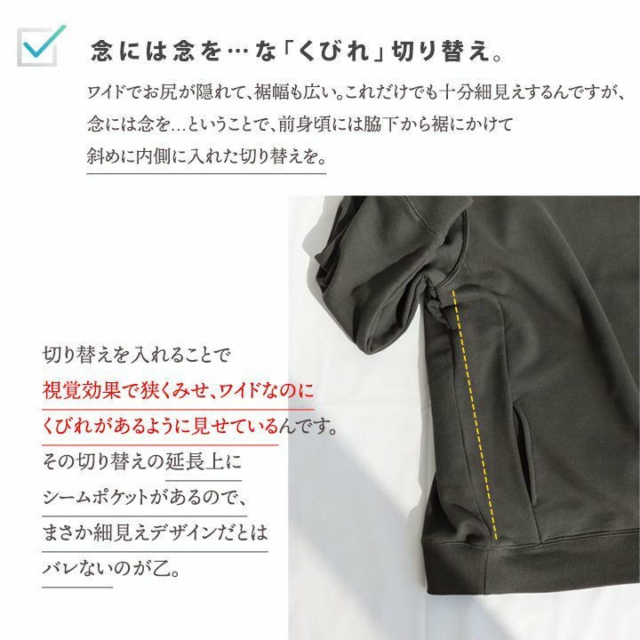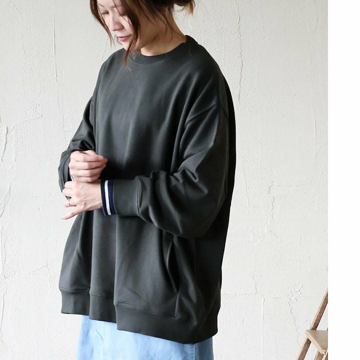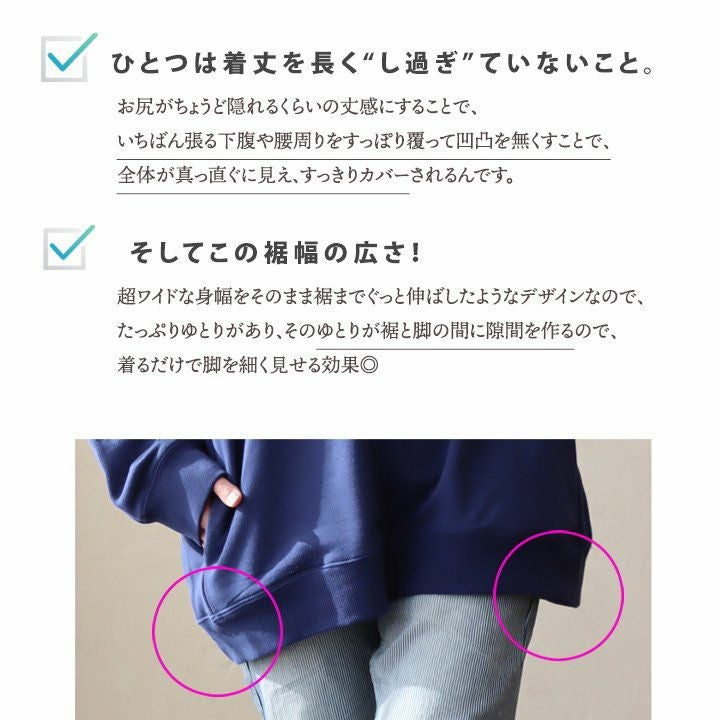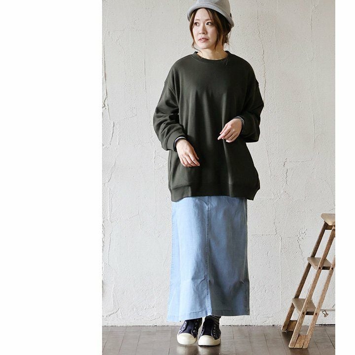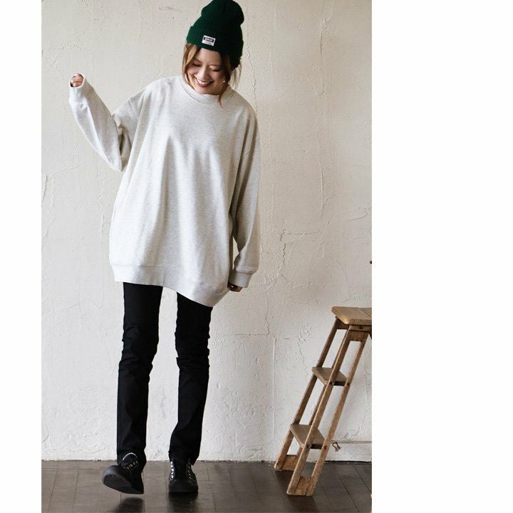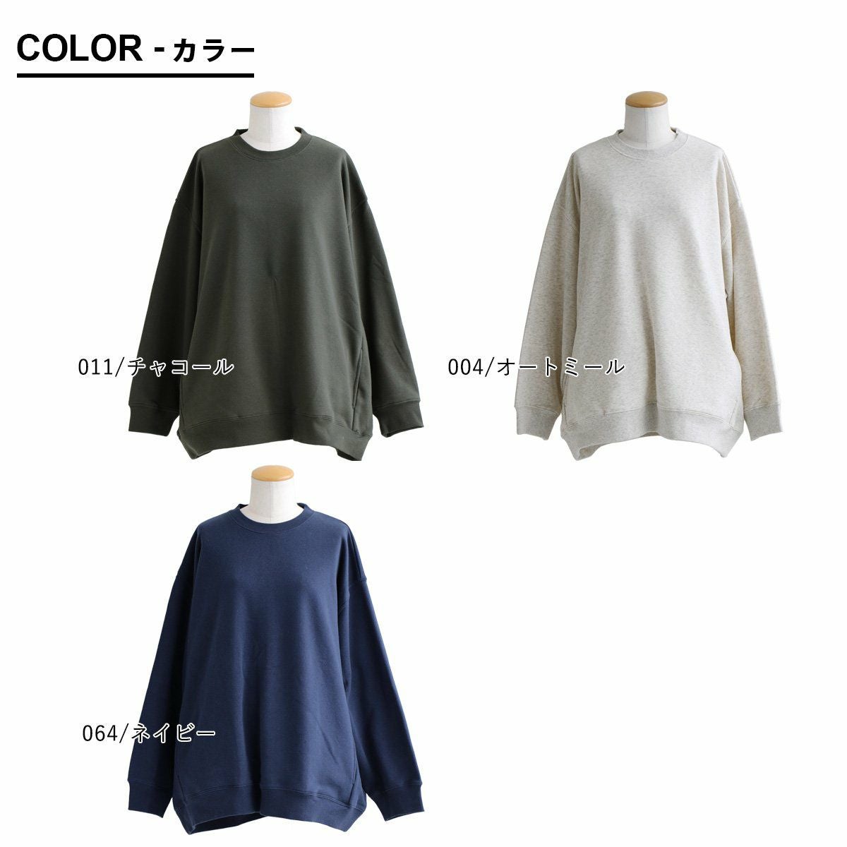 軽い着心地、目を惹くルーズ感、隠れるお尻。 トレーナー スウェット レディース クルーネック 着痩せ ワイド オーバーサイズ 裏毛 柔らか 軽い 綿100 コットン ポケット リブ カジュアル 体系 お尻 カバー 大きめ パティ TOneontoNE トーン